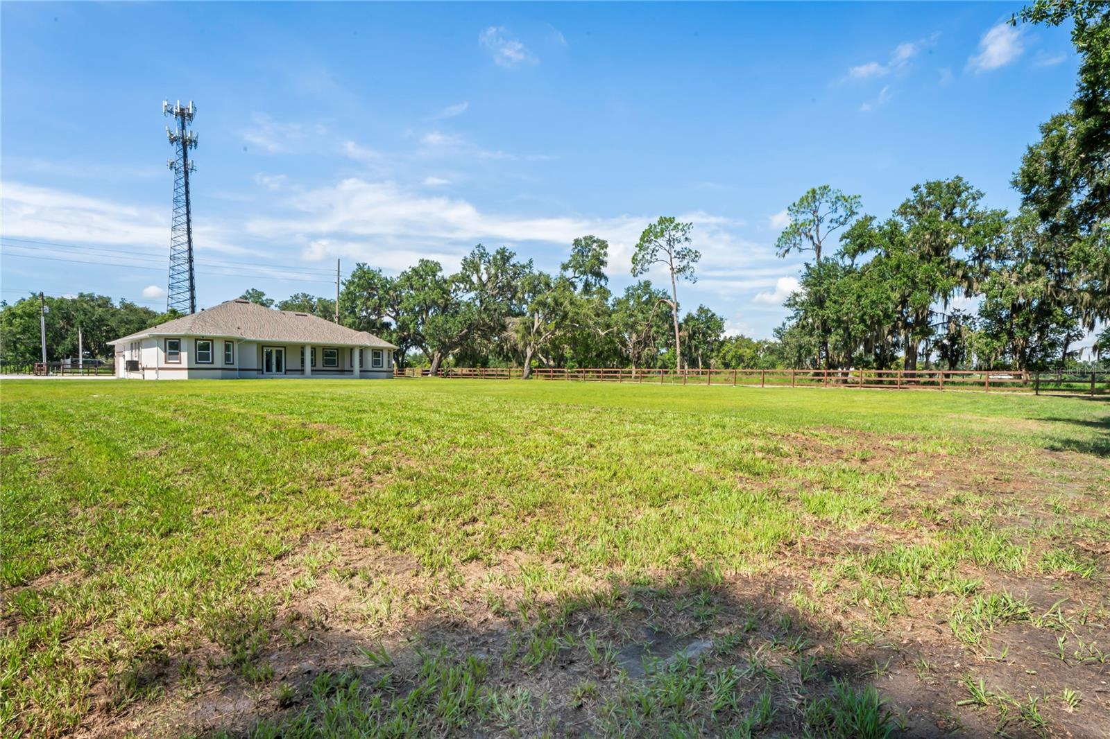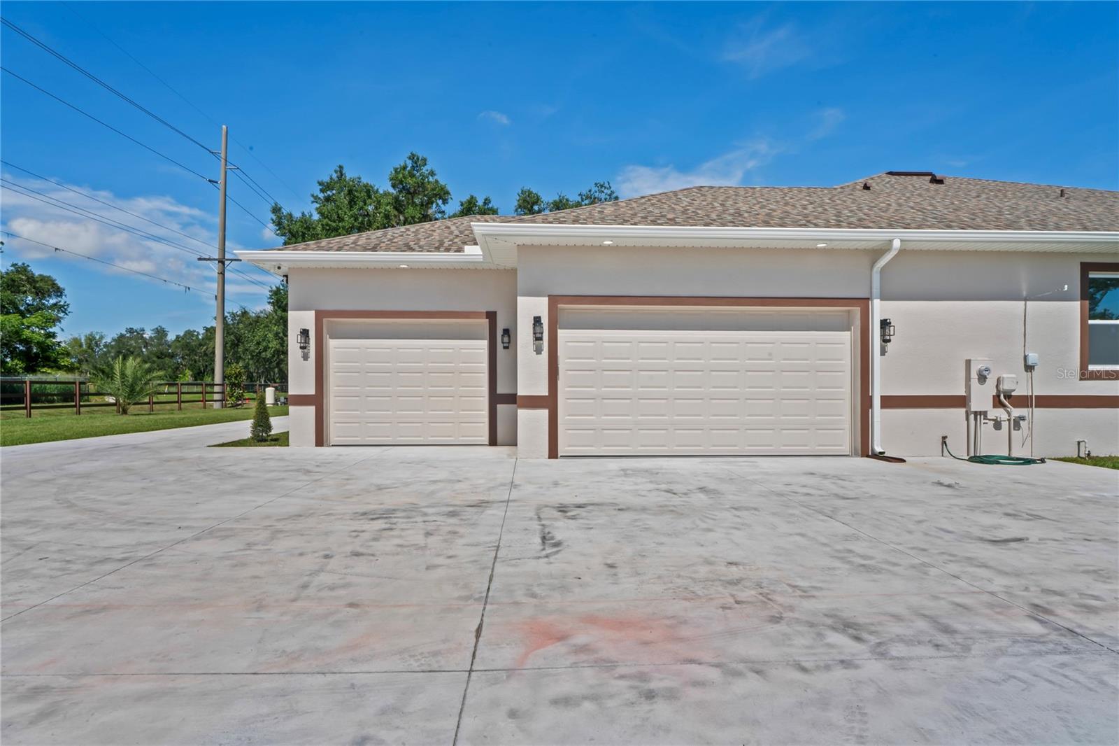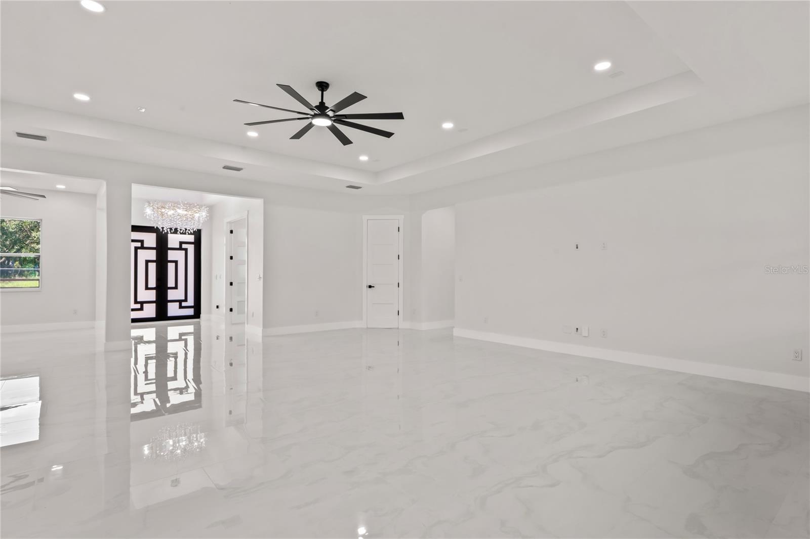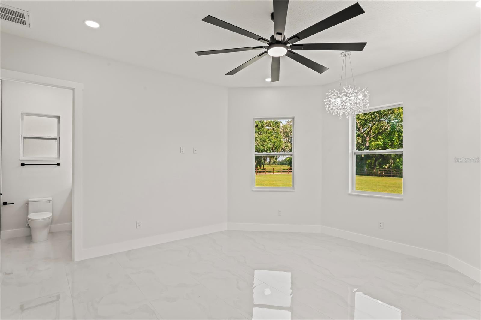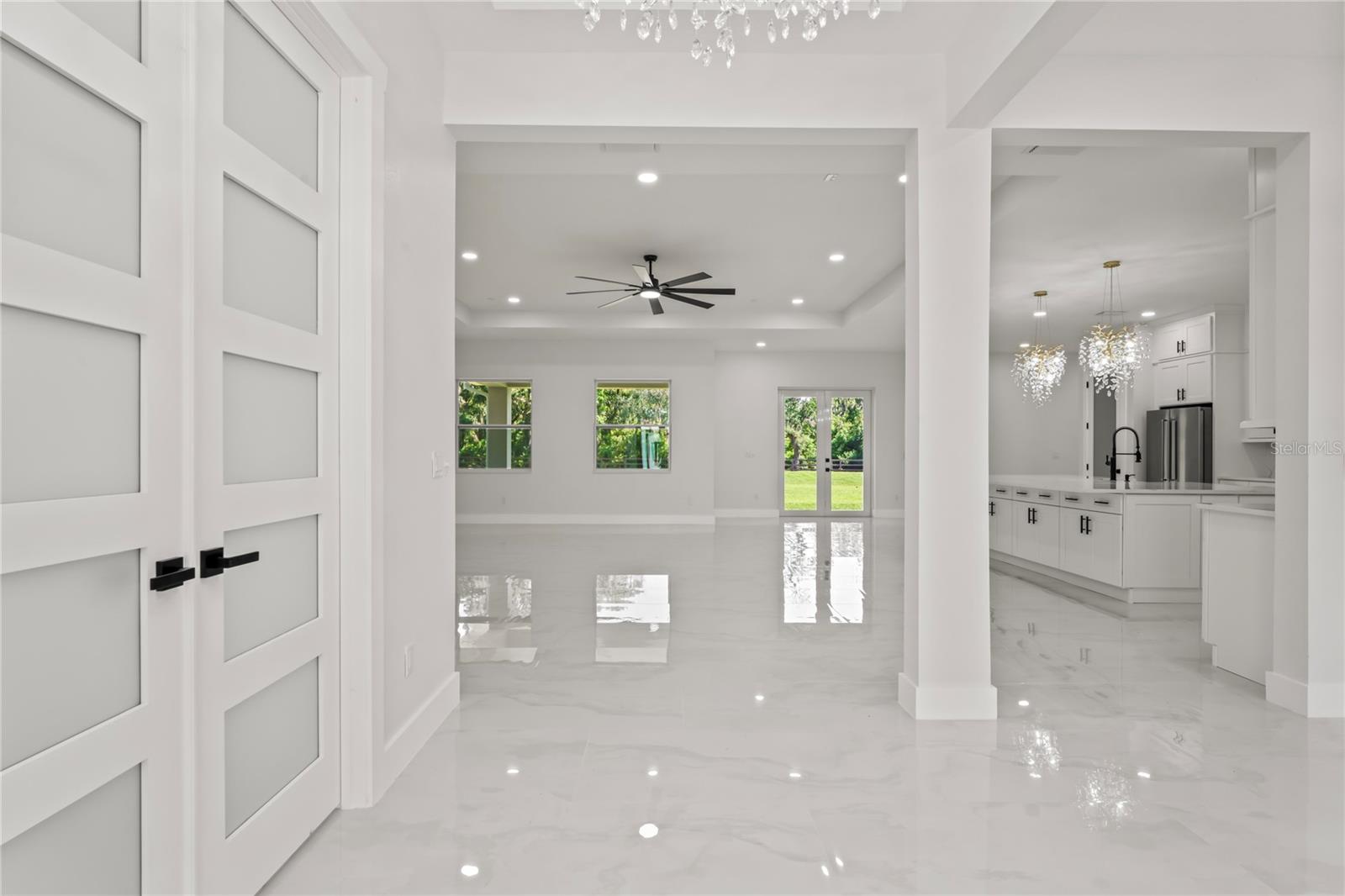 Welcome to Your Florida Home! Newly built in 2025, this stunning modern block home sits on a cleared, fully fenced 1.05-acre lot — beautifully sodded with lush grass, stately palm trees, and a few charming pines for that Florida touch. Step inside through an impressive 9-foot dual door entryway crowned with an elegant chandelier that welcomes you into over 4,600 total square feet of refined living space — including 3,375 sq ft under air with 4 spacious bedrooms and 3.5 luxurious baths. The expansive master suite is truly a private retreat featuring a large his-and-hers walk-in closet, a spa-like bathroom with double vanities, a soaking tub, and a stunning walkthrough triple shower. A second bedroom offers its own ensuite bathroom and walk-in closet, while two additional bedrooms share a convenient Jack-and-Jill bathroom layout — perfect for family or guests. Designed for entertaining, the open floor plan flows seamlessly from the formal living room to a dedicated office with built-in cabinetry, and into the grand family room and gourmet kitchen. The chef’s kitchen boasts an impressive 12’ x 6’ quartz island, extensive white cabinetry, and a complete set of premium KitchenAid stainless steel appliances, including a glass cooktop and sleek range hood. Outside, you’ll love the oversized 3-car garage and expansive wrap-around driveway, providing plenty of parking for family and guests. This is modern Florida living at its finest — spacious, stylish, and move-in ready!