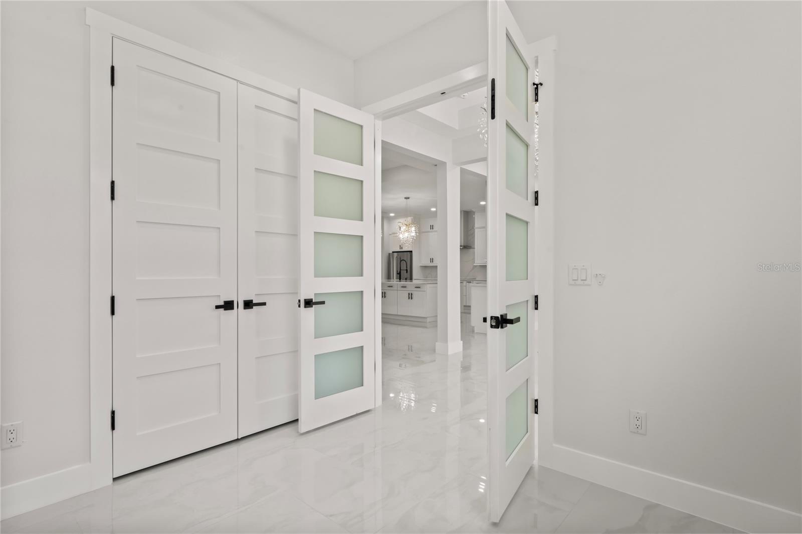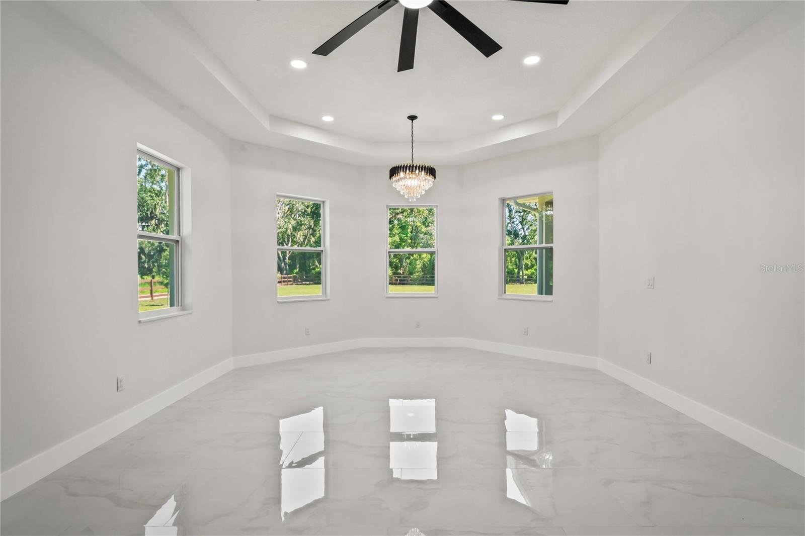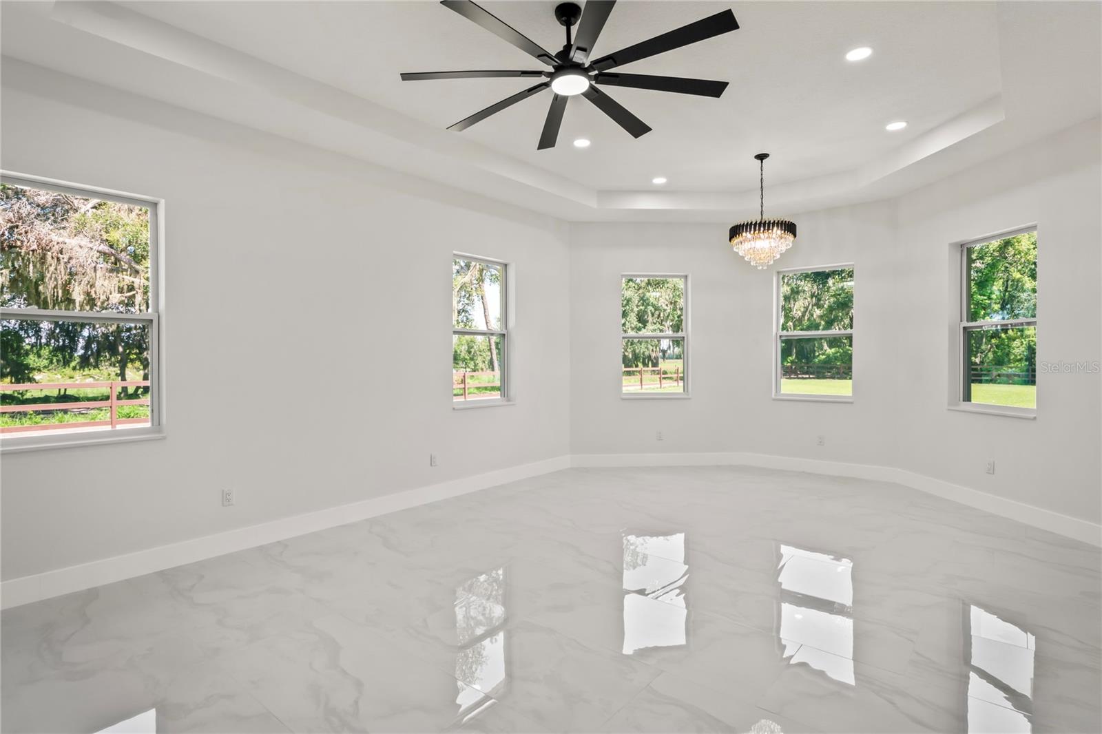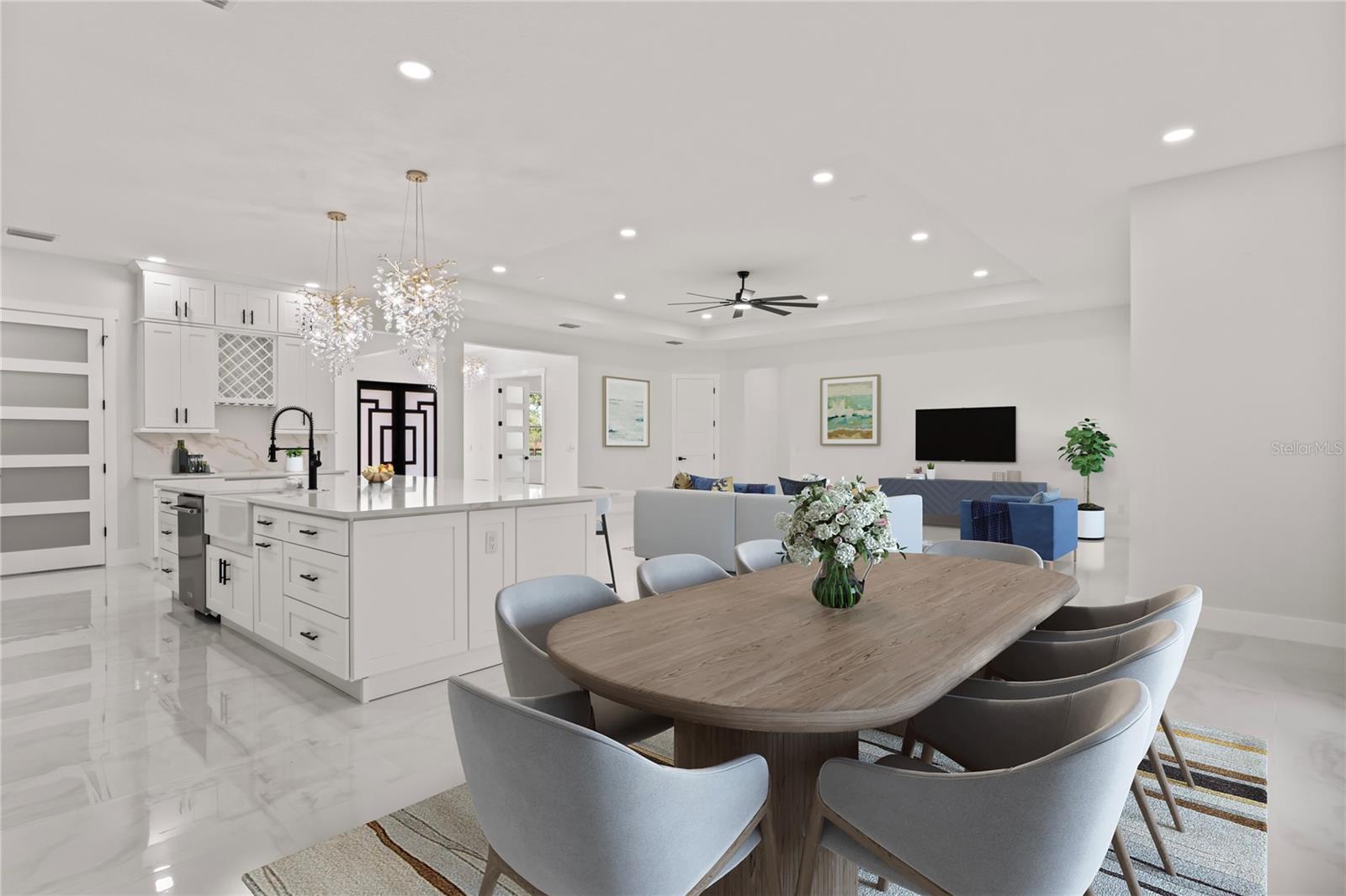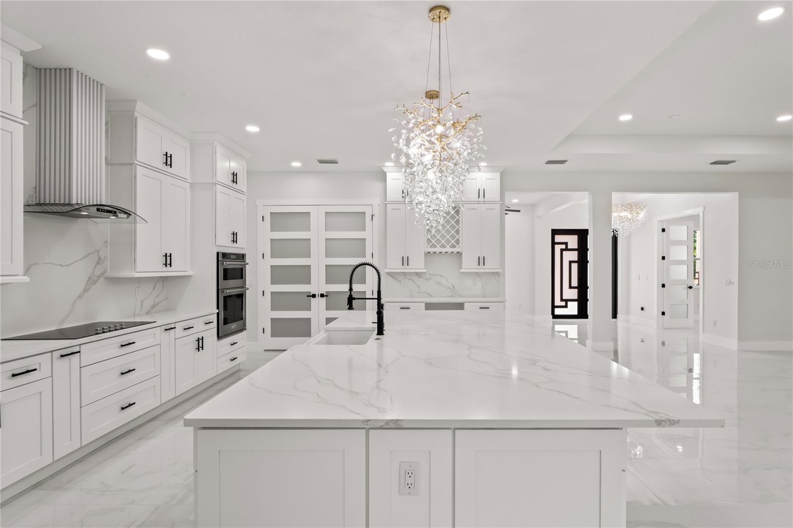 Welcome to Your Florida Home! Newly built in 2025, this stunning modern block home sits on a cleared, fully fenced 1.05-acre lot — beautifully sodded with lush grass, stately palm trees, and a few charming pines for that Florida touch. Step inside through an impressive 9-foot dual door entryway crowned with an elegant chandelier that welcomes you into over 4,600 total square feet of refined living space — including 3,375 sq ft under air with 4 spacious bedrooms and 3.5 luxurious baths. The expansive master suite is truly a private retreat featuring a large his-and-hers walk-in closet, a spa-like bathroom with double vanities, a soaking tub, and a stunning walkthrough triple shower. A second bedroom offers its own ensuite bathroom and walk-in closet, while two additional bedrooms share a convenient Jack-and-Jill bathroom layout — perfect for family or guests. Designed for entertaining, the open floor plan flows seamlessly from the formal living room to a dedicated office with built-in cabinetry, and into the grand family room and gourmet kitchen. The chef’s kitchen boasts an impressive 12’ x 6’ quartz island, extensive white cabinetry, and a complete set of premium KitchenAid stainless steel appliances, including a glass cooktop and sleek range hood. Outside, you’ll love the oversized 3-car garage and expansive wrap-around driveway, providing plenty of parking for family and guests. This is modern Florida living at its finest — spacious, stylish, and move-in ready!