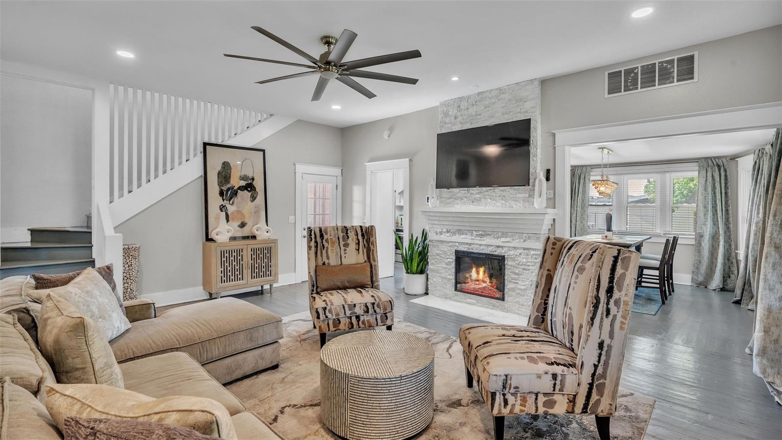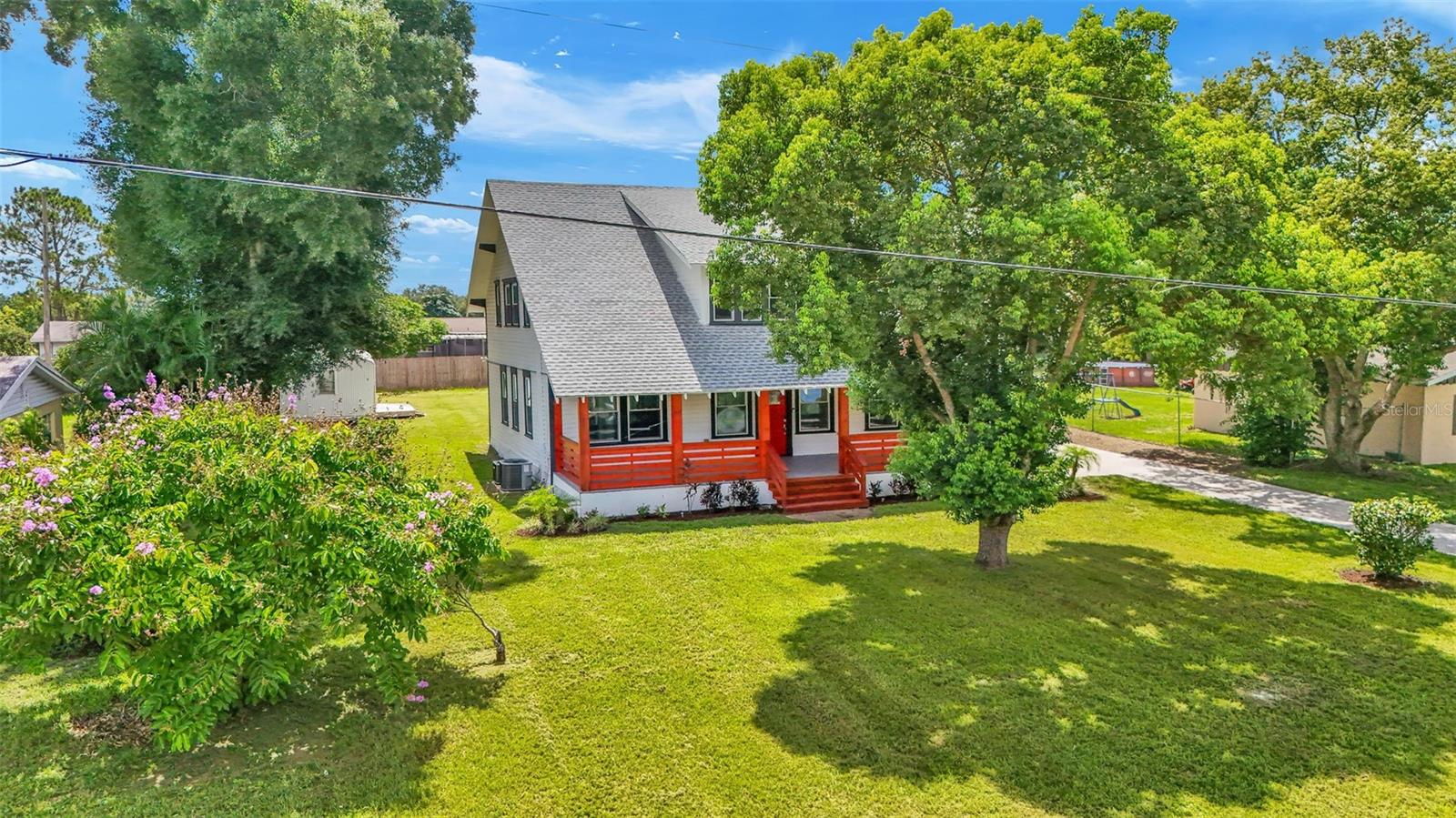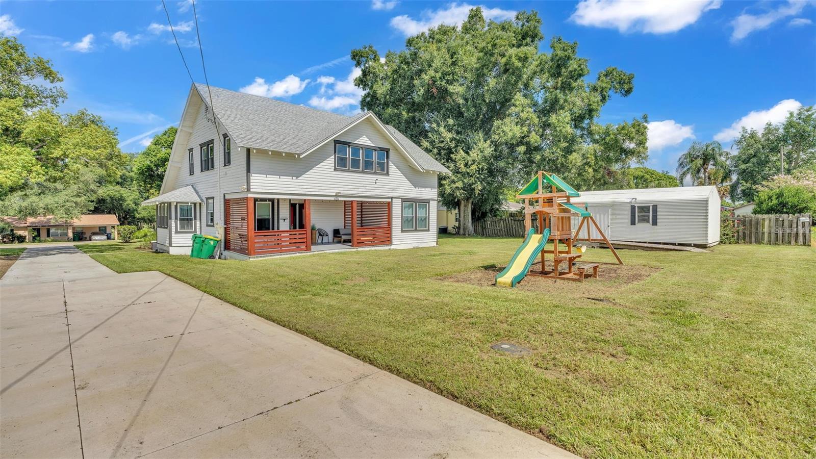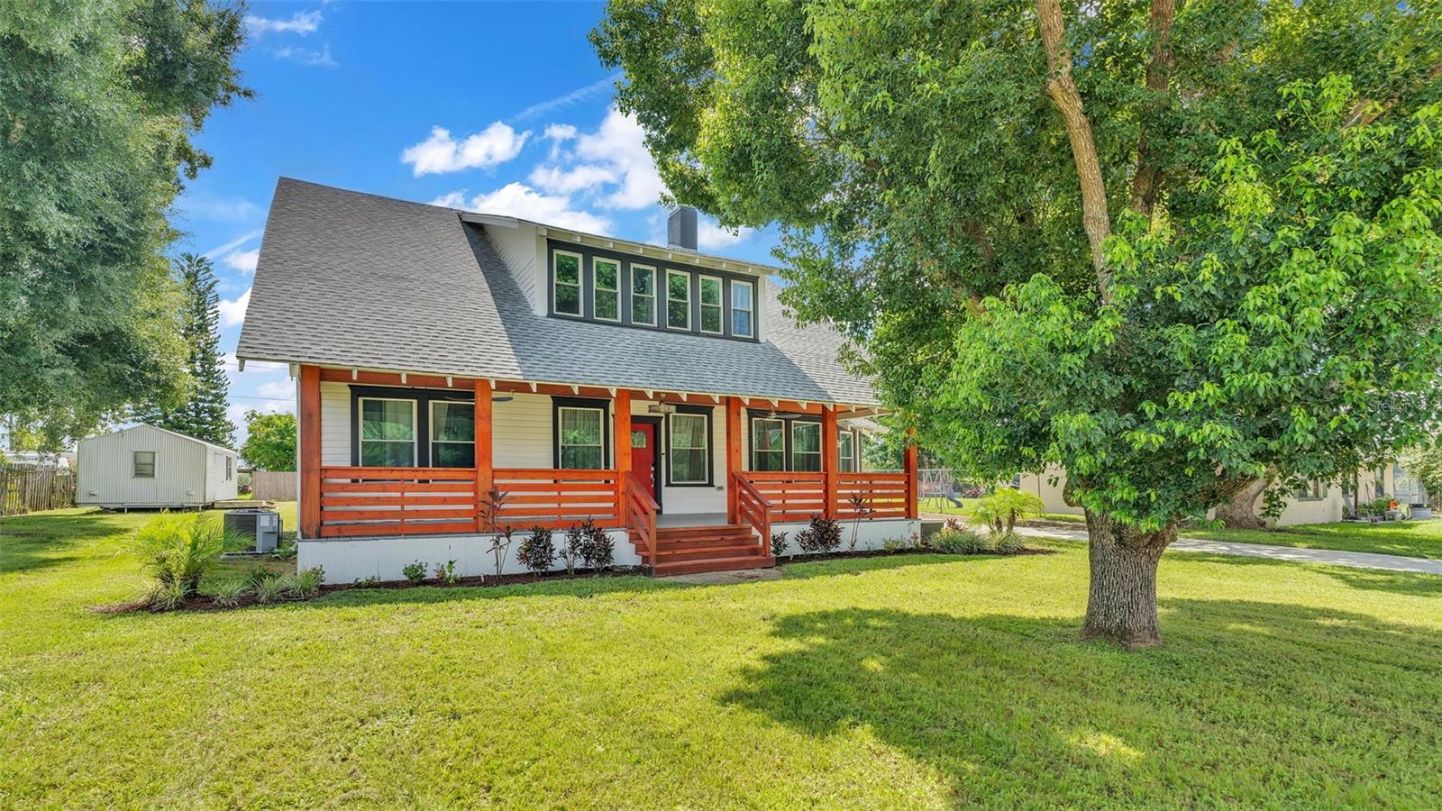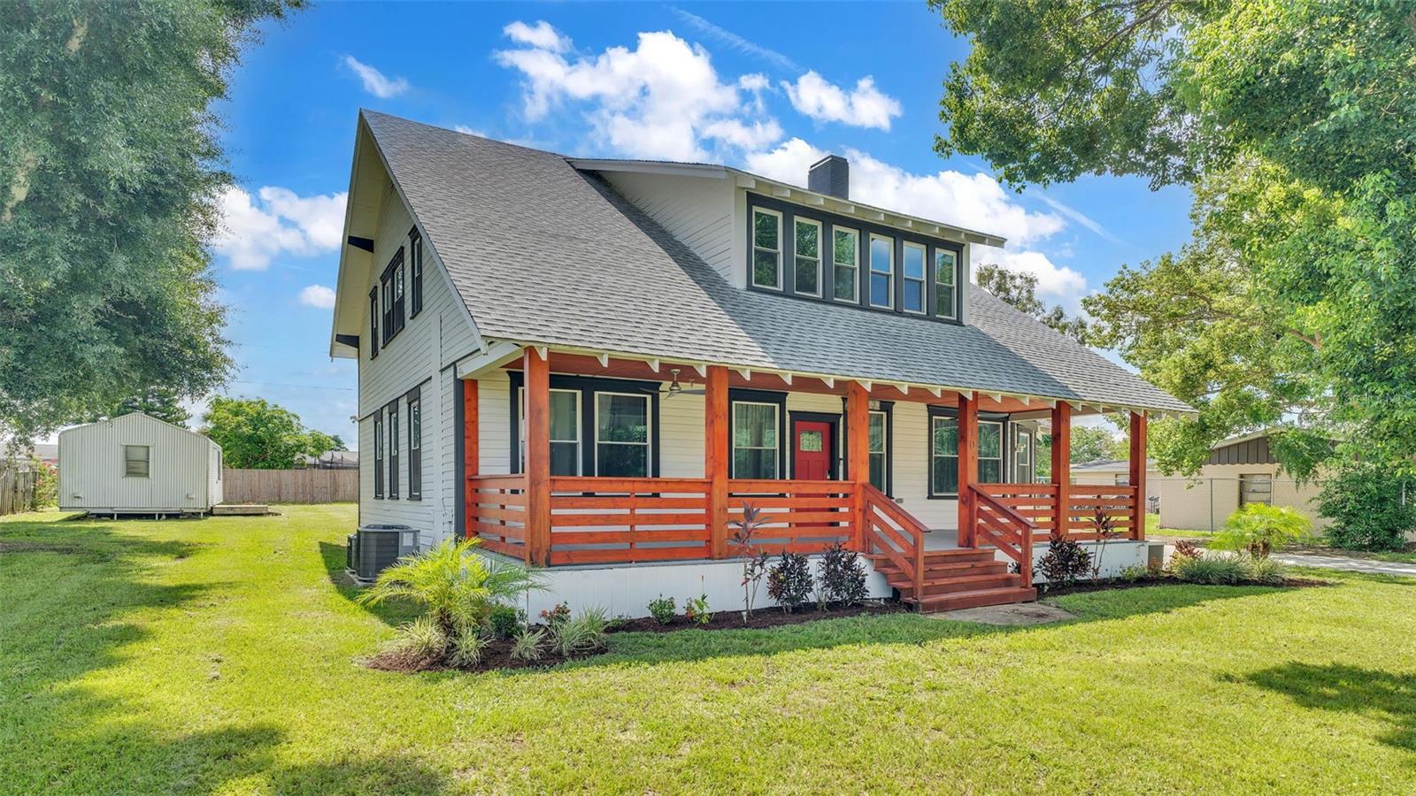 Welcome to this classic 19th century home located in the heart of Dundee, Florida. Originally built in 1925 and lovingly updated through the century, the structure’s recent renovation ensures access to all of your modern amenities. This 0.32 acre property perfectly balances the unique tastes of the past with the needs of the contemporary throughout its 5 bedroom and 2 bathroom layout. You’ll first be greeted by a sprawling covered porch which spans the front of the home, offering plenty of space to enjoy the outdoors with friends and family. Through the entryway is the spacious living room complete with a stone-accented electric fireplace and original hardwood floors, a feature consistent throughout the home. This living space flows flawlessly into every other feature of the home, including two bedrooms and the marble-tiled bathroom that reside on the first floor. From here you can move seamlessly to the dining room and adjoining kitchen where beautifully integrated granite countertops await the preparation of your next family meal. The backsplash adds an elegant touch with windows that overlook the back and side yard. The second floor of the home is equally impressive, boasting three bedrooms and a sunroom, the perfect additional space to meet your particular needs. The largest of these sleeping spaces sports a second electric fireplace for an ambient flare, and each is equipped with a generously sized walk-in closet for storage. The primary bedroom is flanked by the second floor bathroom, which matches the first in a modern marbled style. Every space is rich with natural lighting provided through an abundance of new window furnishings. At the rear of the first floor stands a second covered porch. Here you can appreciate the back yard, a wide and spacious play space that is sure to bring family and friends together. Finally, the long driveway that stretches alongside the property ensures that convenient parking is always available to do just that. This historic home is one of rare and expansive design, making it a dream residence for families both small and large alike. This home is conveniently located just minutes from downtown Dundee and access to Highway 27. Schedule your tour today to see all of the recent updates and everything this stunning and most charming home has to provide!