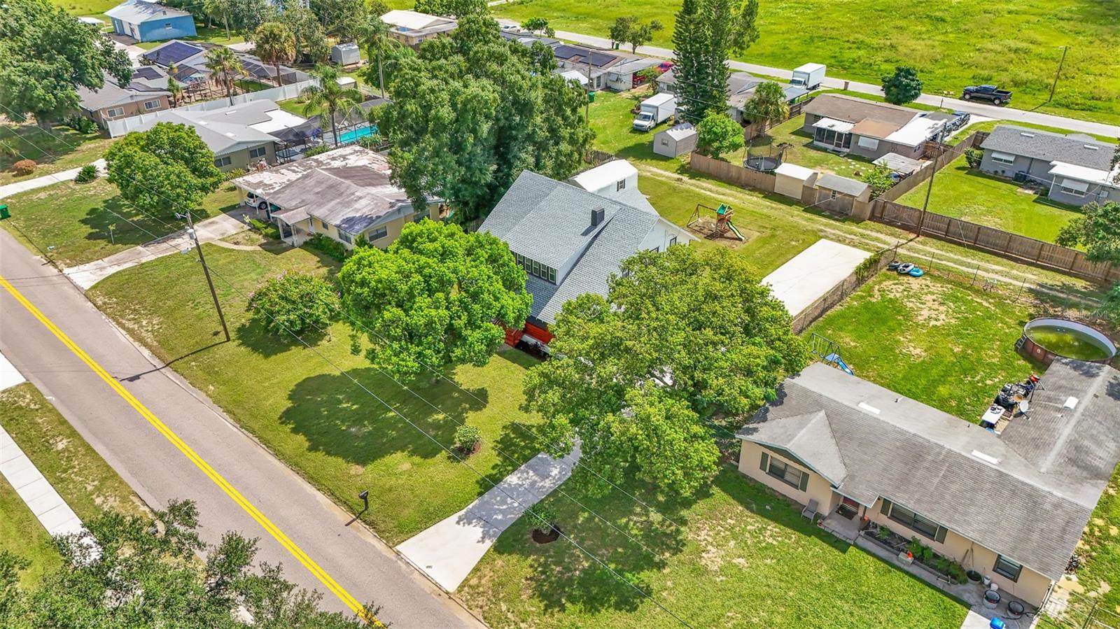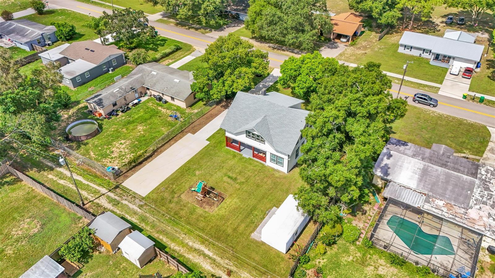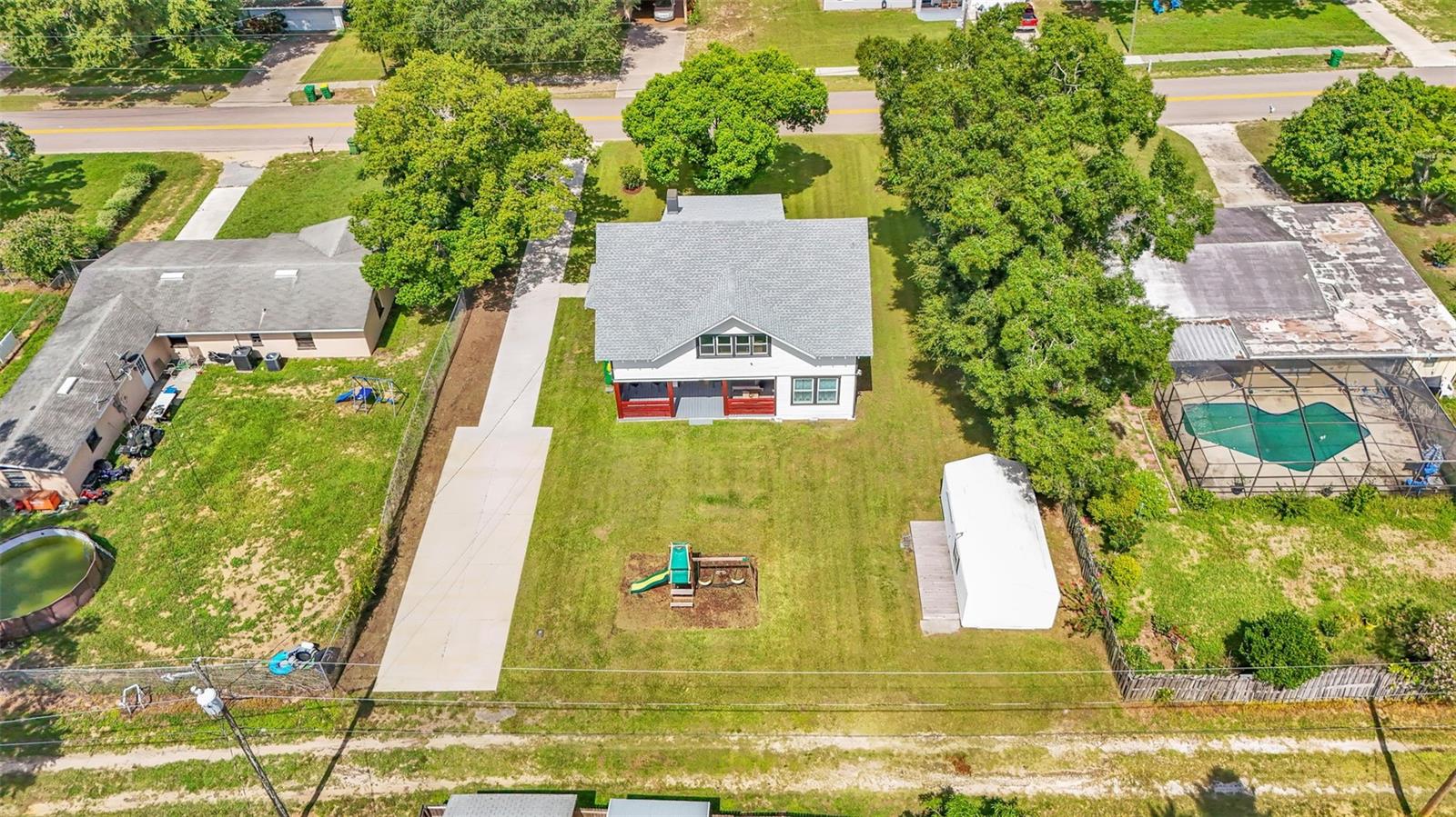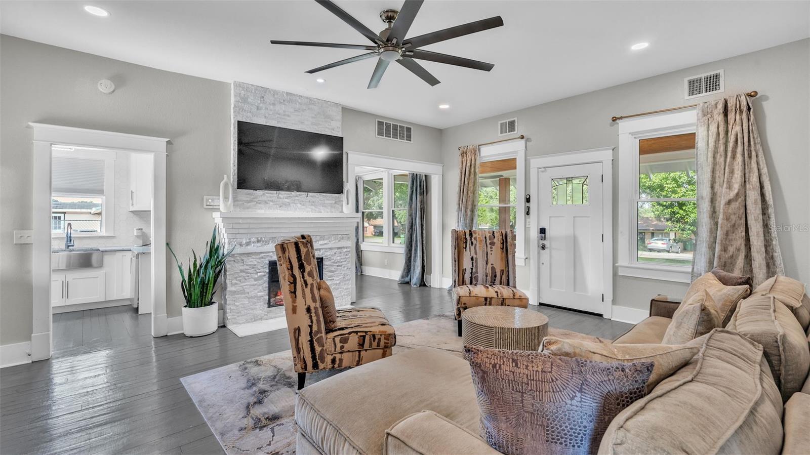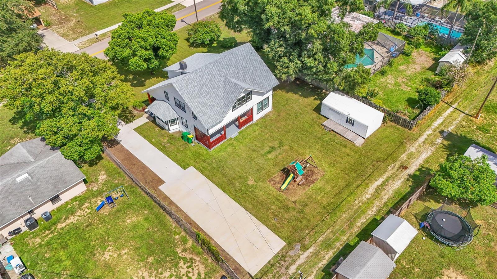 Welcome to this classic 19th century home located in the heart of Dundee, Florida. Originally built in 1925 and lovingly updated through the century, the structure’s recent renovation ensures access to all of your modern amenities. This 0.32 acre property perfectly balances the unique tastes of the past with the needs of the contemporary throughout its 5 bedroom and 2 bathroom layout. You’ll first be greeted by a sprawling covered porch which spans the front of the home, offering plenty of space to enjoy the outdoors with friends and family. Through the entryway is the spacious living room complete with a stone-accented electric fireplace and original hardwood floors, a feature consistent throughout the home. This living space flows flawlessly into every other feature of the home, including two bedrooms and the marble-tiled bathroom that reside on the first floor. From here you can move seamlessly to the dining room and adjoining kitchen where beautifully integrated granite countertops await the preparation of your next family meal. The backsplash adds an elegant touch with windows that overlook the back and side yard. The second floor of the home is equally impressive, boasting three bedrooms and a sunroom, the perfect additional space to meet your particular needs. The largest of these sleeping spaces sports a second electric fireplace for an ambient flare, and each is equipped with a generously sized walk-in closet for storage. The primary bedroom is flanked by the second floor bathroom, which matches the first in a modern marbled style. Every space is rich with natural lighting provided through an abundance of new window furnishings. At the rear of the first floor stands a second covered porch. Here you can appreciate the back yard, a wide and spacious play space that is sure to bring family and friends together. Finally, the long driveway that stretches alongside the property ensures that convenient parking is always available to do just that. This historic home is one of rare and expansive design, making it a dream residence for families both small and large alike. This home is conveniently located just minutes from downtown Dundee and access to Highway 27. Schedule your tour today to see all of the recent updates and everything this stunning and most charming home has to provide!