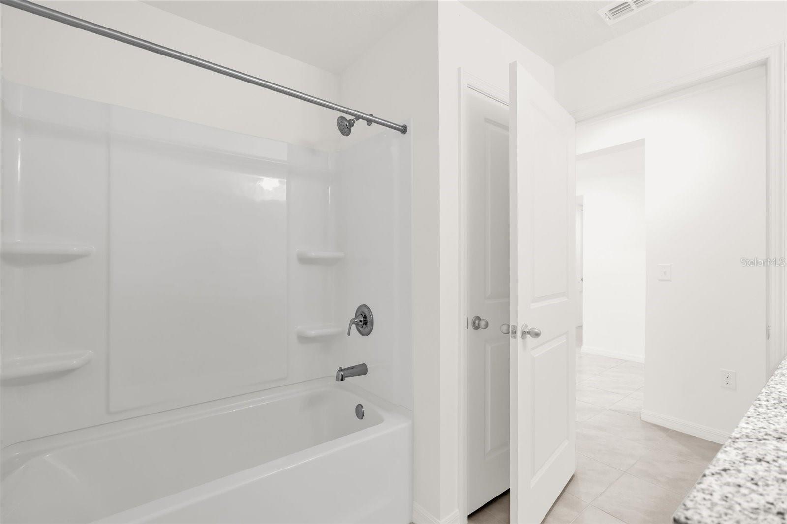 This charming, single-story home showcases an open floor plan with tile flooring and a spacious great room that boasts vaulted ceilings. The modern kitchen is equipped with 36-in. upper cabinets, granite countertops, an island, Whirlpool® stainless steel appliances, a Kohler® sink and a Moen® faucet. The primary suite features a generous walk-in closet and well-appointed connecting bath that offers a dual-sink vanity, linen closet and walk-in shower with tile surround. A dedicated laundry room adds everyday convenience. The covered back patio provides the perfect space for relaxing or hosting guests.