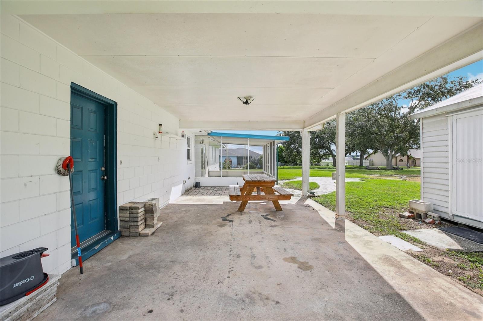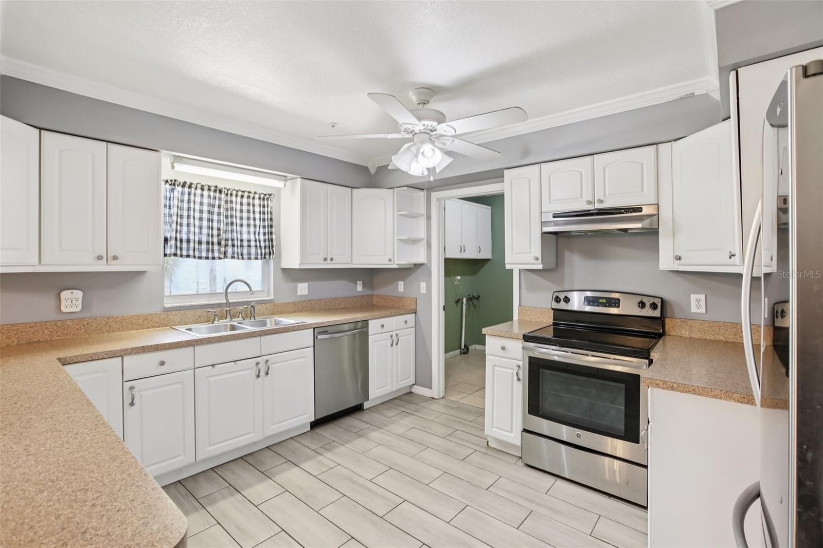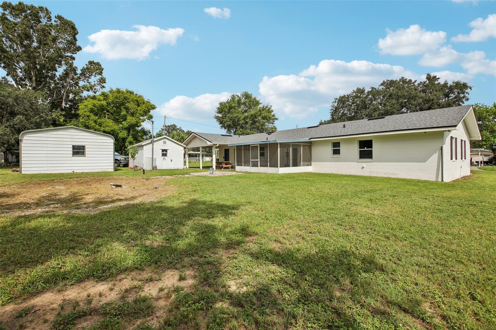 SELLERS ARE MOTIVATED!!! HUGE PRICE IMPROVEMENT!! Come and see this beautifully updated 4-bedroom, 2-bathroom home offering just over 2,000 square feet of comfortable living space. Set on a spacious corner lot with a circular driveway, it delivers fantastic curb appeal from the moment you arrive. Inside, wood-look tile flooring flows through expansive living areas freshly painted for a clean, modern feel. The thoughtfully designed eat-in kitchen features counter seating, sleek stainless steel appliances, and excellent storage—ideal for everyday meals and entertaining. The private primary suite includes its own en-suite bath, while three additional bedrooms provide flexibility for family, guests, or a home office. The updated hall bath showcases a tiled walk-in shower. Sliding doors open to a covered, enclosed lanai—perfect for year-round relaxation. An attached carport offers flexible space for parking or additional entertaining, complemented by two exterior sheds and an indoor utility room for extra storage. A newer roof adds peace of mind. Conveniently located and truly move-in ready, this corner-lot gem has it all. Schedule your private showing today!