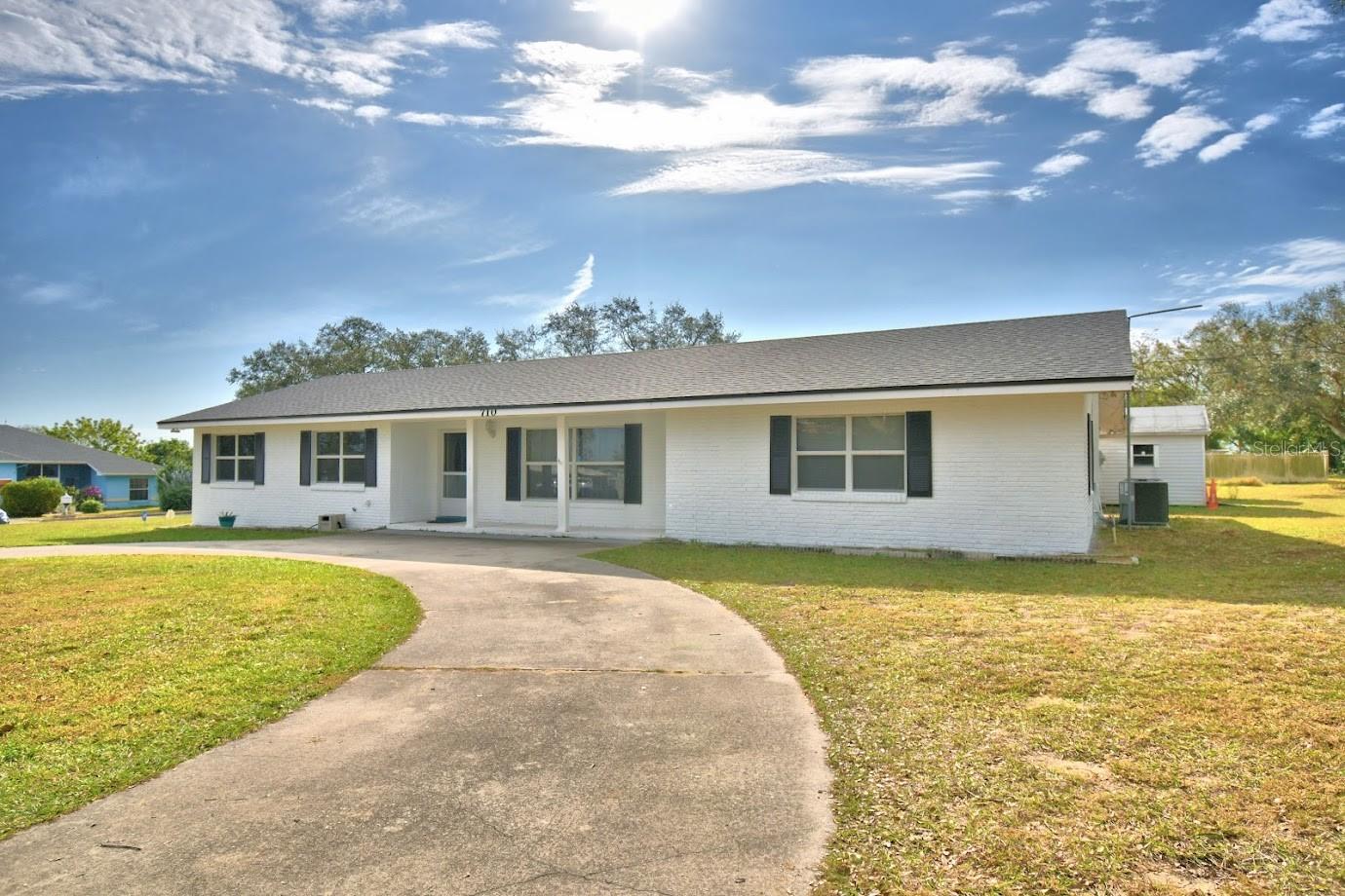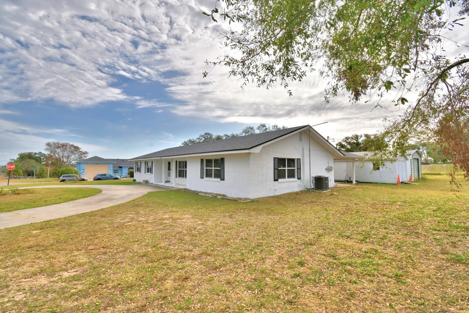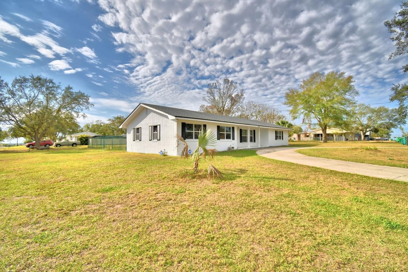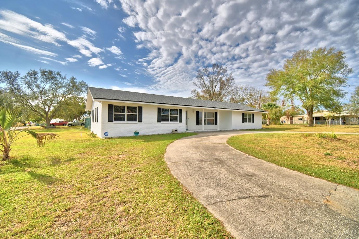 This home sits on a big corner lot with a partially fenced rear yard accessed from lanai. Circular drive and front entry way brings you into a large and bright living room and into the kitchen and dining area and circles around into a bonus room with plenty of space to play, work at home, you name it, this home is very versatile. 3 bedrooms and 2 baths with plenty of closet space. Newer roof, central air, and freshly painted exterior. Newer tile floors throughout really pop against the tastefully painted interior. Exterior sheds (2) w/garage and carport, all with electricity is what you've been dreaming of!
