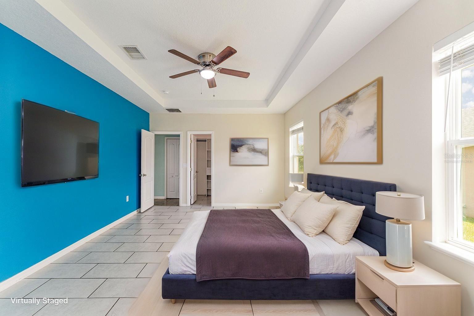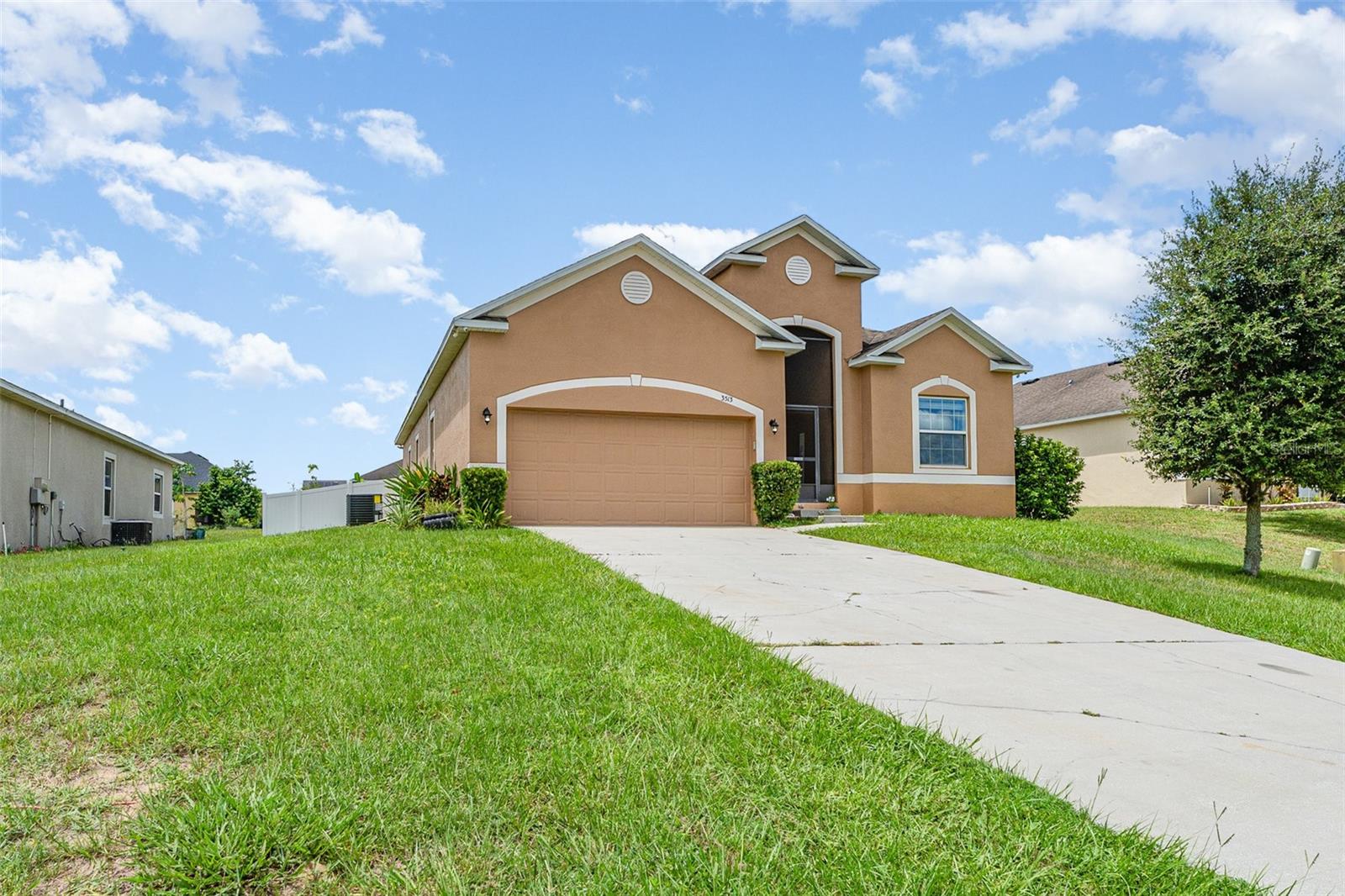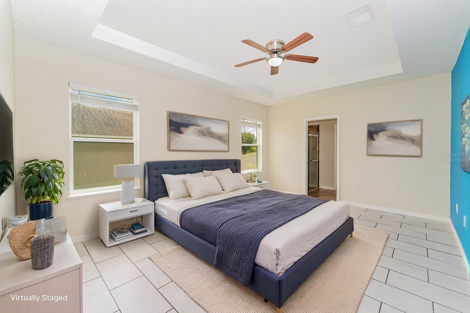 One or more photo(s) has been virtually staged. Welcome to Your Stunning 3-Bedroom, 2-Bathroom Home with a 2-Car Garage on a Spacious Corner Lot! With over 1,750 square feet of heated living space, this home offers an open, flowing floor plan. Step into the expansive living room, seamlessly connected to the dining area and kitchen, perfect for both relaxation and entertainment. The large kitchen features a welcoming breakfast bar. Throughout the common areas, you'll find tastefully updated ceiling fans for a modern touch. The master suite offers a luxurious retreat with its own en-suite bathroom, complete with a separate shower and tub for ultimate relaxation. Bedrooms closets comes with built-ins for organization and ample storage space. From the convenience of your own home, step into your expansive screen-enclosed lanai, perfect for year-round outdoor living and for hosting guests in comfort and style. Situated on a desirable corner lot, this home offers both privacy and convenience. There are solar panels that are currently being leased and transferable which will convey with the property. Has a new AC installed May 2025.