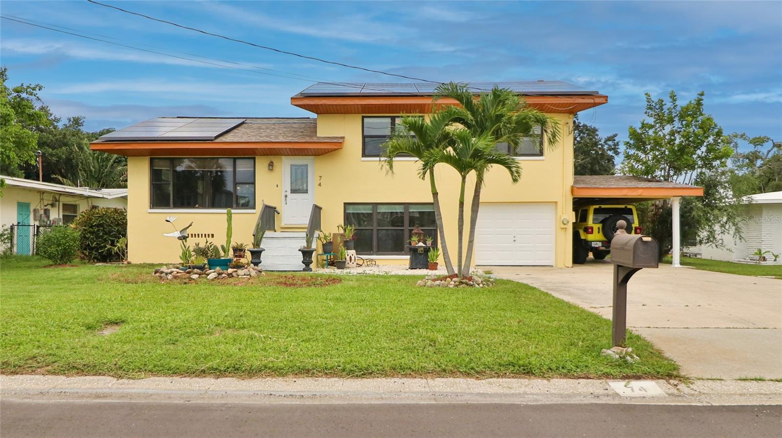 Beautifully updated home on oversized lot and clear 4 point! Welcome to charming and peaceful Dunedin! Your new home is a unique split level home offering comfort, privacy and space for the entire family! New upstairs A/C installed March 2024 and downstairs A/C is 2021. Roof and Solar Panels are from 2018 and SOLAR PANELS ARE PAID OFF. Through the front door, you will enter into your new living room with sleek and freshly finished REAL HARDWOOD floors and fresh paint, coat closet and kitchen featuring ample storage and stone counters, and a pass through to your dining room space, making entertaining a breeze. You then have the choice to go upstairs or downstairs. Upstairs features a large master bedroom as well as ample sized guest bedrooms and pristine new bathroom. Downstairs, there is an additional space that could be used to create a dreamy master suite, a second living space, gym, plenty of room for a pool table, playroom or even extra sleeping space; you name it! Your large laundry room, refinished second full bathroom, garage, and entrance to outdoor lanai is through the downstairs space. The backyard is spacious and is a great spot to host parties or would be excellent to build your new beautiful pool! 74 Palm was one of the first built in the neighborhood and has only had a few owners over its lifetime. Surrounded by multi million dollar homes and more being built, live the life of luxury without the luxury price tag! The entire home has been freshly painted inside and out. The home has been consistently cared for by its previous owners and now it's time for you to enjoy Dunedin! Located less than 1/2 mile to Dunedin Golf Club and entrance to Pinellas Trail, a comfortable 2 mile walk or bike to dog friendly downtown Dunedin with tons of shopping, dining and breweries and less than 3 miles to beautiful Honeymoon Island State Park. Mease Dunedin Hospital, and several spring training ball stadiums are also nearby, less than 10 miles to Clearwater Marine Aquarium!