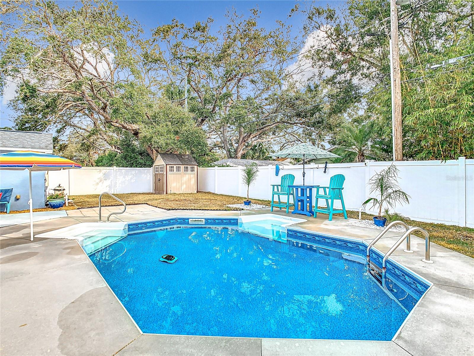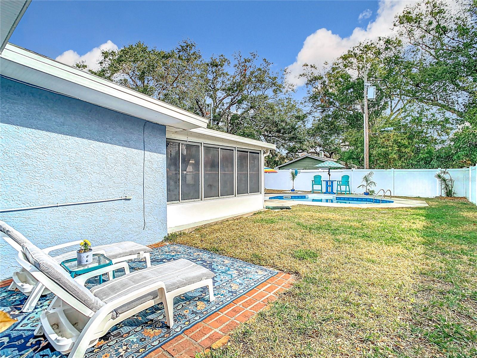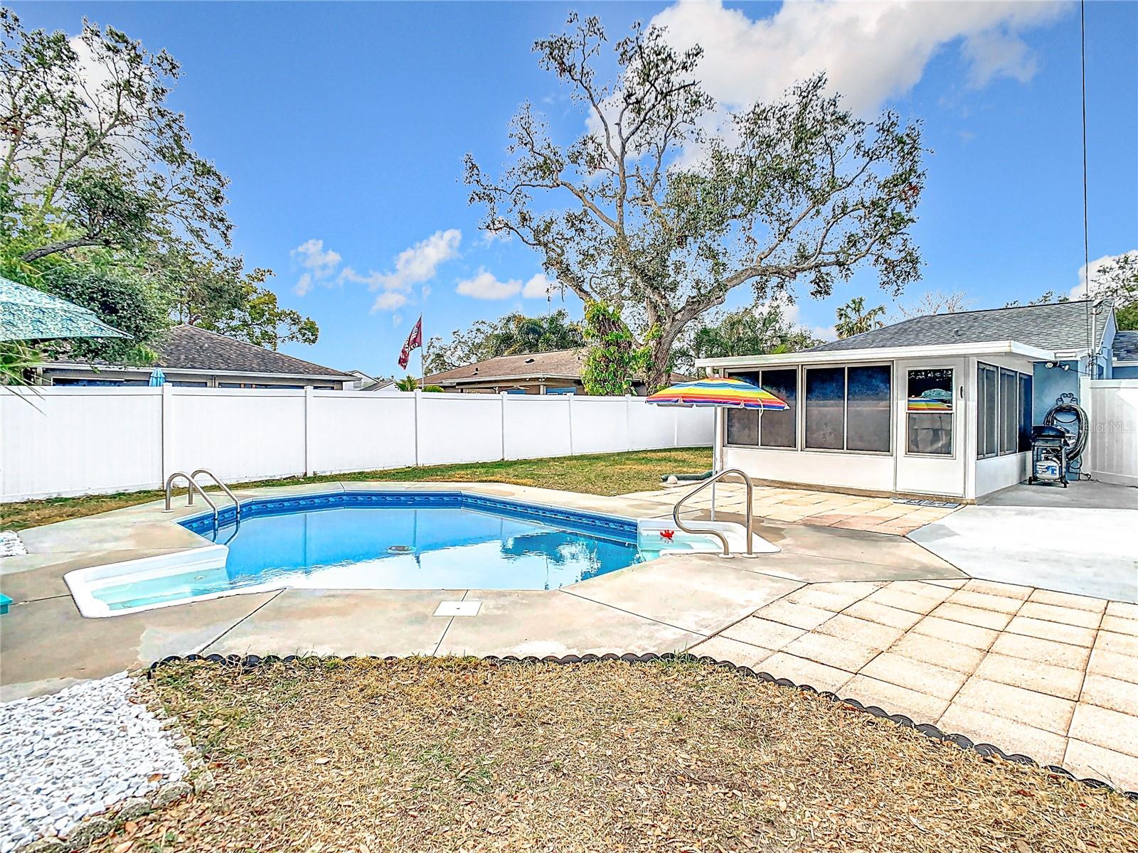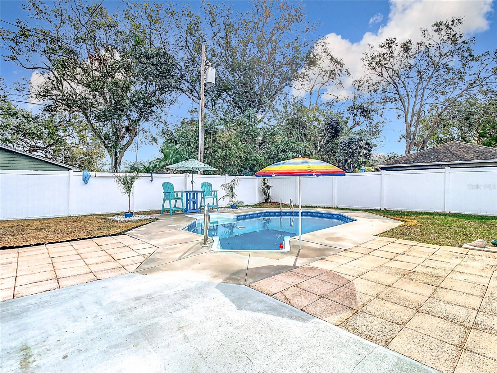 SELLER SAYS SELL! Presenting ALL offers! Charming Block Home with Pool – Prime Dunedin Location! High and Dry! Did not flood and in flood zone X. This meticulously maintained, move-in-ready 1948 home is a rare find! Lovingly maintained with the blend of stylish upgrades and historic charm. Luxury Vinyl Plank Floors throughout in 2024. Featuring a beautifully updated kitchen with granite countertops, wood cabinets, and recessed lighting, this 2-bedroom (plus convertible family room) home blends vintage charm with modern upgrades. The large front porch welcomes you, while a weatherized screened-in patio leads to a spacious backyard with a pool and jacuzzi seat (added in 2009, new liner in 2021 with a 20-year warranty). Washer and dryer, all mounted TV's, as well as front porch furniture included! Key Updates: Roof (2012), HVAC (2019) with a maintenance warranty through July 2025, Electrical (2009), Plumbing (2019), Insulation (2020), Windows (2010), Kitchen (2013), Bathroom (2024), Tile Flooring (2013/2014), Vinyl Privacy Fence (2018), Freshly painted interior (2024), Levolor Blinds throughout (2024), Pest Control warranty through 2026, plus more! Detached garage with electric, water, and sewer offers easy conversion to a separate living space. Located just minutes from Downtown Dunedin, the Pinellas Trail, VFW Post #275, Honeymoon Island, and within the golf cart district. Easy access to the Jolley Trolley for a fun, convenient ride to local attractions. This is a must-see home—don’t miss out!