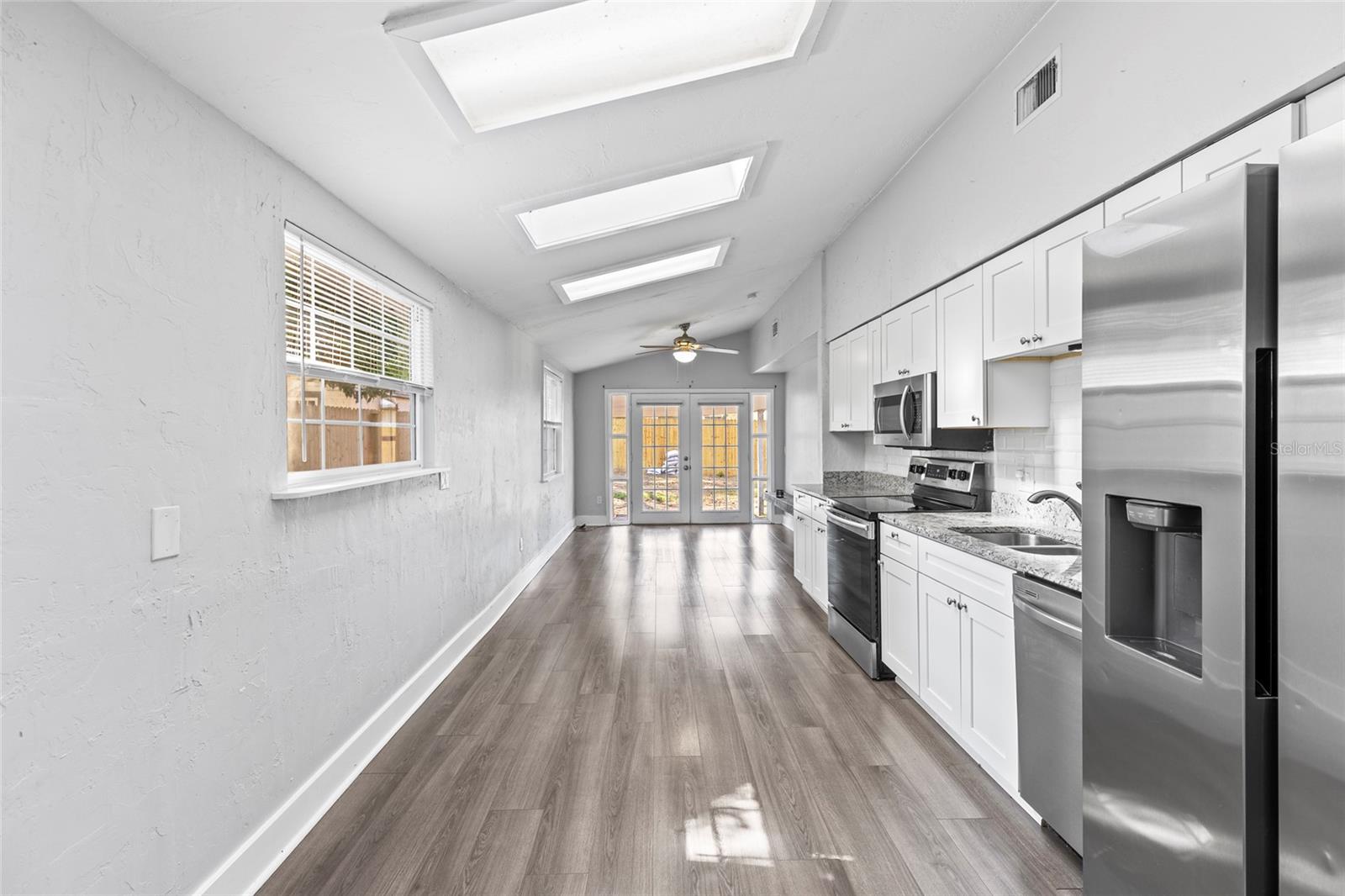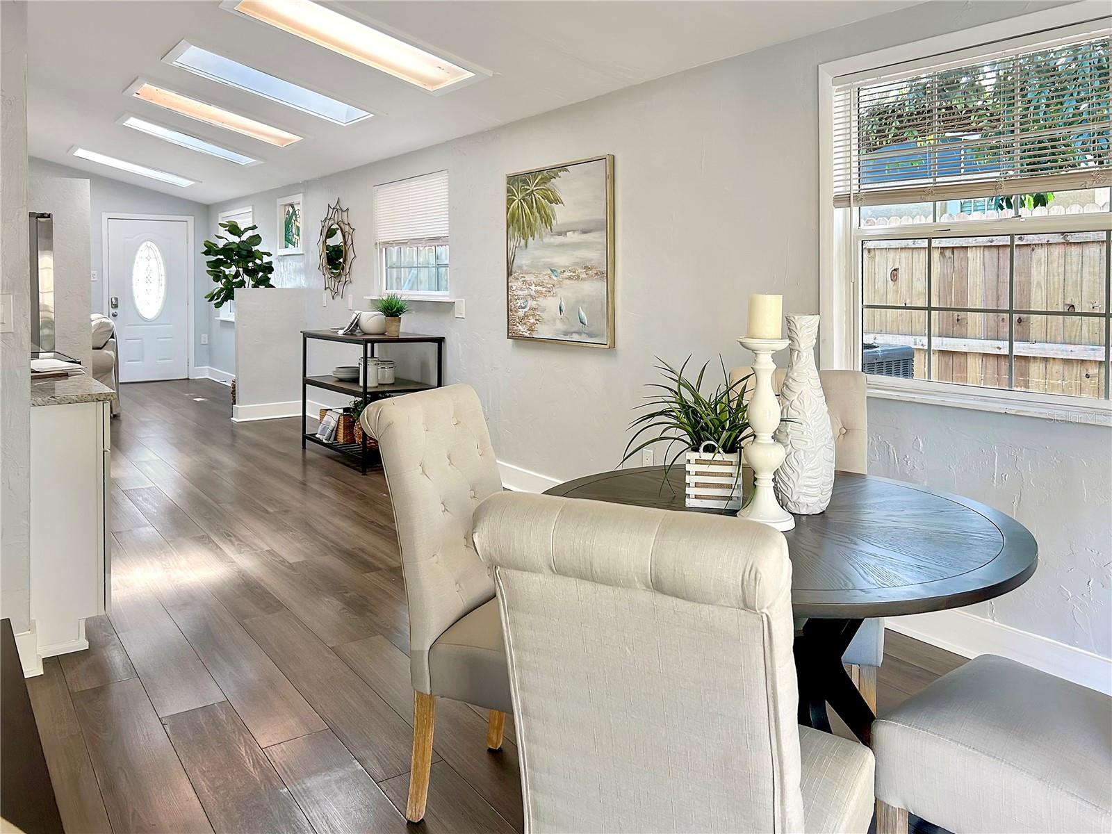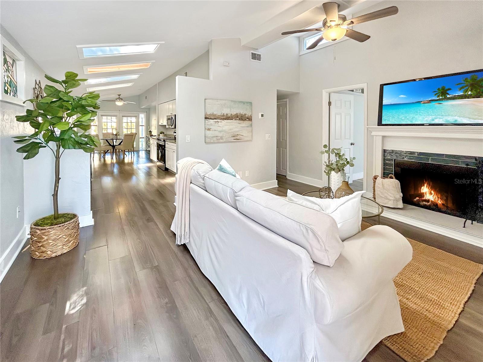 Welcome to this FULLY UPDATED TURN-KEY 4-bed, 2-bath home nestled just a short walk from the heart of Downtown Dunedin! NOT IN A FLOOD ZONE, this thoughtfully designed OPEN CONCEPT property features an updated HVAC from 2020, easy-to-maintain VINYL flooring throughout as well as VAULTED CEILINGS with several SKLYLIGHTS, exuding space and plenty of natural light. This is the perfect house to be used as either an income producing property or to make as your own home. The spacious living room is centered around a beautiful wood-burning FIREPLACE and features several built ins, adding a touch of warmth and character to the space. The open kitchen features GRANITE countertops and STAINLESS STEEL appliances and flows seamlessly to the dining area, perfect for preparing meals and entertaining guests. The primary bedroom offers a peaceful retreat with its own ENSUITE BATHROOM and double French doors that lead to the expansive backyard! Three additional bedrooms as well as a full guest bath reside, creating more than enough space to have a home office, nursey, etc! The large, FULLY FENCED yard offers endless possibilities for outdoor living, whether you're relaxing on the patio or hosting a gathering with friends and family. Location is everything with this home! You're just 2 miles from the Blue Jays stadium, a short walk to the many shops, cafes, and restaurants of quaint Downtown Dunedin, AND only 5-7 miles to some of Florida’s best beaches: Honeymoon Island & Clearwater Beach. Whether you're a sports fan, a foodie, or someone who loves the beach, this location has it ALL! Don’t miss the opportunity to make this stunning home yours!