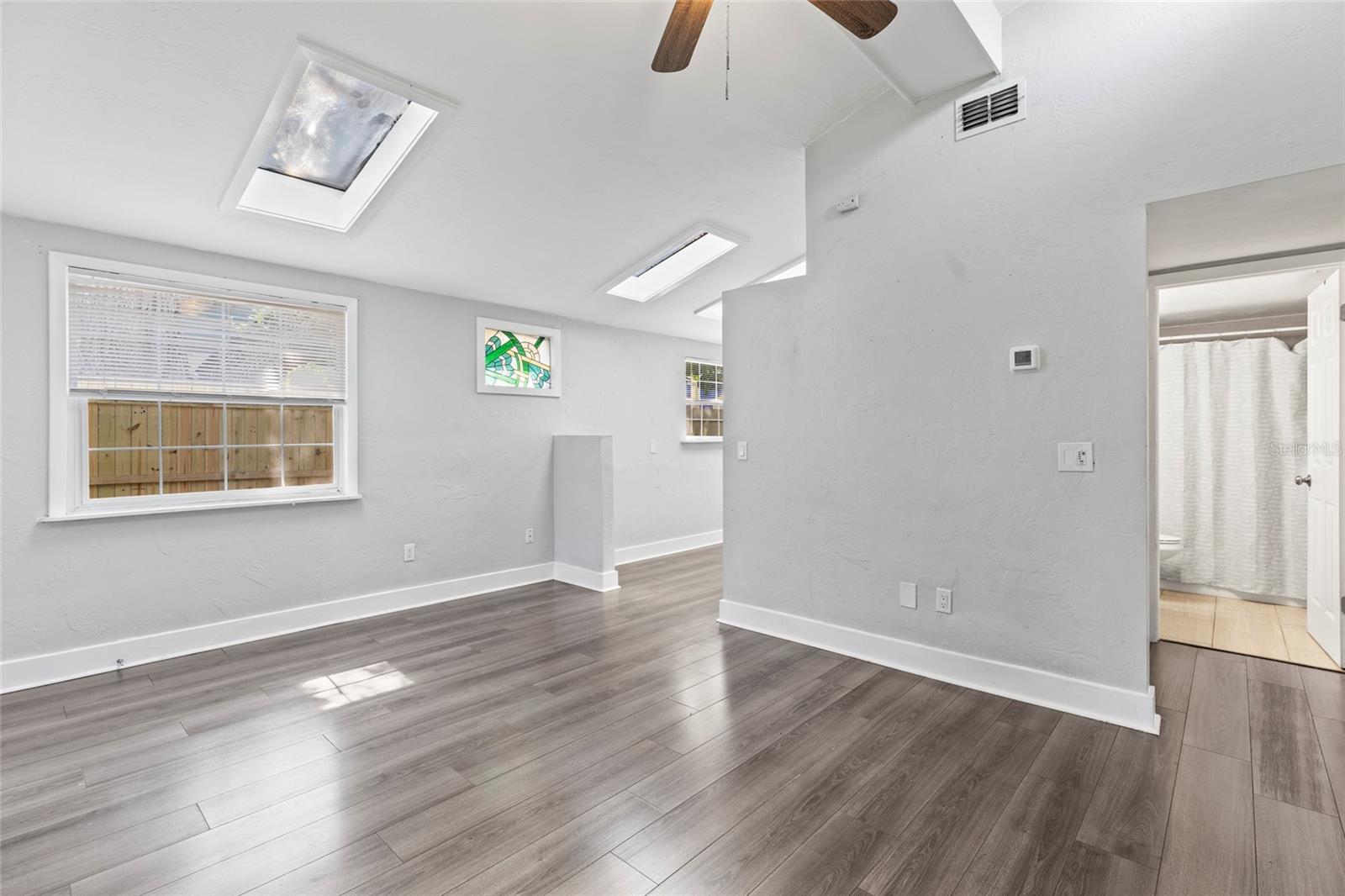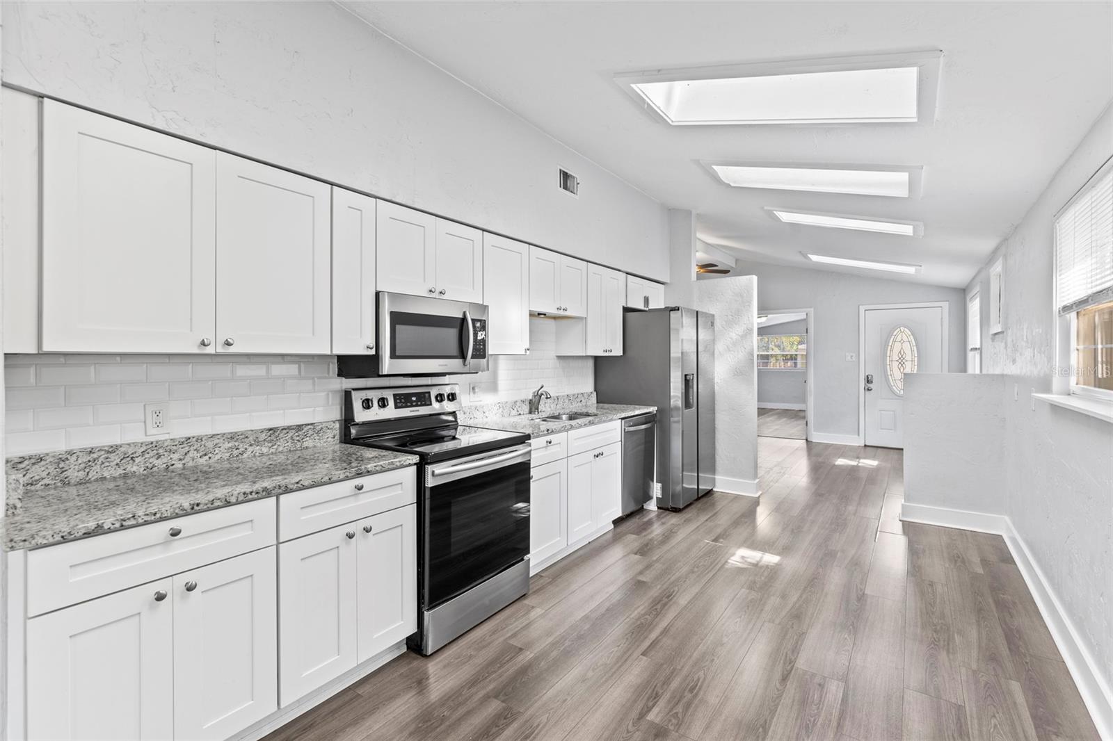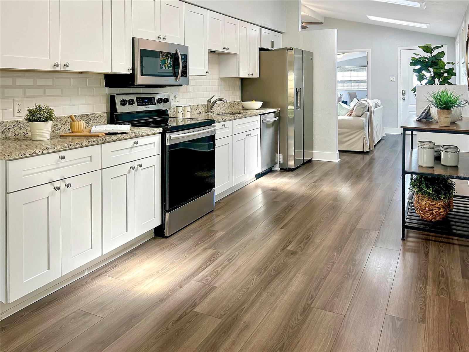 Welcome to this FULLY UPDATED TURN-KEY 4-bed, 2-bath home nestled just a short walk from the heart of Downtown Dunedin! NOT IN A FLOOD ZONE, this thoughtfully designed OPEN CONCEPT property features an updated HVAC from 2020, easy-to-maintain VINYL flooring throughout as well as VAULTED CEILINGS with several SKLYLIGHTS, exuding space and plenty of natural light. This is the perfect house to be used as either an income producing property or to make as your own home. The spacious living room is centered around a beautiful wood-burning FIREPLACE and features several built ins, adding a touch of warmth and character to the space. The open kitchen features GRANITE countertops and STAINLESS STEEL appliances and flows seamlessly to the dining area, perfect for preparing meals and entertaining guests. The primary bedroom offers a peaceful retreat with its own ENSUITE BATHROOM and double French doors that lead to the expansive backyard! Three additional bedrooms as well as a full guest bath reside, creating more than enough space to have a home office, nursey, etc! The large, FULLY FENCED yard offers endless possibilities for outdoor living, whether you're relaxing on the patio or hosting a gathering with friends and family. Location is everything with this home! You're just 2 miles from the Blue Jays stadium, a short walk to the many shops, cafes, and restaurants of quaint Downtown Dunedin, AND only 5-7 miles to some of Florida’s best beaches: Honeymoon Island & Clearwater Beach. Whether you're a sports fan, a foodie, or someone who loves the beach, this location has it ALL! Don’t miss the opportunity to make this stunning home yours!