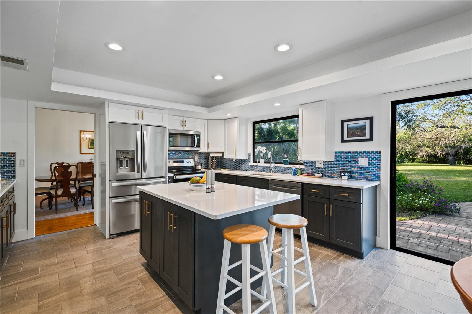 High & dry, no flooding during the two recent hurricanes! Come and see this gorgeous remodeled architectural marvel situated on 1.28 acres in Dunedin Florida only 4.7 miles away from Honeymoon Island and only 2 miles from the newly renovated Dunedin Golf Club and from the Pinellas Trail, while downtown Dunedin with its well renowned restaurants, coffee places is located only 3.5 miles away. Dunedin is a golf cart friendly quaint town right on the Gulf of America famously known for its Honeymoon Island natural park & beach and for its Downtown, full of life, restaurants and walkable streets. This two story Pool home is located well inside the 1.28 acres lot and it will welcome you with its imposing but also subtle colonial architectural vibe. The wide and deep three car garage and massive driveway will give you plenty of space to park all your toys, cars so it is ideal for large parties. This home conveniently features five bedrooms and 3 full bathrooms: the large primary bedroom with its recently fully remodeled large en-suite bathroom is located upstairs together with three other bedrooms served by an ample guest bath. There is also a downstairs bedroom and a fully remodeled guest bathroom located downstairs together with the Laundry room. The impressive entrance with high ceilings overlooking the stairs, will then open up on your left to the large formal living room and dining room space with plenty of light from multiple sets of windows that look over the massive backyard and front yard & with its uniquely charming vaulted ceilings, then to your right it will open up to a cozy living room with its vintage fireplace. The fully remodeled kitchen sits right in the middle of the house, connecting the formal living and dining space with the living room. This kitchen has everything and more for all your needs, including a fully functional island, lots of cabinets and a breakfast nook that overlooks the amazing pool and fabulous garden. Two sets of sliding doors connect the living areas to the backyard & pool, while an enclosed, covered patio, with impressively high and vaulted ceilings, will unexpectedly but pleasantly open up on the side of the house. The indescribable backyard view is filled with a wide open pool, with a large pavers deck, a pool that is also heated, salt system, chlorine free and conveniently remotely controlled via an app. The one acre plus backyard is absolutely outstanding and you will not be able to see the end of it. Just a reminder, this is a 3253 heated square feet custom built home on 1.28 acres, it has had a lot of work done to it, including the large kitchen with plenty of newer cabinets & extensive quartz countertops that give you a lot of space for your cooking, two fully remodeled bathrooms, it was recently partially painted outside and inside, it has a professional grade heated salt pool and SPA.! Also the sprinkler system is on a deep well, that will save you money in your water bill!. Last but not least, new water heater last year & new gutters throughout the house. The entire siding of the house is made of Hardie Plank for your peace of mind.