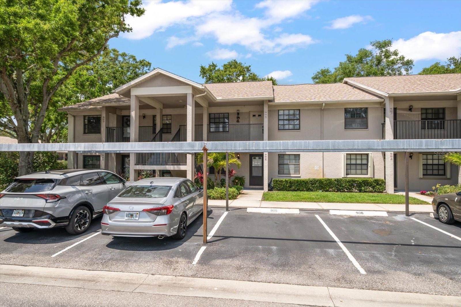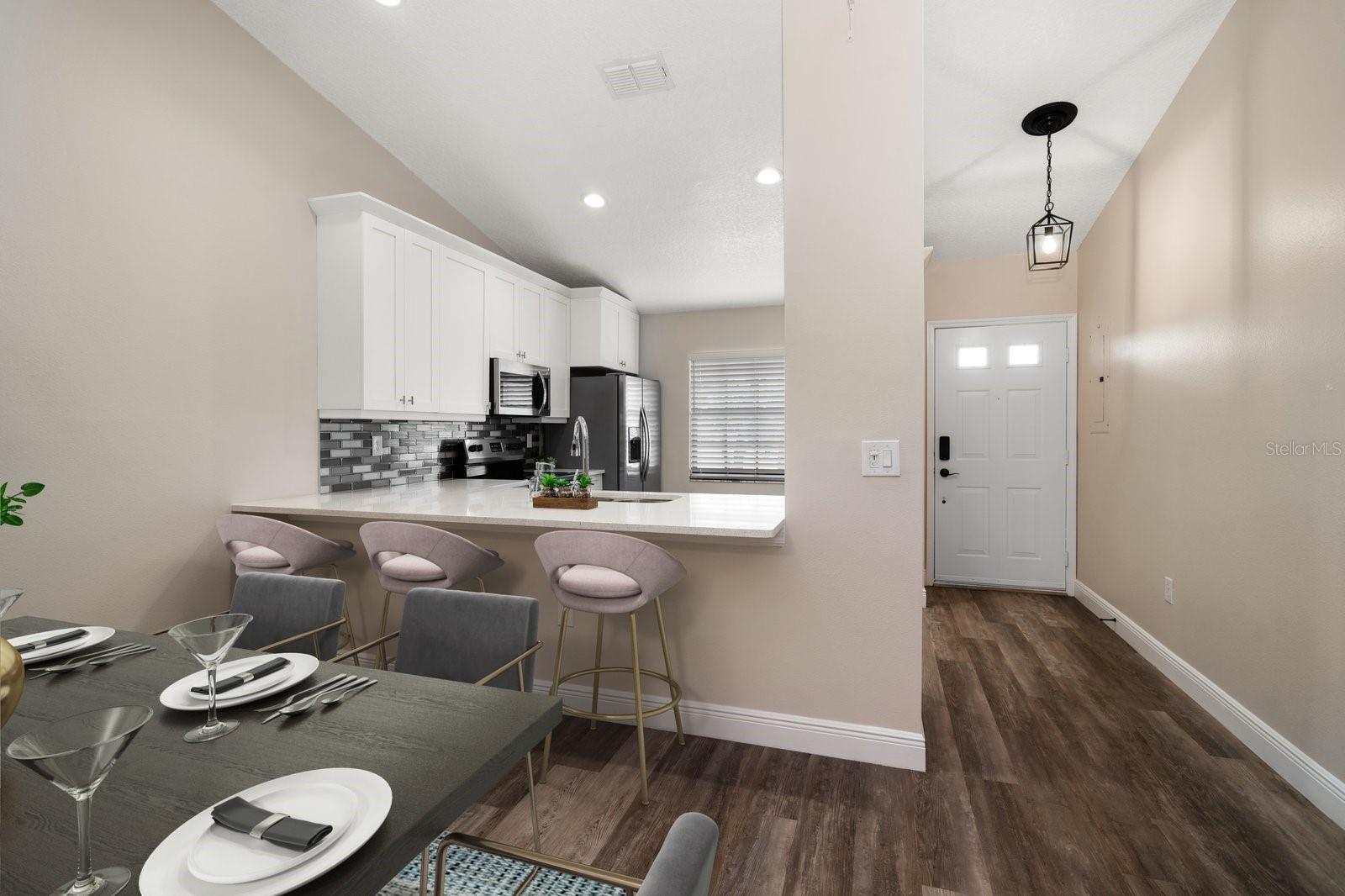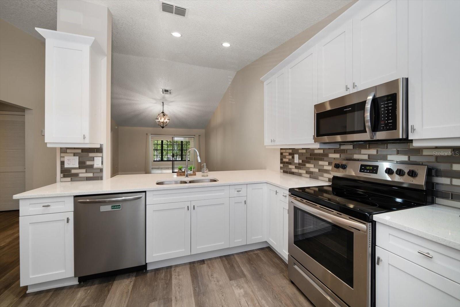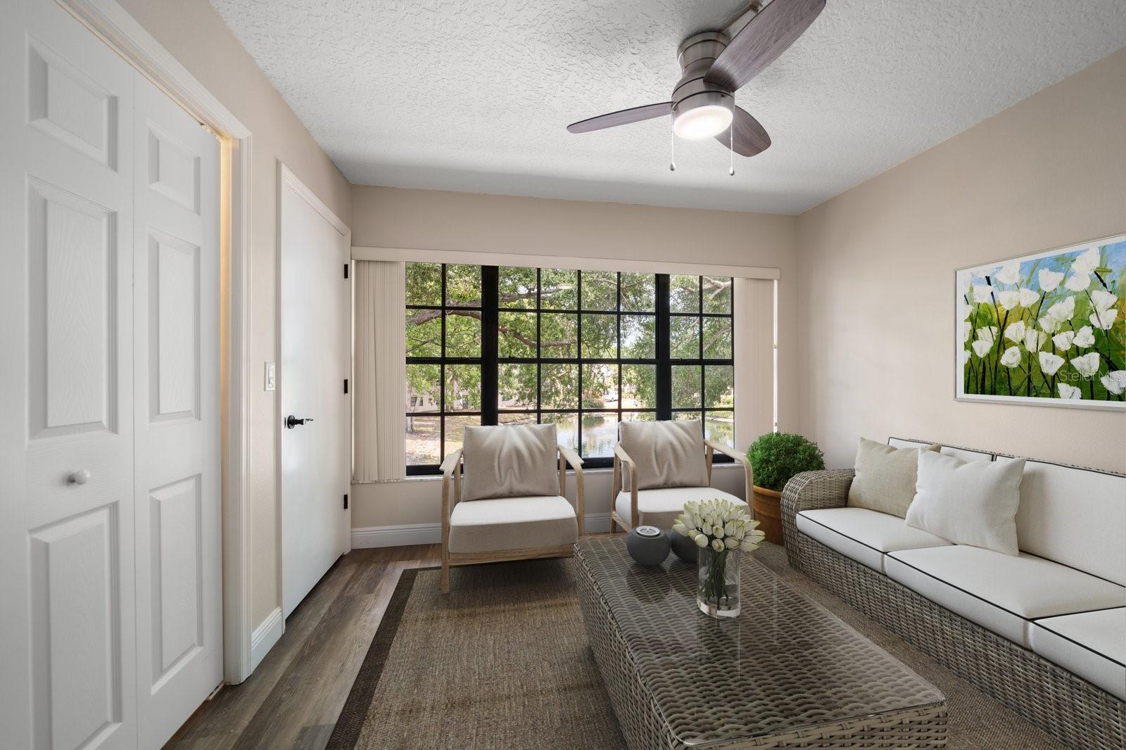 One or more photo(s) has been virtually staged. Completely Remodeled with NEW A/C & NEW HOT WATER TANK! At 63 feet above sea level, this condo is NOT IN A FLOOD ZONE. Nestled within the serene community of Forest Park Condos in highly sought after Dunedin, this pristine, completely updated condo offers the perfect blend of luxury, comfort, and convenience. A meticulously maintained unit, this stunning condo boasts 2 bedrooms, and 2 baths, with assigned carport parking, soaring 12-foot vaulted ceilings, and an enclosed sunroom with tranquil and park-like lake views. Up the stairs to this 2nd floor unit you are met with a cozy space for outdoor seating on the front of the unit. Step inside, and you'll instantly fall in love with the open-concept design and high-end finishes throughout, you will immediately be drawn into the light filled space, the 12’ vaulted ceilings create an airy openness throughout the main living areas. Luxury vinyl plank flooring in every room sets a warm yet sophisticated tone. The sparkling clean, fully updated and open gourmet kitchen is both stylish and functional. Soft-close 42” cabinetry provides ample storage, while gleaming quartz countertops, glass tile backsplash, a coffee bar with large storage drawers, and a single-level breakfast bar invite casual conversations over morning coffee. All Frigidaire stainless-steel appliances 2021. An open concept the kitchen and dining space seamlessly connect to the living room, with sliding glass doors that open to the enclosed sunroom, and you’re greeted by a peaceful lake view and lush greenery—your private escape for morning coffee or evening relaxation. The sunroom includes a spacious and convenient laundry closet, and a big storage closet. Back inside, the primary suite is a sanctuary of its own. Positioned away from the main living areas for maximum privacy, it features vaulted ceilings and a window facing the lake, and 2 closets. The en suite bath is a dream, boasting a walk-in shower with glass doors, quartz countertops, soft close cabinetry, and a pocket door for privacy. A split plan, the second bedroom is at the front of the unit next to an updated hall bath with quartz counters, soft close cabinets and a tub/shower conveniently located for guests, a hall linen closet and pull down steps to access plentiful attic storage space. This unit has a NEW A/C unit, Comfortmaker, 2.5 TON, 15 SEER and NEW “State” brand WATER HEATER and also this unit comes with a TRANSFERRABLE HOME WARRANTY. From the elegant finishes to the well-planned layout, this gorgeous condo offers a perfect blend of luxury, comfort, and convenience. There is also a heated community pool, and updated clubhouse with a kitchenette and pool table. Close to shopping, dining, parks, malls, airports and located just 12 minutes from Honeymoon Island and the sparkling waters of the Gulf.