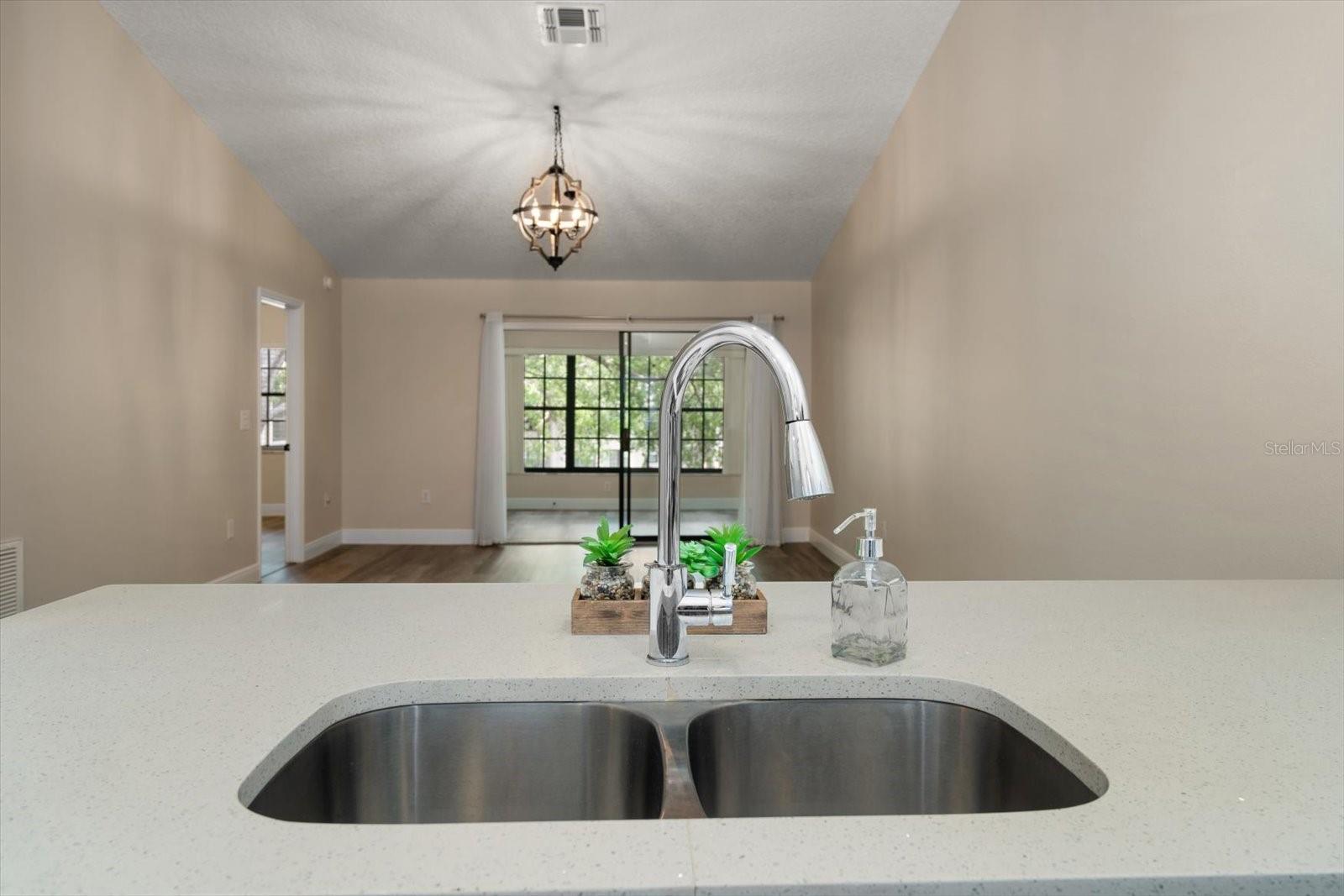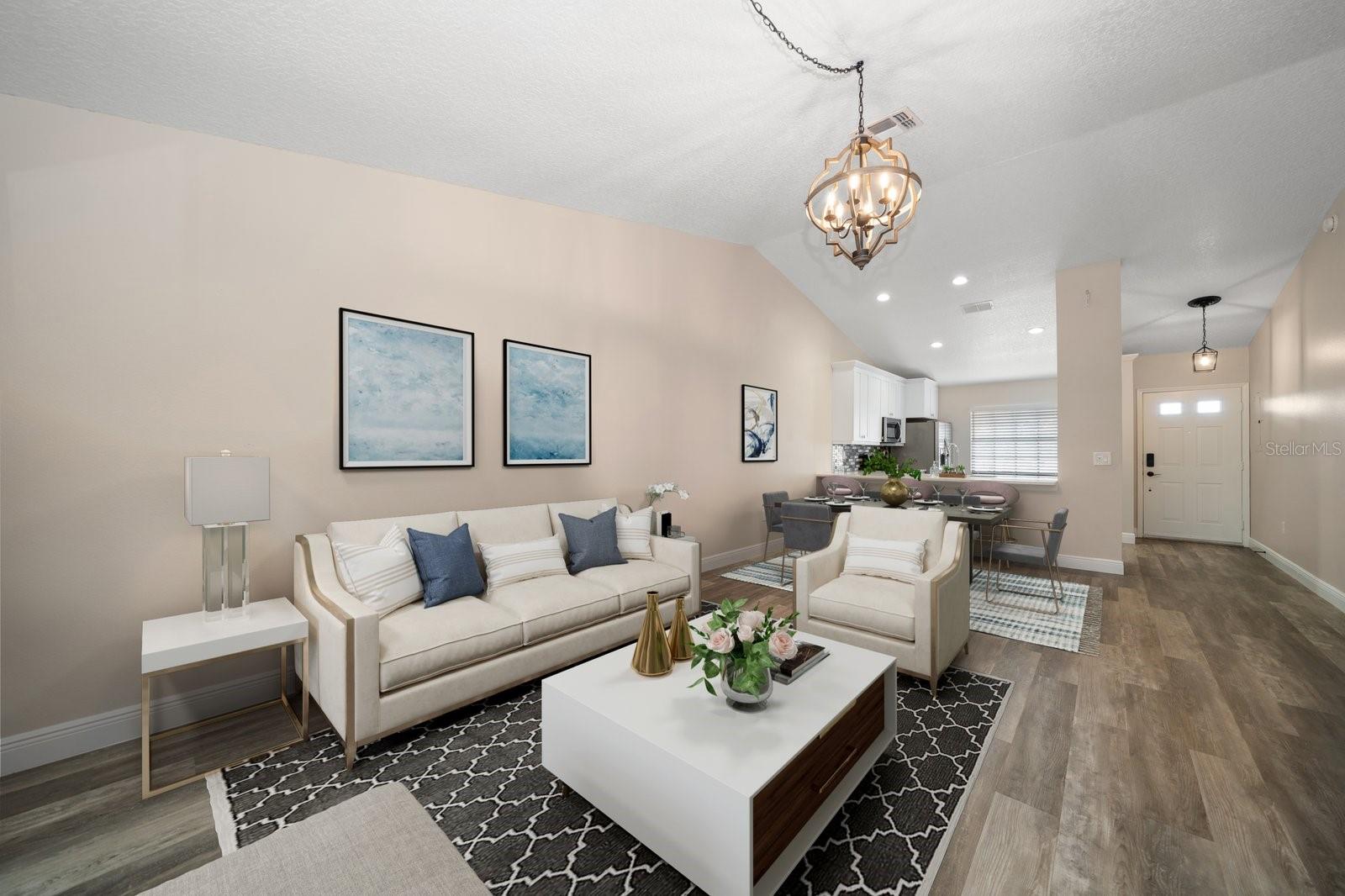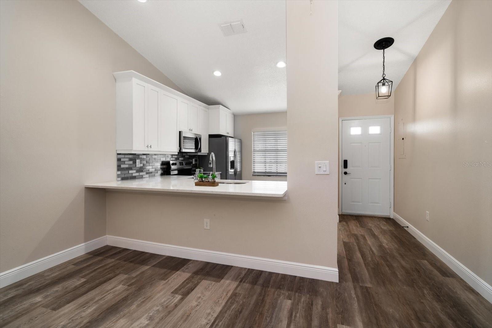 One or more photo(s) has been virtually staged. Completely Remodeled with NEW A/C & NEW HOT WATER TANK! At 63 feet above sea level, this condo is NOT IN A FLOOD ZONE. Nestled within the serene community of Forest Park Condos in highly sought after Dunedin, this pristine, completely updated condo offers the perfect blend of luxury, comfort, and convenience. A meticulously maintained unit, this stunning condo boasts 2 bedrooms, and 2 baths, with assigned carport parking, soaring 12-foot vaulted ceilings, and an enclosed sunroom with tranquil and park-like lake views. Up the stairs to this 2nd floor unit you are met with a cozy space for outdoor seating on the front of the unit. Step inside, and you'll instantly fall in love with the open-concept design and high-end finishes throughout, you will immediately be drawn into the light filled space, the 12’ vaulted ceilings create an airy openness throughout the main living areas. Luxury vinyl plank flooring in every room sets a warm yet sophisticated tone. The sparkling clean, fully updated and open gourmet kitchen is both stylish and functional. Soft-close 42” cabinetry provides ample storage, while gleaming quartz countertops, glass tile backsplash, a coffee bar with large storage drawers, and a single-level breakfast bar invite casual conversations over morning coffee. All Frigidaire stainless-steel appliances 2021. An open concept the kitchen and dining space seamlessly connect to the living room, with sliding glass doors that open to the enclosed sunroom, and you’re greeted by a peaceful lake view and lush greenery—your private escape for morning coffee or evening relaxation. The sunroom includes a spacious and convenient laundry closet, and a big storage closet. Back inside, the primary suite is a sanctuary of its own. Positioned away from the main living areas for maximum privacy, it features vaulted ceilings and a window facing the lake, and 2 closets. The en suite bath is a dream, boasting a walk-in shower with glass doors, quartz countertops, soft close cabinetry, and a pocket door for privacy. A split plan, the second bedroom is at the front of the unit next to an updated hall bath with quartz counters, soft close cabinets and a tub/shower conveniently located for guests, a hall linen closet and pull down steps to access plentiful attic storage space. This unit has a NEW A/C unit, Comfortmaker, 2.5 TON, 15 SEER and NEW “State” brand WATER HEATER and also this unit comes with a TRANSFERRABLE HOME WARRANTY. From the elegant finishes to the well-planned layout, this gorgeous condo offers a perfect blend of luxury, comfort, and convenience. There is also a heated community pool, and updated clubhouse with a kitchenette and pool table. Close to shopping, dining, parks, malls, airports and located just 12 minutes from Honeymoon Island and the sparkling waters of the Gulf.