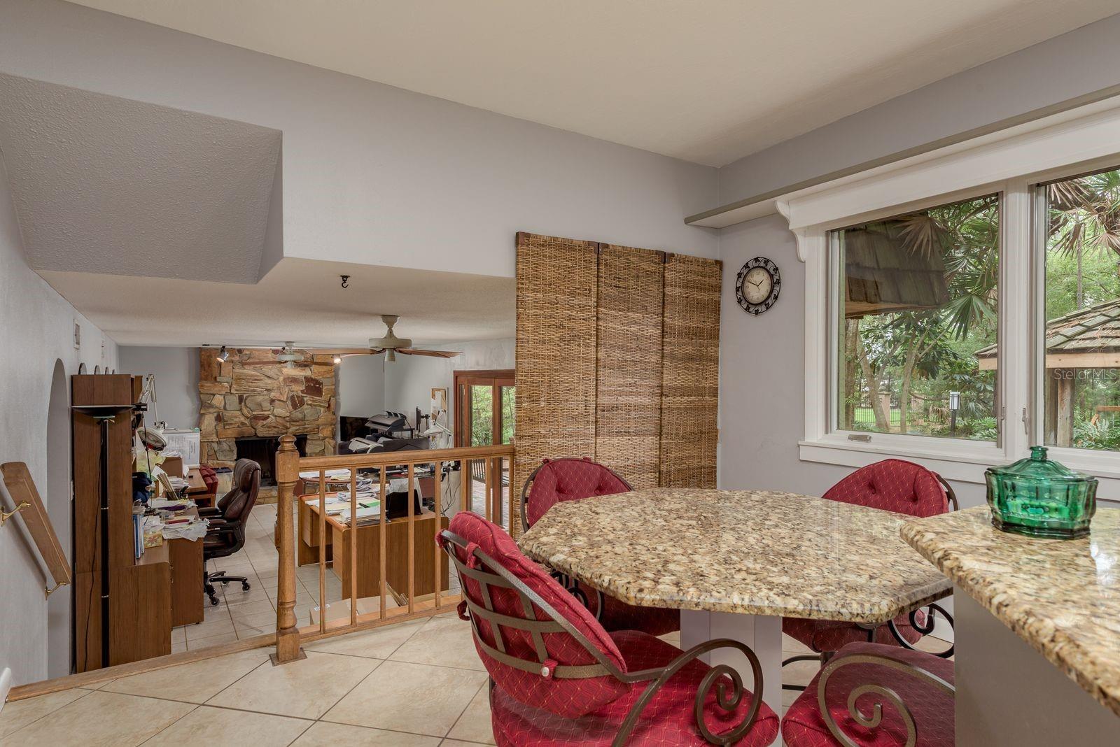 One or more photo(s) has been virtually staged. Tucked away on one of Dunedin’s most sought-after and rarely traveled lanes, 2279 Ranchette Lane offers a truly uncommon opportunity to own a one-acre, wooded retreat in the heart of Dunedin, Florida. Designed to live in harmony with its natural surroundings, this Mid-Century Florida Contemporary residence blends timeless architecture with privacy, tranquility, and everyday convenience—just minutes from downtown Dunedin, Honeymoon Island, and Caladesi Island. Surrounded by mature oaks, palms, and native Florida landscaping, the home sits gracefully within a certified wildlife habitat, creating a peaceful, forested setting seldom found this close to the coast. With over 3,100 square feet, the four-bedroom, three-bath main residence is thoughtfully designed to embrace natural light, outdoor views, and a seamless flow between living spaces. The interior features expansive living and dining areas, a welcoming family room anchored by a fireplace, and a well-appointed chef’s kitchen with shaker-style cabinetry, granite countertops, an oversized island, and abundant storage—ideal for both daily living and entertaining. Upstairs, the private primary suite opens to a balcony overlooking the serene grounds, while additional bedrooms provide flexible space for guests, work-from-home needs, or creative pursuits. A detached, air-conditioned studio further enhances the property’s versatility, offering the perfect setting for a home office, artist’s studio, gym, or future guest quarters. Practical updates include a 2021 roof, impact-rated windows and doors, a pavered driveway, and an oversized two-car garage, all reflecting careful stewardship of the home. Outdoors, the property truly shines. Meandering paths lead through shaded gardens and mature trees, while an outdoor kitchen, grill area, and gazebo create inviting spaces for gathering beneath the canopy. This is a home designed not just to be lived in—but experienced. Rarely does a property offer this combination of acreage, architectural character, privacy, and proximity. Located just a short bike ride or drive from Dunedin’s marina, vibrant downtown shops, local restaurants, and some of Florida’s most celebrated beaches, 2279 Ranchette Lane represents a distinctive Dunedin lifestyle—where nature, thoughtful design, and coastal living converge.
