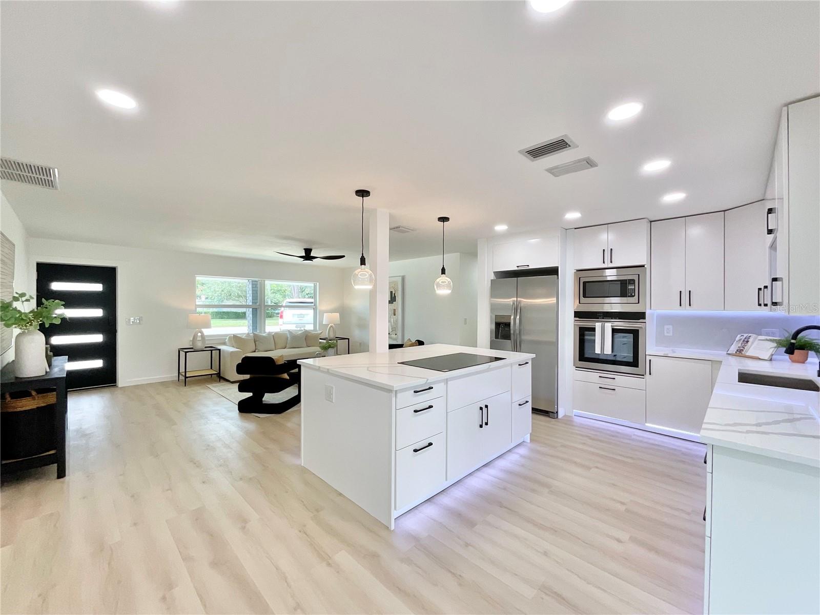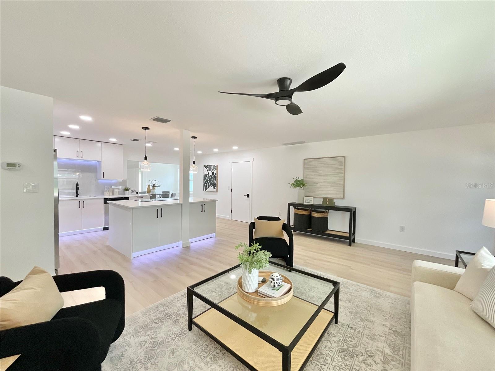 Motivated seller - bring your offer! Welcome to your dream home in the heart of Dunedin, one of Florida’s most beloved coastal towns. Located in a vibrant golf cart-friendly community, this beautifully remodeled residence blends small-town charm with modern convenience. Just minutes from downtown Dunedin, the Pinellas Trail, and the stunning shores of Honeymoon Island, this home offers the ideal Florida lifestyle. The heart of the home is a spacious, open-concept living area that seamlessly blends the kitchen, dining, and living spaces into one continuous flow with natural light pours in through new windows and new sliding glass doors. Stunningly renovated kitchen with a large island is ideal for hosting guests or enjoying a morning coffee. Under-cabinet lighting, designer backsplash, and pendant lights above the island create a warm, inviting ambiance, while new stainless steel appliances and under-mount sink complete the upscale aesthetic. The primary bathroom features a walk-in shower, floor-to-ceiling tile, fixtures in gold and soft, ambient lighting with mirror create a bright look and upscale appeal. The guest bathroom is equally impressive, with a new vanity, updated lighting, and soaking tub. From the stylish finishes to the smart layout choices, these remodeled bathrooms are perfect blend of modern design and everyday comfort, making them true highlights of the home. This beautifully updated home offers the perfect blend of modern upgrades and timeless comfort. With a brand-new roof, all-new flooring, and new energy-efficient windows throughout, this home provides peace of mind, style, and long-term value.