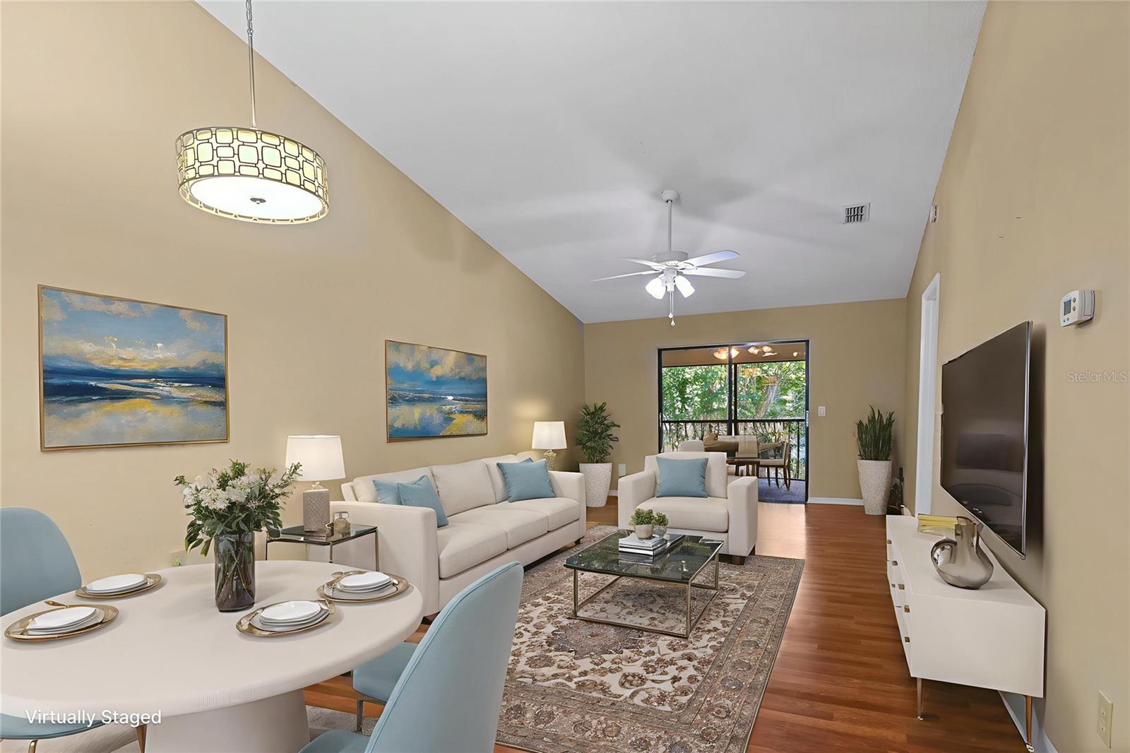 One or more photo(s) has been virtually staged. *New Price* - Discover a peaceful, pond-side escape right in the heart of vibrant Central Dunedin. This beautifully cared-for 2-bedroom, 2-bath condo offers a lifestyle that blends relaxation and accessibility, just minutes from the charm of Downtown Dunedin, boutique shops, local eateries, and an easy commute to Tampa. Perched on the second floor, this light-filled unit welcomes you with soaring vaulted ceilings, an open-concept layout, and calming views that instantly make you feel at home. Step onto the screened lanai, your new favorite coffee spot, overlooking a sparkling pond and fountain that feels like your own private oasis. The in-unit laundry is cleverly tucked away here, so even chores come with a view. Retreat to a serene primary suite featuring pond views, vaulted ceilings, dual closets, and a spacious vanity area leading to a walk-in shower. The guest bedroom offers comfort and flexibility, with a large closet and natural light pouring in from the front window. The community invites you to unwind with a resort-style pool, expansive sun deck, and welcoming clubhouse—perfect for weekend lounging or social gatherings. Assigned covered parking and plentiful guest spots ensure convenience for both you and your visitors. This condo is more than just a home—it’s a lifestyle upgrade, and your move to Dunedin could be easier than ever. Don’t wait—schedule your private showing today and experience it in person!