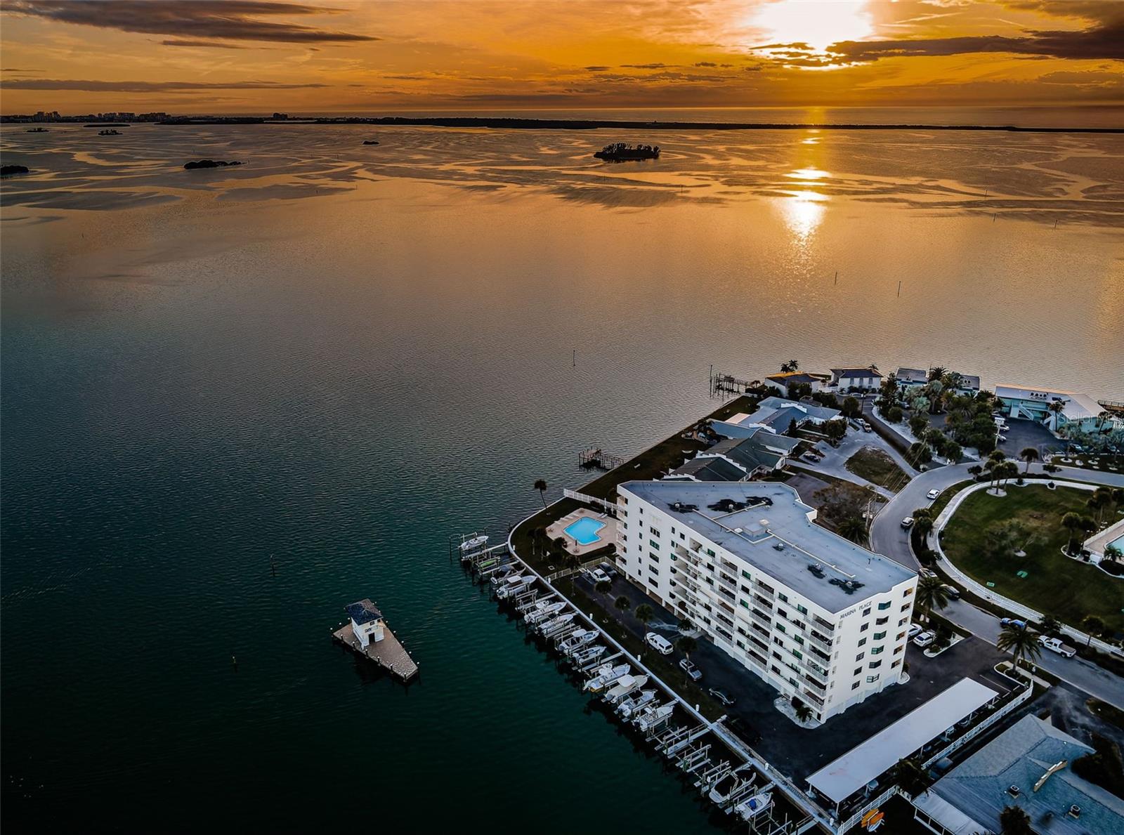 Experience refined WATERFRONT living at Marina Place, one of Dunedin’s most coveted communities! This TOP FLOOR, END-UNIT residence offers a rare combination of privacy, gorgeous panoramic views, and direct boating access, all just minutes from downtown Dunedin and the Gulf. Situated on the 7th floor, this 1,396-square-foot 2 bedroom, 2 bathroom plus den condo captures sweeping marina and Intracoastal Waterway views, with an elevated vantage point that delivers unforgettable sunrises, sunsets, and ever-changing coastal scenery. As an end unit, the residence is filled with natural light from additional windows, creating a bright, airy ambiance throughout. The interior has been thoughtfully maintained and provides an exceptional opportunity for customization. Hurricane-rated doors and windows (all but hallway window), plantation shutters and newer appliances (excluding range/oven) offer peace of mind and long-term value, while the classic layout invites personalization to suit your vision. A BRAND NEW HVAC system is being installed. Designed for the true Florida lifestyle, this home includes a DEEDED DOCK/SLIP with 10,000 lb. boat lift, allowing you to step from your residence directly into the Dunedin boating lifestyle — cruise to Honeymoon and Caladesi Islands, or the open Gulf with ease. A private DEEDED GARAGE adds a level of convenience rarely found in waterfront condominiums, along with a DEEDED UNDER-BUILDING PARKING SPACE and an additional private storage closet located across the hall in the breezeway, perfect for beach and boating gear and other essentials. Relax by the sparkling heated pool, hot tub and grill area. A building community room is available for entertaining. The monthly condo fee includes common area taxes, community pool, escrow reserves fund, Fidelity Bond, building insurance, exterior maintenance, grounds maintenance, manager, pool maintenance, basic cable, water, sewer and trash. Marina Place is ideally situated near the Dunedin Causeway, Honeymoon Island, Pinellas Trail, downtown Dunedin’s shops & restaurants, medical facilities and award-winning beaches. It’s a short commute to two international airports and all that Tampa Bay has to offer. Whether enjoyed as a full-time residence or a coastal retreat, this exceptional condo delivers elevated waterfront living, boating convenience, and timeless water views in one of Pinellas County’s most desirable locations.