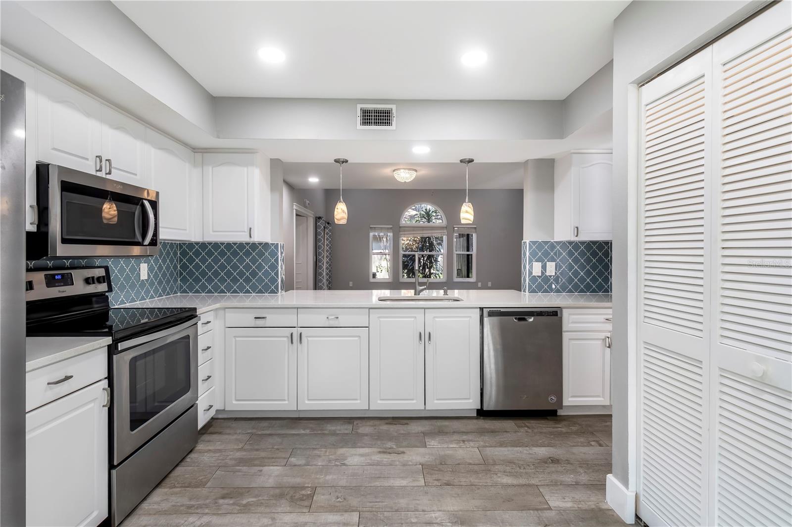 Beautifully renovated and maintained 3BR/2.5BA townhome located in desirable Braemoor Village featuring a first-floor primary suite. Bright and open floor plan with vaulted ceilings, solid wood cabinetry in the kitchen, including the updated appliances, and a sunny eat-in nook. Ground floor spacious primary suite includes a walk-in-closet, ensuite bath with dual sinks, soaking tub, separate shower, and access to a fully enclosed Florida room. Two additional bedrooms and full bath upstairs. Convenient powder room off foyer. Newer A/C (2017), and 2022 Windows. Community amenities include clubhouse and swimming pool. No flood insurance required! Prime Dunedin location near Honeymoon Island State Park, Pinellas Trail, and the desired downtown Dunedin!