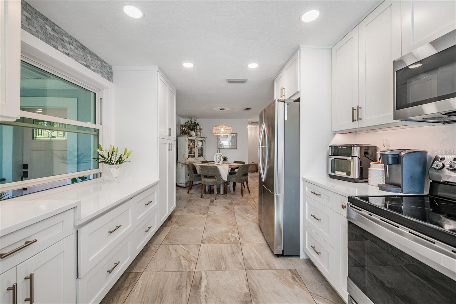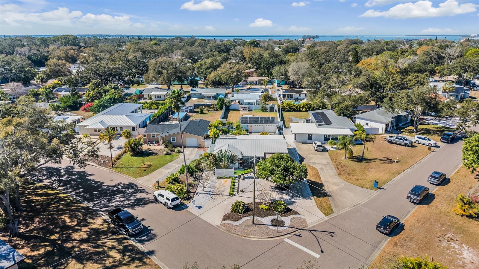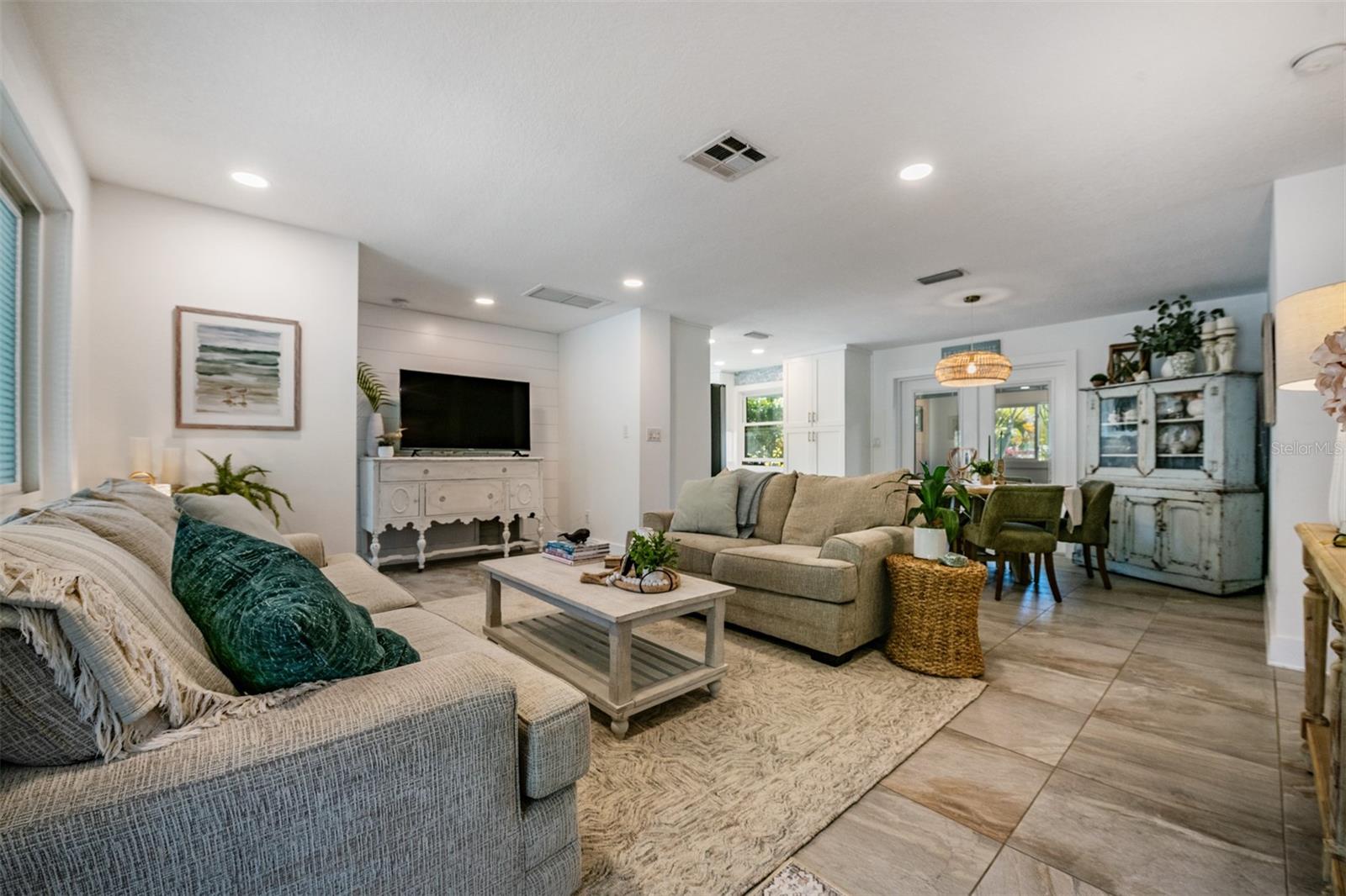 An exceptional opportunity to own this fully renovated, energy-efficient 3-bedroom, 2-bath residence with an oversized 3-car plus detached garage, perfectly positioned on nearly one-third of an acre in one of Pinellas County’s most vibrant and sought-after communities. Thoughtfully redesigned from top to bottom, this home blends modern luxury with long-term durability and efficiency. As you enter off the circular driveway and through the glass front door, a bright, open-concept layout greets you, featuring elegant tile and luxury vinyl wood-look flooring throughout. The 2021 designer kitchen showcases white wood shaker cabinetry with custom pull-out storage, a built-in pantry, quartz countertops, a striking custom tile backsplash, stainless steel appliances, and a convection oven—ideal for both everyday living and entertaining. The primary suite is a private retreat, offering a spa-inspired bathroom with a new vanity and countertop, a large tiled walk-in shower, premium fixtures, and a spacious walk-in closet. The guest bedroom and secondary bathroom have also been updated with new flooring, new vanity, and upscale finishes. The third bedroom offers complete privacy and an oversized walk-in closet, located on the opposite side of the home—perfect for guests, home office, or multigenerational living. Just off the dining area, a large interior laundry room leads to the screened lanai. From there, step outside to a sprawling, park-like fenced backyard featuring paver patios, a Trex deck behind the garage with a newly built pergola, firepit area, new landscape lighting, and ample space to add a resort-style pool. The impressive detached 3-car garage offers abundant storage, a custom-built game room, hurricane-rated doors, front and rear access, and the flexibility to easily convert a portion into a guest house or in-law suite. Three additional storage sheds also convey. This home is loaded with premium infrastructure upgrades including a fully owned solar electric system (average electric bill approximately $40), metal roof and soffits (2015), high-efficiency A/C (2019) with blue light filter, Icynene insulation, hurricane-rated low-E windows and doors, natural gas with on-demand water heater and gas dryer, new PVC plumbing throughout, new stucco and exterior paint on both the home and garage, and a transfer switch with natural gas hookup for a portable generator. Additional improvements include new interior doors, molding and baseboards, upgraded whole-home lighting, and new front and rear landscaping with irrigation system and shallow well pump. Golf cart friendly with direct access to Downtown Dunedin and ideally located near the Pinellas Trail, Honeymoon Island, Historic Dunedin Golf Course, a splash park, Dunedin community center and community pool, highlander park, Hammock Park, world-class beaches, championship golf, shopping, dining, and Tampa International Airport—this is a rare turnkey estate combining lifestyle, luxury, and long-term value. Home is in a NON FLOOD ZONE!
