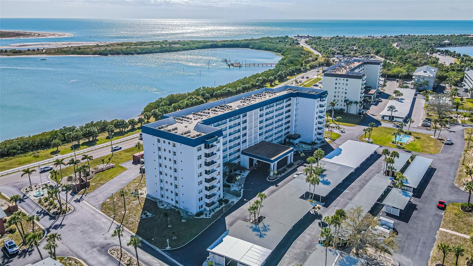 Welcome to “Delightful Dunedin” and your own Tropical Paradise on Honeymoon Island. This 3rd floor, 2 bedroom, 2 bath corner unit condo has been lovingly cared for. This condo offers privacy, comfort, natural light, and all the conveniences in a vibrant 55+ active adult community. Enjoy your balcony nightly as a peaceful space to relax and take in the gentle gulf breezes while watching beautiful skies. The kitchen has been updated and adorned with granite countertops. The large Living/Dining Room has wood floors and overlooks the balcony. In the dining area from floor to ceiling along one wall is a large 13 foot built in buffet for entertaining. Glass doors on the cabinets above show off your dinnerware and collectables. There’s storage below. The condo has a split bedroom plan, the primary retreat has an en-suite bathroom with a walk in jacuzzi tub/shower, a built-in dressing table, one long closet along the hall and an even larger walk-in closet. The community of Royal Stewart Arms features numerous amenities including a large solar heated pool. The clubhouse includes the large main dining and activities area, reminiscent of a view from a cruise ship, with a large fireplace on one end and a large TV on the other. Poker and Ping-Pong tables are stored for your use. The remainder of the clubhouse includes a newly outfitted gym, saunas, baths, pool room, and kitchen. Renovations of the clubhouse are within a few weeks of completion. Fishing pier, tennis/pickleball, bocci, horseshoe, and shuffleboard courts are next to the outdoor benches by the seawall along St. Joseph Sound. Royal Stewart Arms sits right before the entrance to Honeymoon Island State Park on the West and The Dunedin Causeway on the East, which remains a huge attraction with the walkers, runners, and bikers. There are small boats to rent with beaches on both sides. It’s also a goto spot for fisherman, and sunset enthusiasts. Very close by are restaurants, coffee shops, shopping, medical facilities, and Downtown Dunedin. Don’t delay, schedule a viewing today!