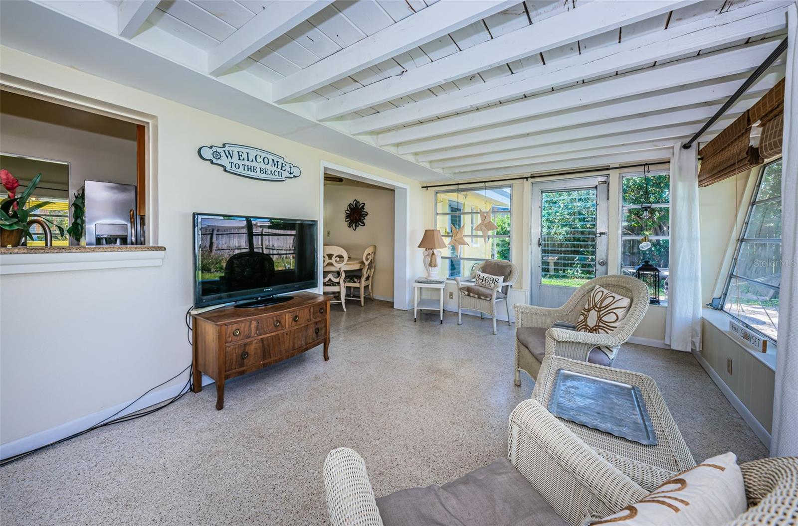 Get your golf cart ready! This mid century modern 2 bedroom 2 bath, 1 car garage block home is located in the waterfront community of Harbor View Villas in the heart of Dunedin. Inside this classic Dunedin charmer, you will find an inviting floor plan with vaulted ceilings, tons of natural light, 2 spacious bedrooms and terrazzo flooring throughout. The updated kitchen is light and bright with solid wood cabinets, granite countertops with undermount sink, soft close drawers & newer stainless steel appliances, and overlooks the backyard. The Florida room provides a peaceful retreat to enjoy your morning coffee while overlooking the lush tropical landscaped fenced-in backyard with room for a pool. There is a detached air conditioned studio that is perfect for an office, art studio or "she shed". Additional features include, 50 year metal roof (2016), newer AC (2020) & washer / dryer. There's plenty of parking for your car and golf cart under the portico, and a side yard big enough to park your boat or RV. Minutes away from Dunedin Golf Course, Honeymoon Island, Pinellas Trail & Hammock Park. All that's left is to grab your bike, boat, or golf cart and start enjoying the friendly Dunedin lifestyle! Don’t miss out on your chance to own a piece of the Dunedin Dream.