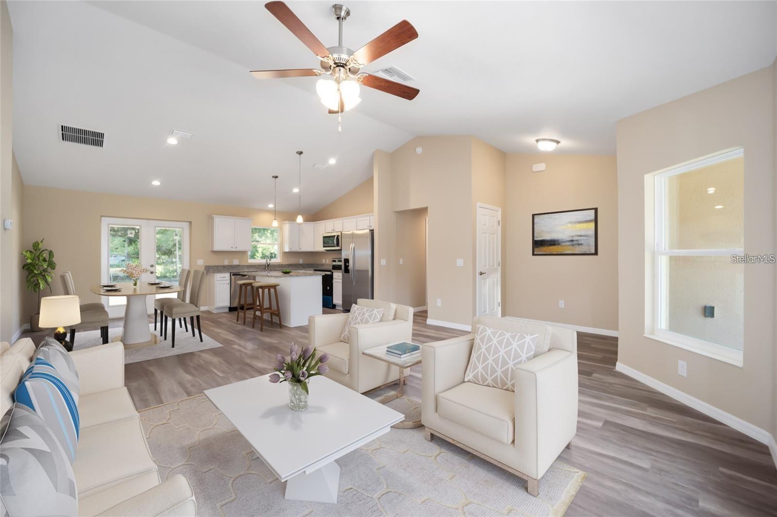 "NEW BUILD" located on one of the most desirable streets in RAINBOW ACRES! This charming 2024 "Lily" Alamo model includes an upgraded porch, and sits on a pristine oversized lot (.95 acres) and features three bedrooms / two bathrooms, an open concept, and split floor-plan. Light and bright throughout, the interior is finished with stainless steel appliances, solid stone countertops in the kitchen/bathrooms, and luxury vinyl flooring throughout. Located just a few short minutes from the beautiful Rainbow Springs, where you can enjoy fishing, boating, camping and so much more. Floor-plan, interior and exterior colors, finishes, and garage orientation may vary for actual home. Information is deemed correct, but no guarantee made- dimension listed are approximate.