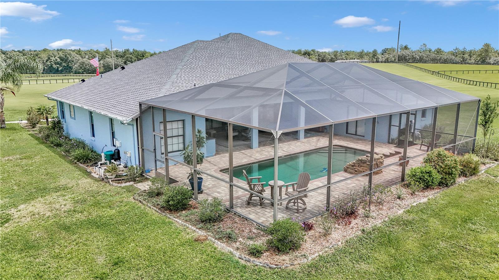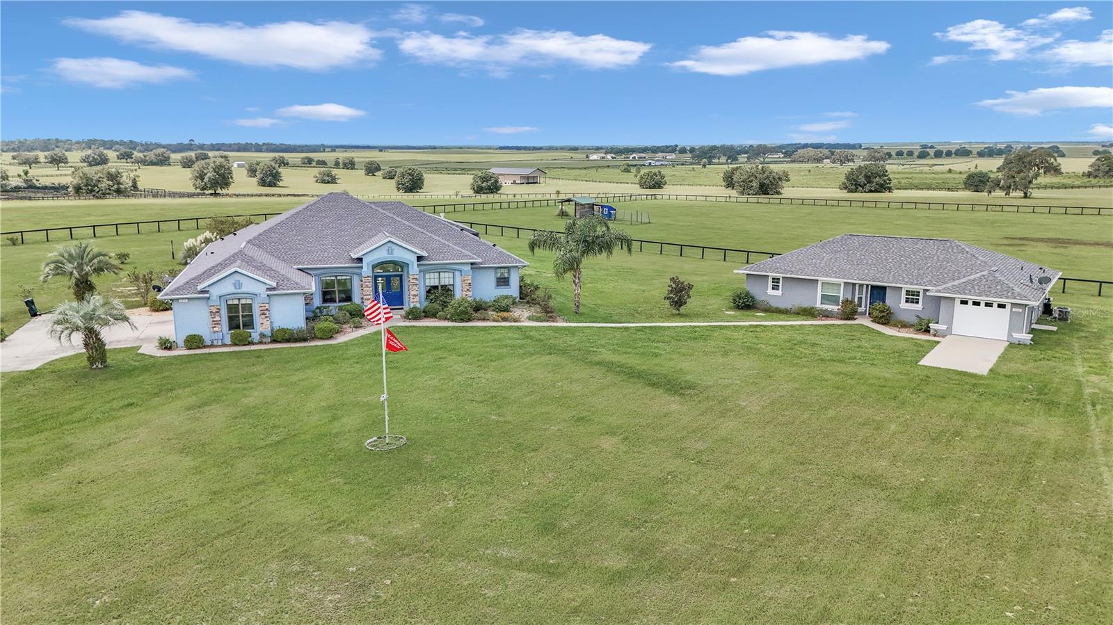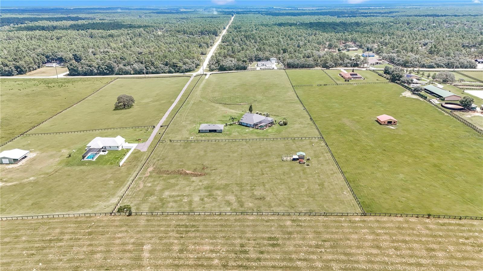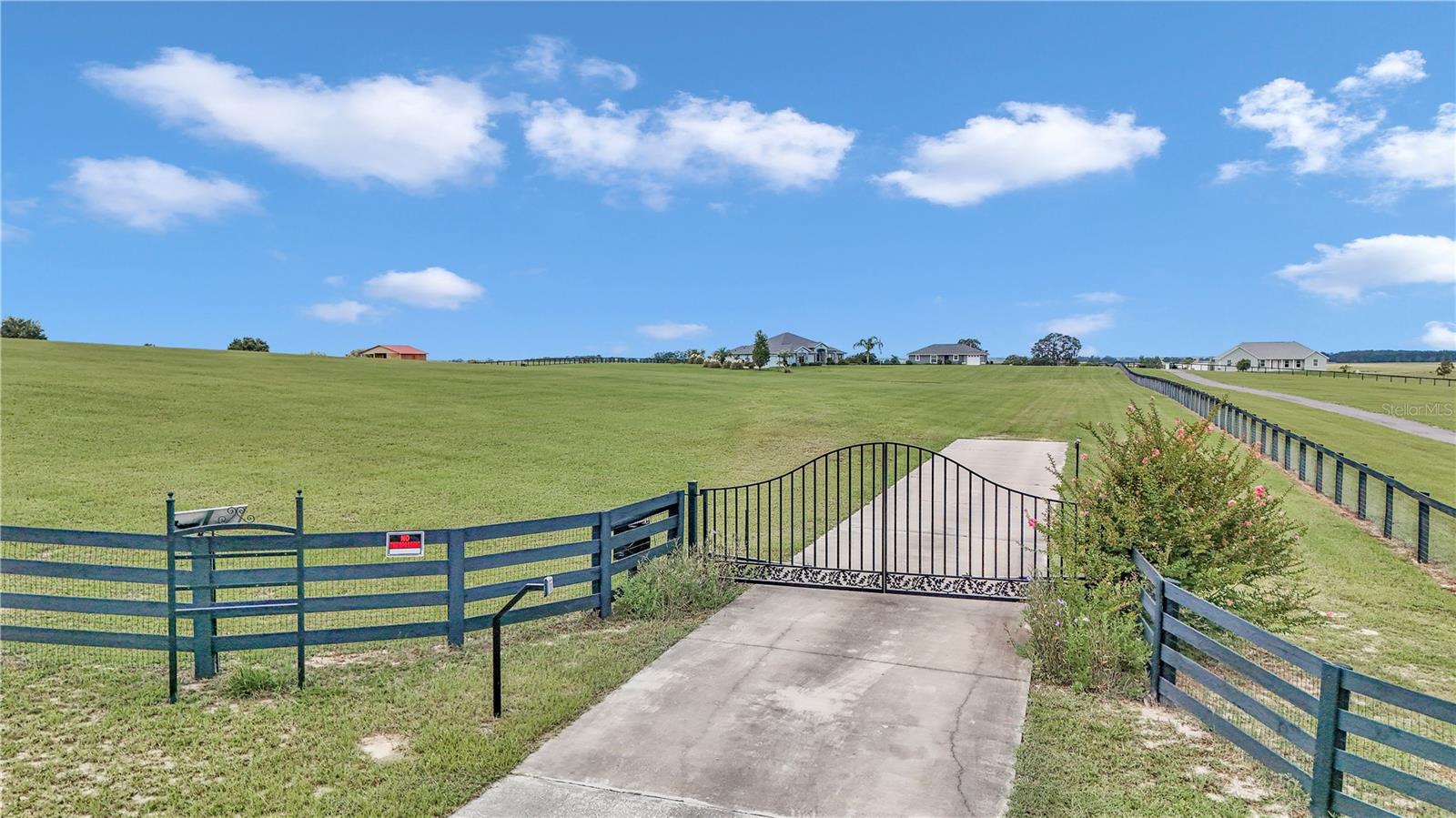 Picturesque, hilltop 10 acre gated property has 2 custom built homes. This 10 acre farm is ready for your custom barn, We’ve already having perimeter, no climb, top board fencing in place .If horses are not your thing, plenty of open space for building a large workshop, and room to roam! This immaculate property offers a large custom home screen in pool and guest home (2020) right next-door. The custom home has a three car garage, spacious open floor plan and overlooks all of property. Step inside to your foyer in the beauty of this spacious, open floor plan! This home has the custom upgrades, such as surroundsound, 10 foot ceilings, tray and crown molding. There is a central vacuum system as well. When you enter through the foyer to the right, you will find a used as an office not included in the four bedrooms in the rest of the home. Continue from the foyer to a large, inviting living room with views of the screened in pool! To the left, you have a gorgeous, formal dining room with tray ceilings just off the kitchen. The kitchen features, custom, oak, cabinetry, stainless steel appliances, an upgraded wine cooler for your convenience. There is an island as well for preparation and granite countertops throughout. Steps away from the kitchen is a seamless glass window overlooking the pool in this space is used as a second dining area or breakfast room. You will find the laundry room situated perfectly with washer and dryer and utility sink. The three secondary bedrooms are on the far left-hand side of the home. Two of the bedrooms share a bath, with a third bedroom, being an en suite with its own bathroom and the bedroom. This third bedroom has a double sliding leading out to the covered lanai. This is a split bedroom plan with the primary bedroom being on the far right back corner of this beautiful home. The primary bedroom features luxury vinyl plank, 2018, his in her closets, and a slide out to the covered lanai. The primary bedroom is oversized and can easily accommodate an additional area for a sitting room for great place for exercise equipment, overlooking the pool! The primary bath has large, soaking tub, tile, shower, and 42 inch double vanity. The pool was built in 2011. it is an extension of the lanai with custom patio and waterfall. Main home has 2023 new architectural roof! The pool is screened in and has a step up sundeck. Pavers were replaced in 2021. 2019 AC, 2006 hot water heater. Home has water softener and is on Well and Septic. The guest home was built in 2020 and is practically new. It offers two bedrooms and two bath at 1291 ft.² with a one car garage. The washer and dryer are located in the garage. Is an open floor plan with living room, dining area, and Kitchen with stainless steel appliances, and lighting and peninsula island with room for a few barstools. Leaning from the spacious open floor plan out the back sliding doors leads to screen in covered lanai. This area overlooks the fenced paddock with auto waterer, run in and chicken coop. The primary bedroom is spacious and has its own bathroom with walk-in tile shower with glass door and handicap bar. The second bedroom is equally as impressive with surround tile shower and glass door. This home is all 2020 luxury vinyl plank. Roof, AC and hot water heater all 2020.Current owner took care of all the details with their being 2 Wells and 2 Septics. This beautiful property is minutes from classic mile and about 15 minutes to the world equestrian center!