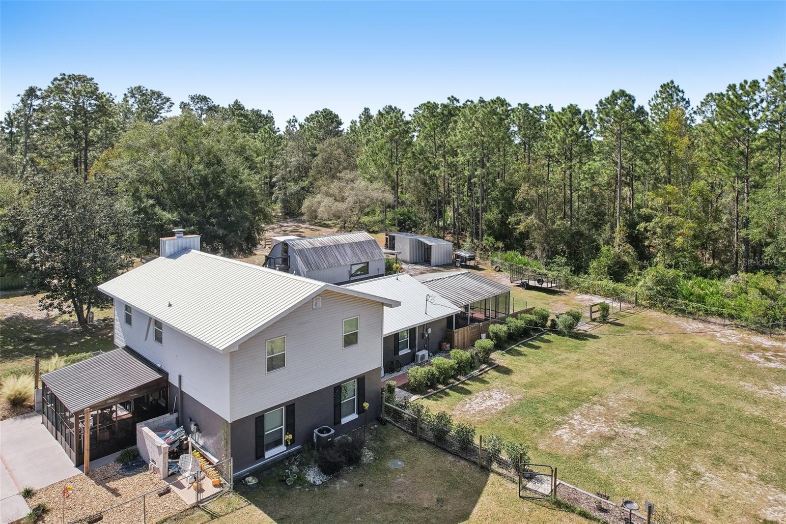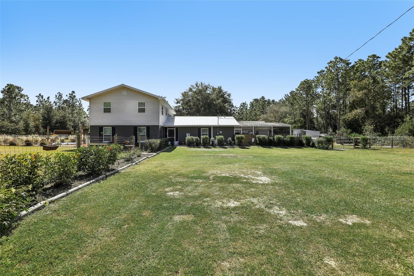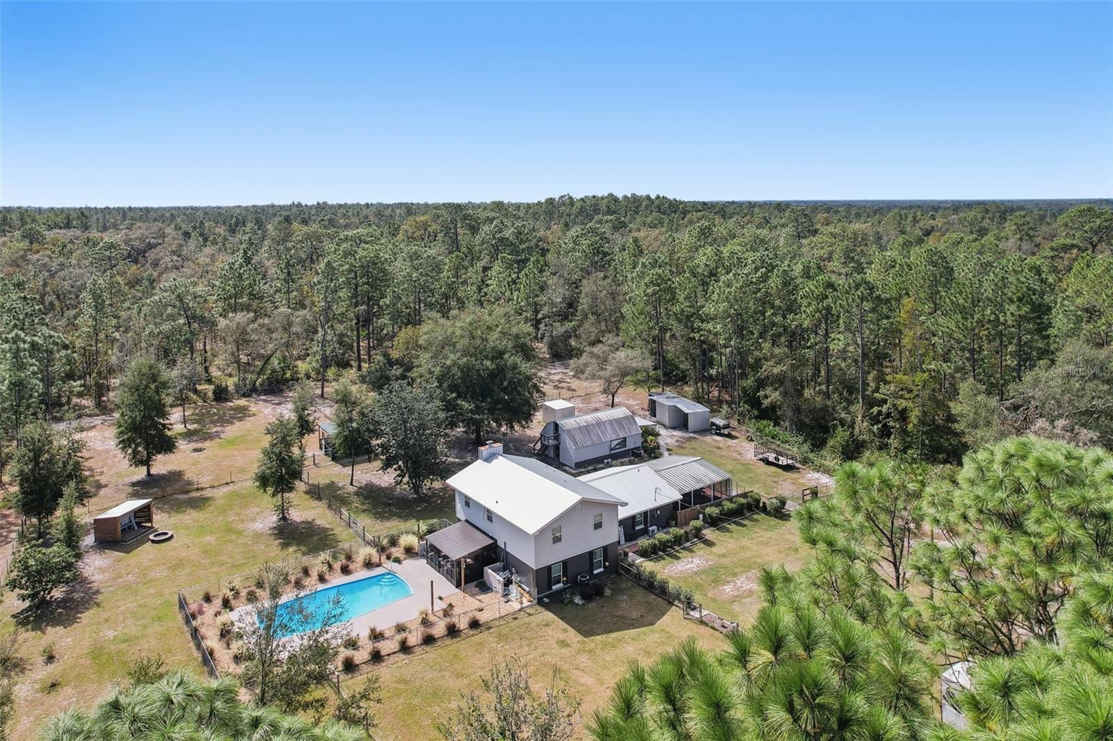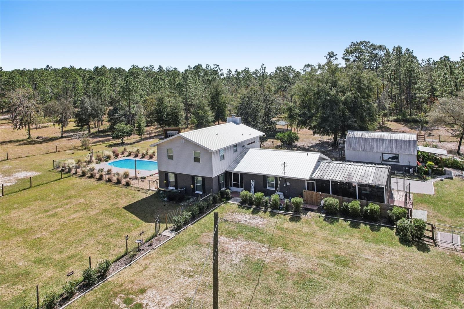 HIGH AND DRY - FLOOD ZONE X . This stunning 5-bedroom, 3.5-bathroom single-family residence provides 2,287 sq ft of spacious living on a remarkable 3.75-acre lot, which includes two separate parcels. The property is fully fenced and cross-fenced, providing ample opportunities for raising animals or enjoying the great outdoors. The home boasts with two master suites with ensuites. There's even the potential to build a guest home on the lot with the primary residence or construct a home on the adjacent parcel—endless possibilities await! Inside, you'll find elegant laminate flooring throughout the common areas, complemented by cozy carpet in the bedrooms for added comfort. The living room seamlessly connects to the formal dining room, creating an inviting flow for entertaining. The upgraded kitchen boasts modern stainless steel appliances, making meal prep a delight. Recent renovations include a metal roof, 14 replaced windows, a new HVAC system, and a refreshed kitchen. Step outside to your private lanai, where you can unwind while overlooking the expansive property and the sparkling in-ground pool, complete with recently replaced equipment (2022). Enjoy the fully screened-in sunroom that provides the perfect view of the pool and property. Additional features include a fully screened-in carport attached to the house, a 30x50 barn with lofted storage galore, and an outhouse that includes a lighted workshop/shed with electrical and a built-in workbench. For animal lovers, there’s a fully equipped chicken or animal house with lighting and electrical amenities. The acreage provides the potential to be split, zoned for a second parcel, or a mother-in-law suite, giving you endless possibilities! For those with an RV or other recreational needs, there are two 50 AMP RV hookups. The separate building on the property features HVAC and second-floor storage, while the well pump and pressure tank were replaced in 2022. The septic tank and field were also replaced in 2022, enhancing the home’s efficiency. High-speed internet provides you with the perfect opportunity to work from home, and you’re just minutes away from Dunnellon and Ocala for shopping, dining, and entertainment. This home combines comfort, style, and the perfect outdoor lifestyle!