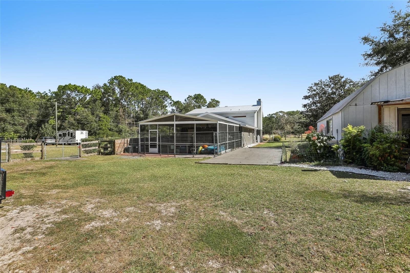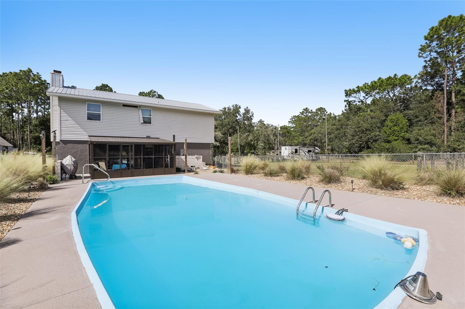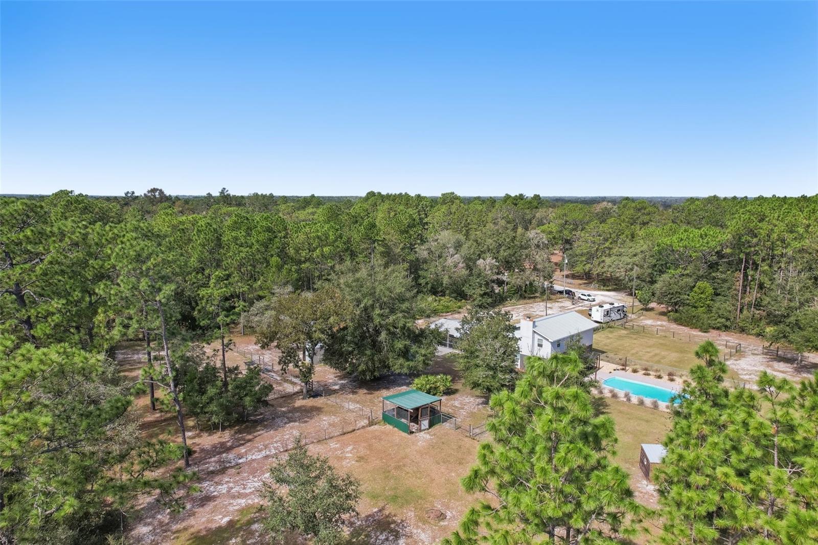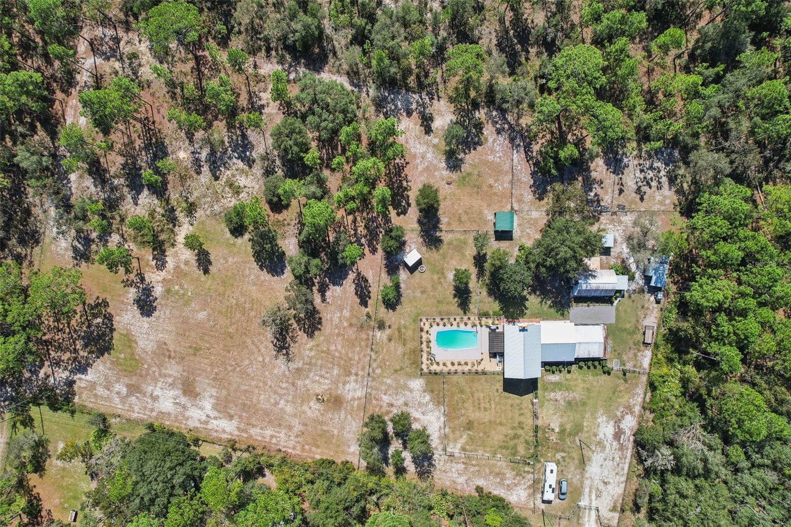 HIGH AND DRY - FLOOD ZONE X . This stunning 5-bedroom, 3.5-bathroom single-family residence provides 2,287 sq ft of spacious living on a remarkable 3.75-acre lot, which includes two separate parcels. The property is fully fenced and cross-fenced, providing ample opportunities for raising animals or enjoying the great outdoors. The home boasts with two master suites with ensuites. There's even the potential to build a guest home on the lot with the primary residence or construct a home on the adjacent parcel—endless possibilities await! Inside, you'll find elegant laminate flooring throughout the common areas, complemented by cozy carpet in the bedrooms for added comfort. The living room seamlessly connects to the formal dining room, creating an inviting flow for entertaining. The upgraded kitchen boasts modern stainless steel appliances, making meal prep a delight. Recent renovations include a metal roof, 14 replaced windows, a new HVAC system, and a refreshed kitchen. Step outside to your private lanai, where you can unwind while overlooking the expansive property and the sparkling in-ground pool, complete with recently replaced equipment (2022). Enjoy the fully screened-in sunroom that provides the perfect view of the pool and property. Additional features include a fully screened-in carport attached to the house, a 30x50 barn with lofted storage galore, and an outhouse that includes a lighted workshop/shed with electrical and a built-in workbench. For animal lovers, there’s a fully equipped chicken or animal house with lighting and electrical amenities. The acreage provides the potential to be split, zoned for a second parcel, or a mother-in-law suite, giving you endless possibilities! For those with an RV or other recreational needs, there are two 50 AMP RV hookups. The separate building on the property features HVAC and second-floor storage, while the well pump and pressure tank were replaced in 2022. The septic tank and field were also replaced in 2022, enhancing the home’s efficiency. High-speed internet provides you with the perfect opportunity to work from home, and you’re just minutes away from Dunnellon and Ocala for shopping, dining, and entertainment. This home combines comfort, style, and the perfect outdoor lifestyle!