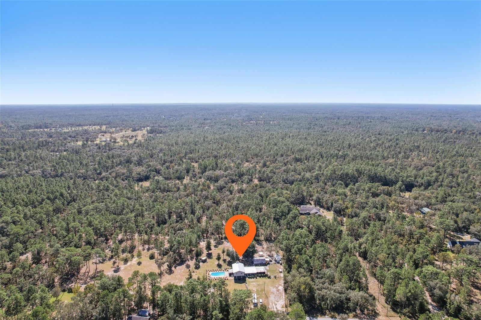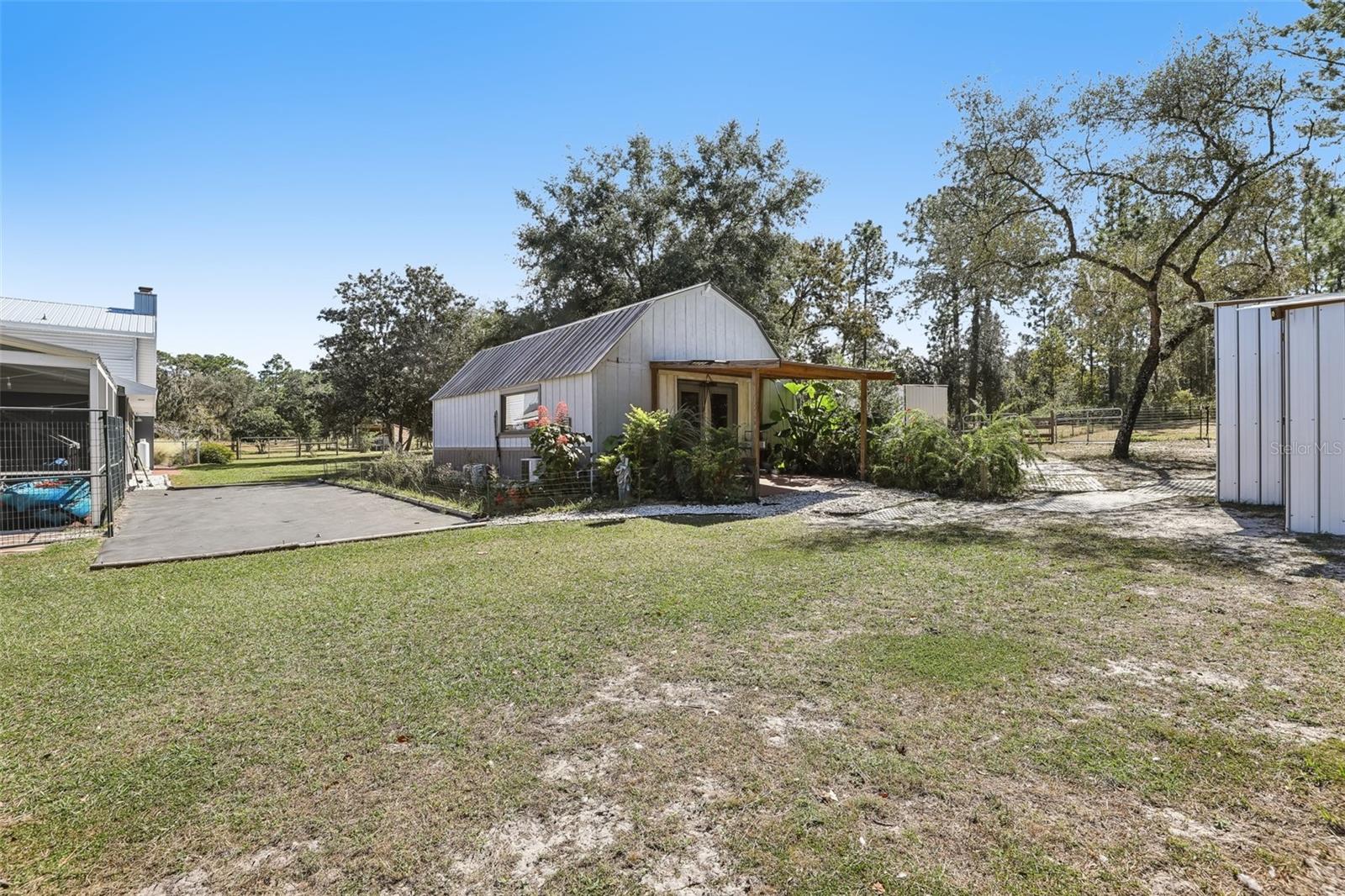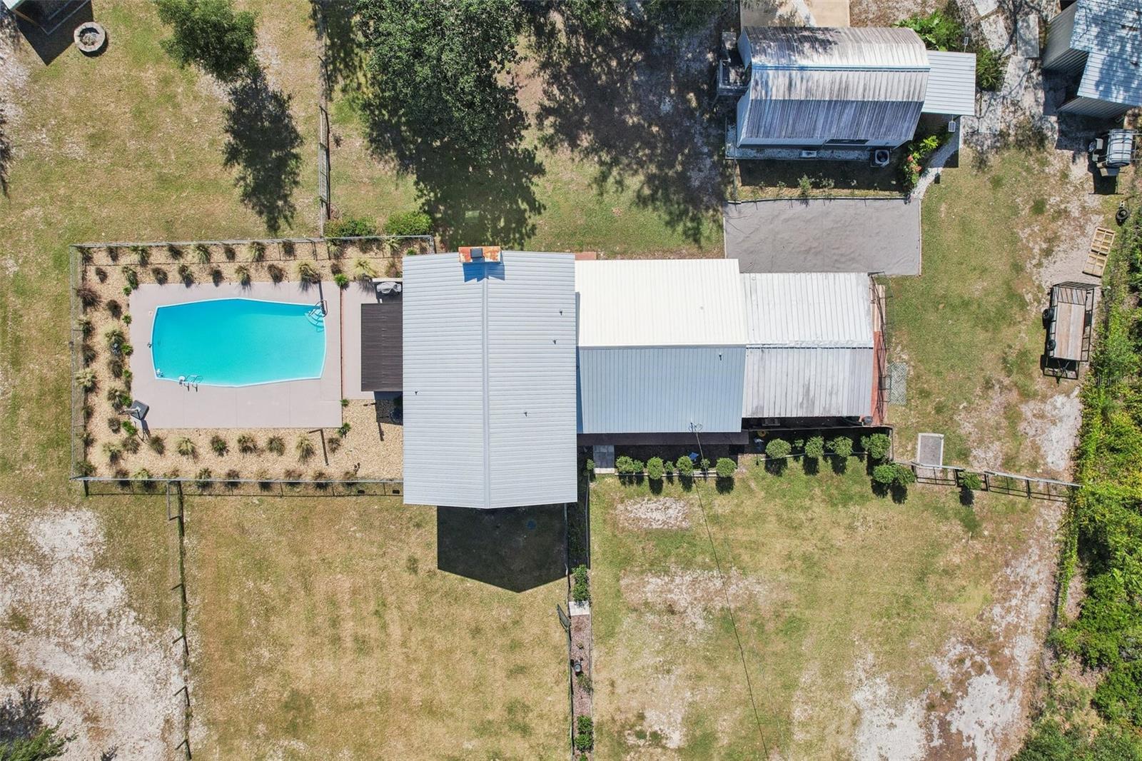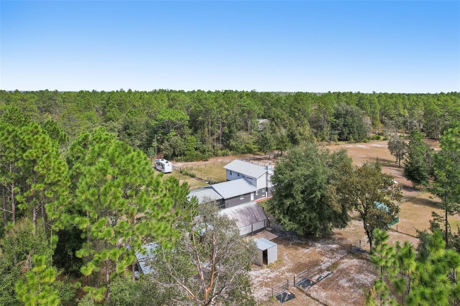 HIGH AND DRY - FLOOD ZONE X . This stunning 5-bedroom, 3.5-bathroom single-family residence provides 2,287 sq ft of spacious living on a remarkable 3.75-acre lot, which includes two separate parcels. The property is fully fenced and cross-fenced, providing ample opportunities for raising animals or enjoying the great outdoors. The home boasts with two master suites with ensuites. There's even the potential to build a guest home on the lot with the primary residence or construct a home on the adjacent parcel—endless possibilities await! Inside, you'll find elegant laminate flooring throughout the common areas, complemented by cozy carpet in the bedrooms for added comfort. The living room seamlessly connects to the formal dining room, creating an inviting flow for entertaining. The upgraded kitchen boasts modern stainless steel appliances, making meal prep a delight. Recent renovations include a metal roof, 14 replaced windows, a new HVAC system, and a refreshed kitchen. Step outside to your private lanai, where you can unwind while overlooking the expansive property and the sparkling in-ground pool, complete with recently replaced equipment (2022). Enjoy the fully screened-in sunroom that provides the perfect view of the pool and property. Additional features include a fully screened-in carport attached to the house, a 30x50 barn with lofted storage galore, and an outhouse that includes a lighted workshop/shed with electrical and a built-in workbench. For animal lovers, there’s a fully equipped chicken or animal house with lighting and electrical amenities. The acreage provides the potential to be split, zoned for a second parcel, or a mother-in-law suite, giving you endless possibilities! For those with an RV or other recreational needs, there are two 50 AMP RV hookups. The separate building on the property features HVAC and second-floor storage, while the well pump and pressure tank were replaced in 2022. The septic tank and field were also replaced in 2022, enhancing the home’s efficiency. High-speed internet provides you with the perfect opportunity to work from home, and you’re just minutes away from Dunnellon and Ocala for shopping, dining, and entertainment. This home combines comfort, style, and the perfect outdoor lifestyle!