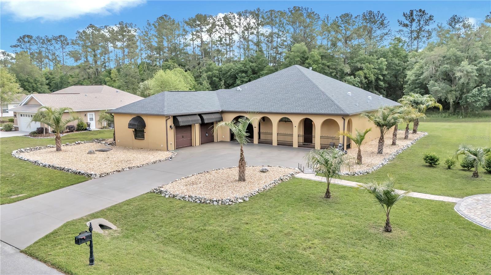 This amazing home exhibits it's beautiful Mediterranean artistry from the moment you round the bend of this upscale, Dunnellon riverfront neighborhood. 2 separate owner's suites. The curb appeal asks what's not to love about this home, lovingly dubbed "My Adobe Hacienda" after the song, by the designer/owner. This home flouts one's common perception of expectations while giving you so much more than you can imagine! The discerning new owner will appreciate the hurricane tolerance level of this home design of few windows, solar tubes providing free lighting, backup generator & the owned solar system, providing electric around $30 mo. Primary's closet rivals many bedrooms in size, 11 X 13 pantry w/ built in shelving. Designed to accommodate nearly everyone, the accessibility features include no interior doors, lovely archways, shower grab bars, raised commodes, a safe step style walk in tub, lowered oven and the undermount refrigerator drawers just to name a few. You will love the flow of this home as it feels endless. Primary suite includes 15 X 12 office, access to the lanai, 4 fixture en suite & the laundry. It's nearly a house within a house. 2nd bedroom suite, 15 X 22, is accessible from the front open atrium patio & has walk in closet & en suite. Gas fireplaces in LR & primary suite. The sprawling great room includes ceiling fans, floor outlets, dining space & dual sets of decorative French doors to lanai w/ a summer kitchen. Immaculate side entry garage w/ large storage closet, & a convenient powder room just inside the home. Professional landscaping w/ lovely rock beds & palms adorn exterior of home. 1/2 acre parcel to right is included in purchase & includes mature landscaping a carved tiki & firepit patio. Located just a minute or two off the bike trail & 5 mins to downtown Dunnellon, 15 mins or less to the Rainbow River. "In my adobe hacienda life and love are more complete & harmony is everywhere." You won't believe it until you see it, schedule your tour today!