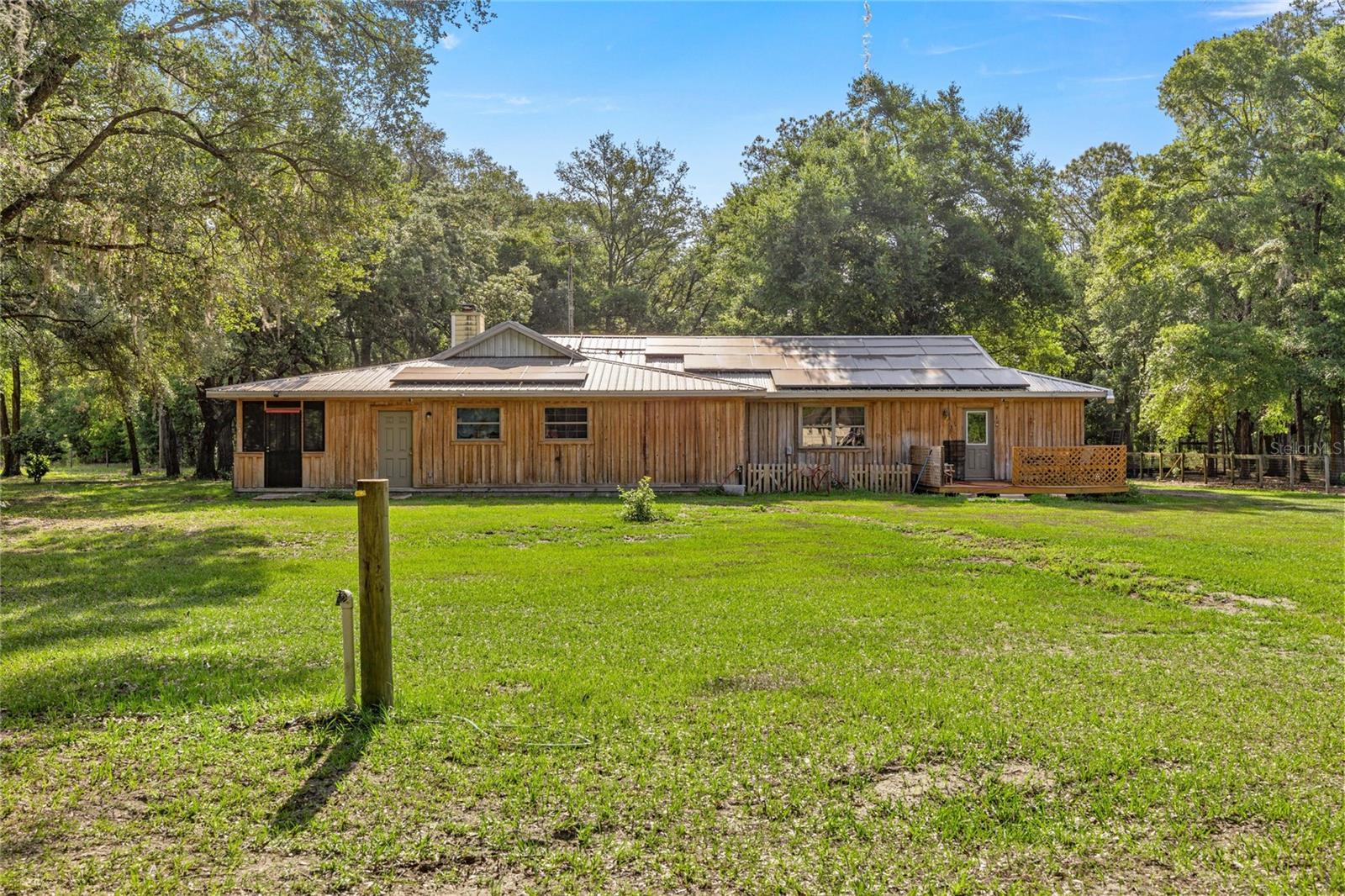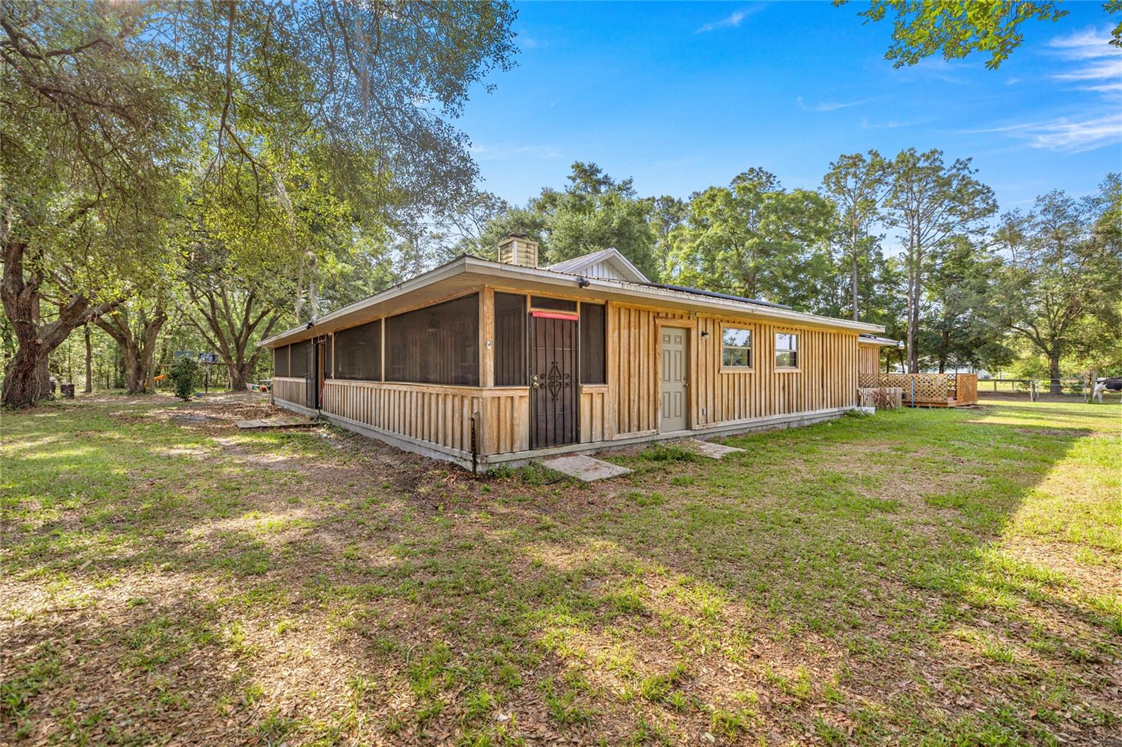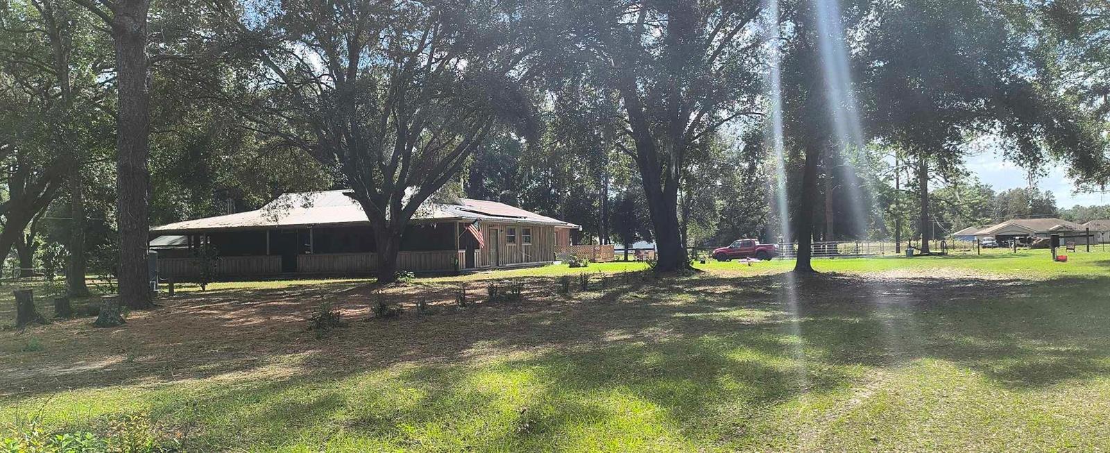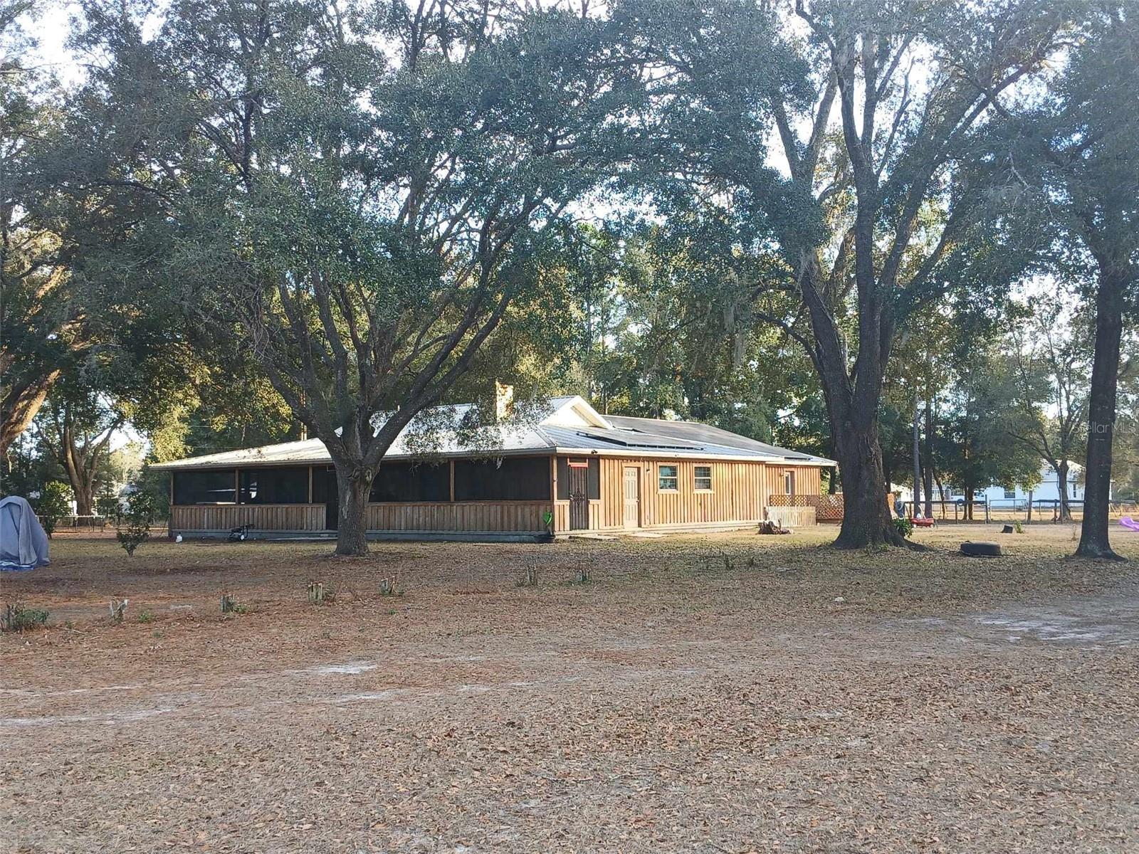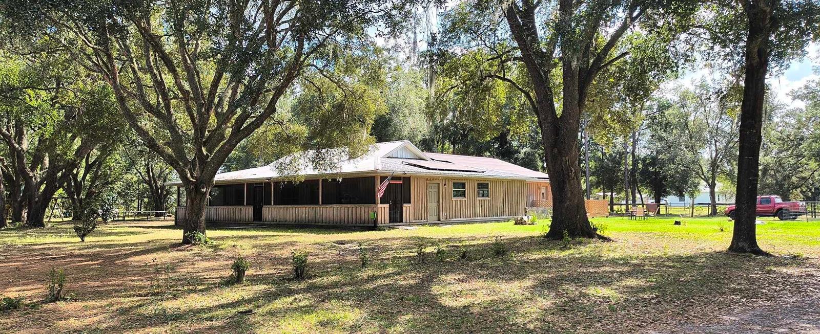If you're looking for your forever home don't miss this Approximately 5 acres are zoned Agriculture. Additional approximately 3 acres with building lots available for additional price. Check this home with NO HOA. Approximately 15 mins from WEC, 25 mins from Florida Horse Park, 20 mins from HITS, 10 minutes from, shopping, the Rainbow River and other amenities. One-of-a-kind custom-built home is three-bedroom two bath and has a country feel with a wraparound screen porch covered. Exterior is constructed of unique Cypress Wood. Updated with 2 ,3.5-ton heat and a/c units. Step inside the front door into the spacious living room area. High ceilings and Enough space to have an office or a game room. The large kitchen and joining formal dining room comes complete with wood burning fireplace, huge closet/pantry area, 2 sets of French doors to the covered porch. Updated oak cabinets with newer appliances including range, dishwasher, refrigerator. Ample counter space, including a bar. Two generous size bedrooms with a jack and Jill bathroom. Laundry room with newer washer and dryer, even a newer water heater with a door to access the covered porch. A primary bedroom that has a big bathroom and a massive closet with a door to the front yard. Bathroom includes a beautifully tiled shower with a seat, a waterfall showerhead with the option to switch to a wand. The property includes an industrial well pump, with multiple water faucets throughout the property. Solar panels help keep this economical. 2600 square-foot shop with concrete floors for easy cleanup. High ceilings and doors, enclosed room perfect for storage, workshop or barn. Surrounded by large oak trees that provide privacy. Also included is a shed with attached lean two on one side and a chicken coop on the other. Entire property is fenced and cross fenced. Several pastures perfect for cows/horses even perfect for a garden. There is plenty of parking area! It's a Must See!!!
