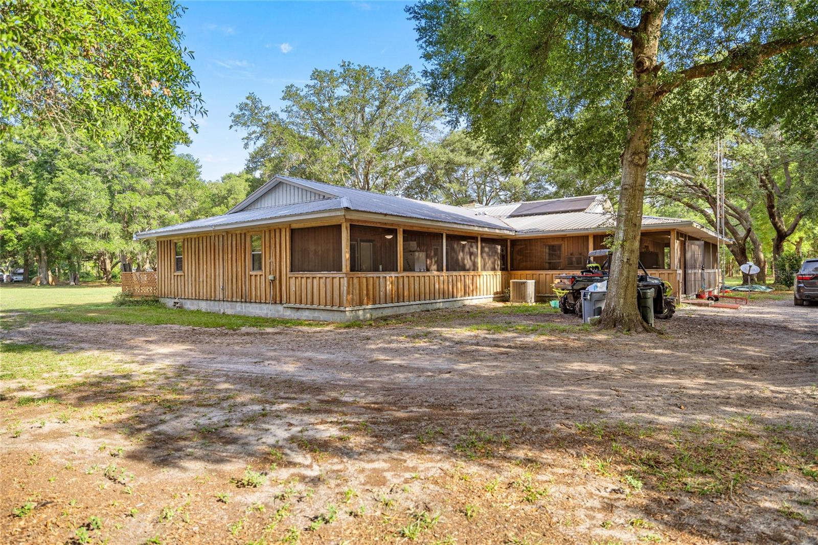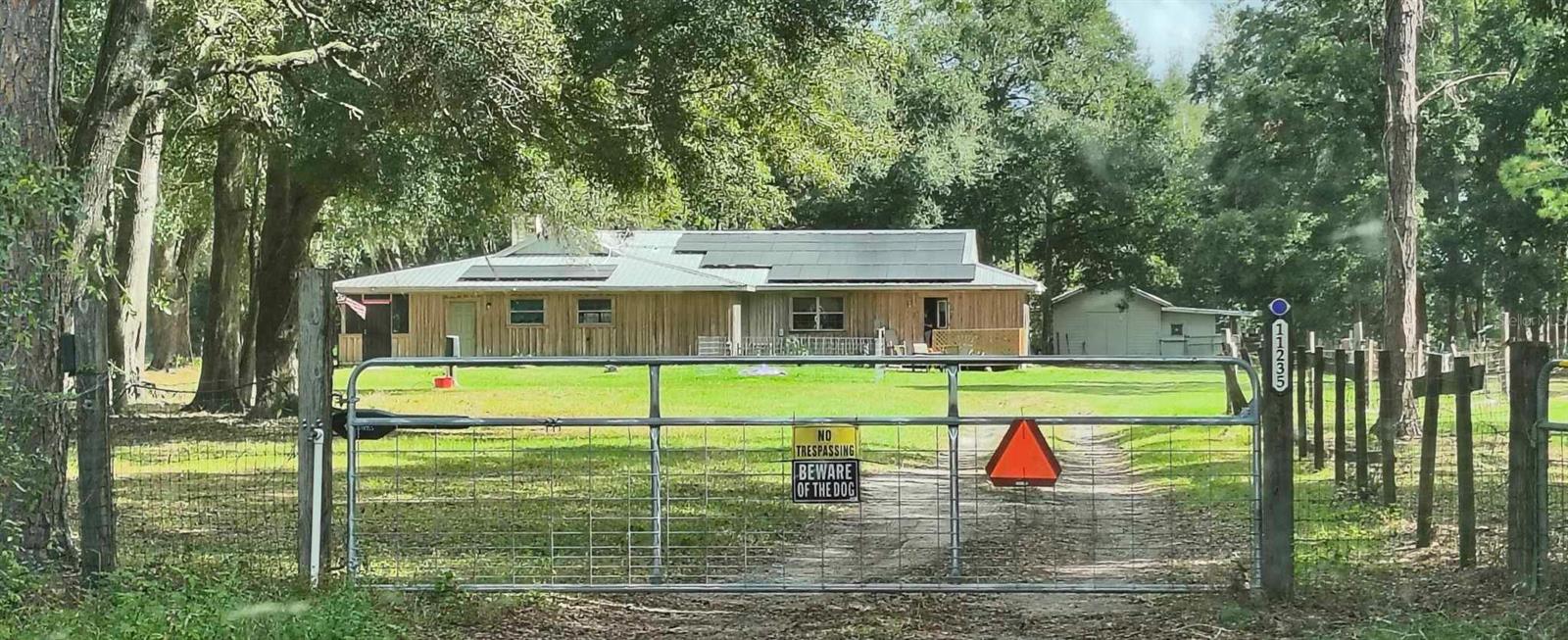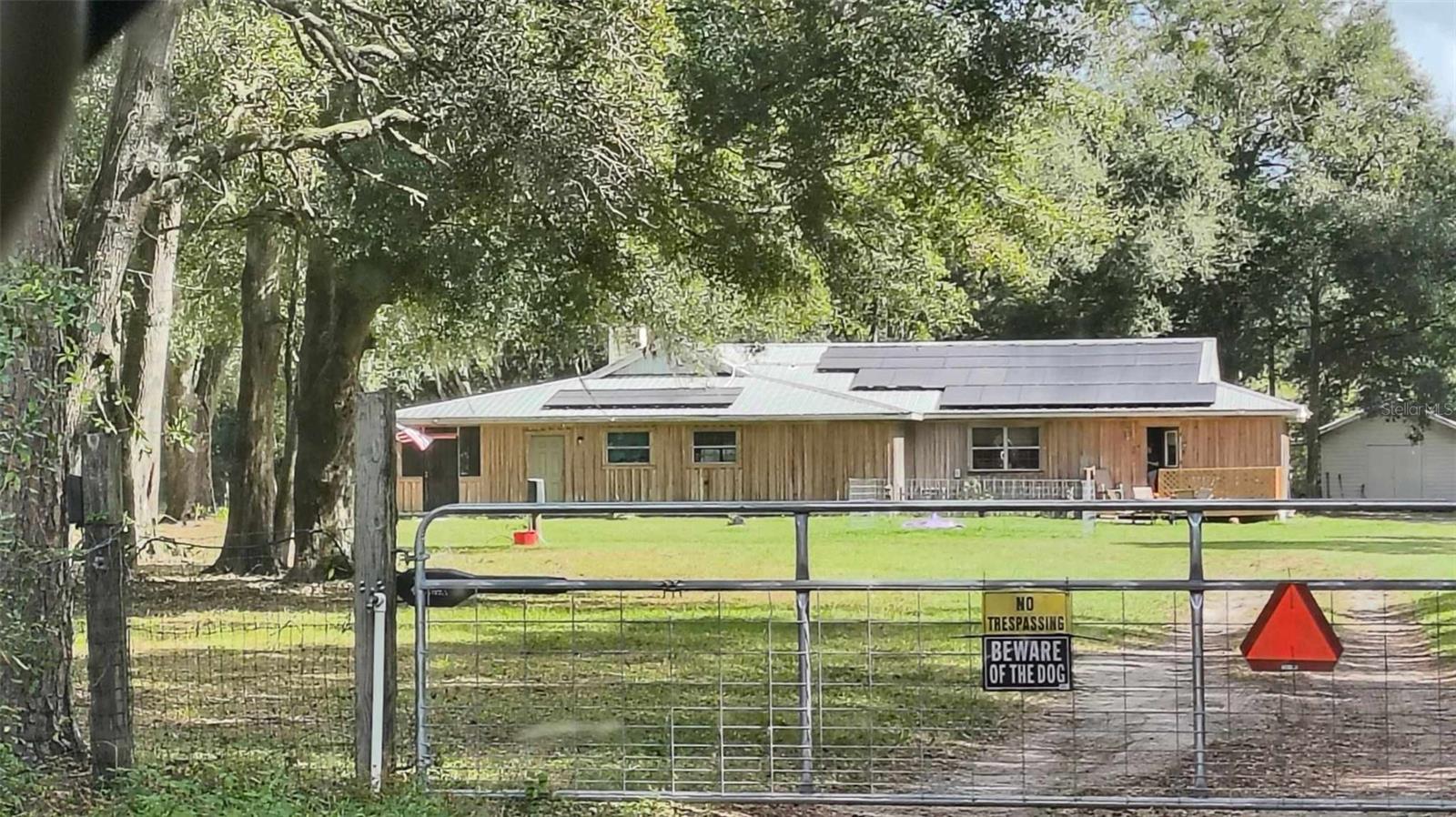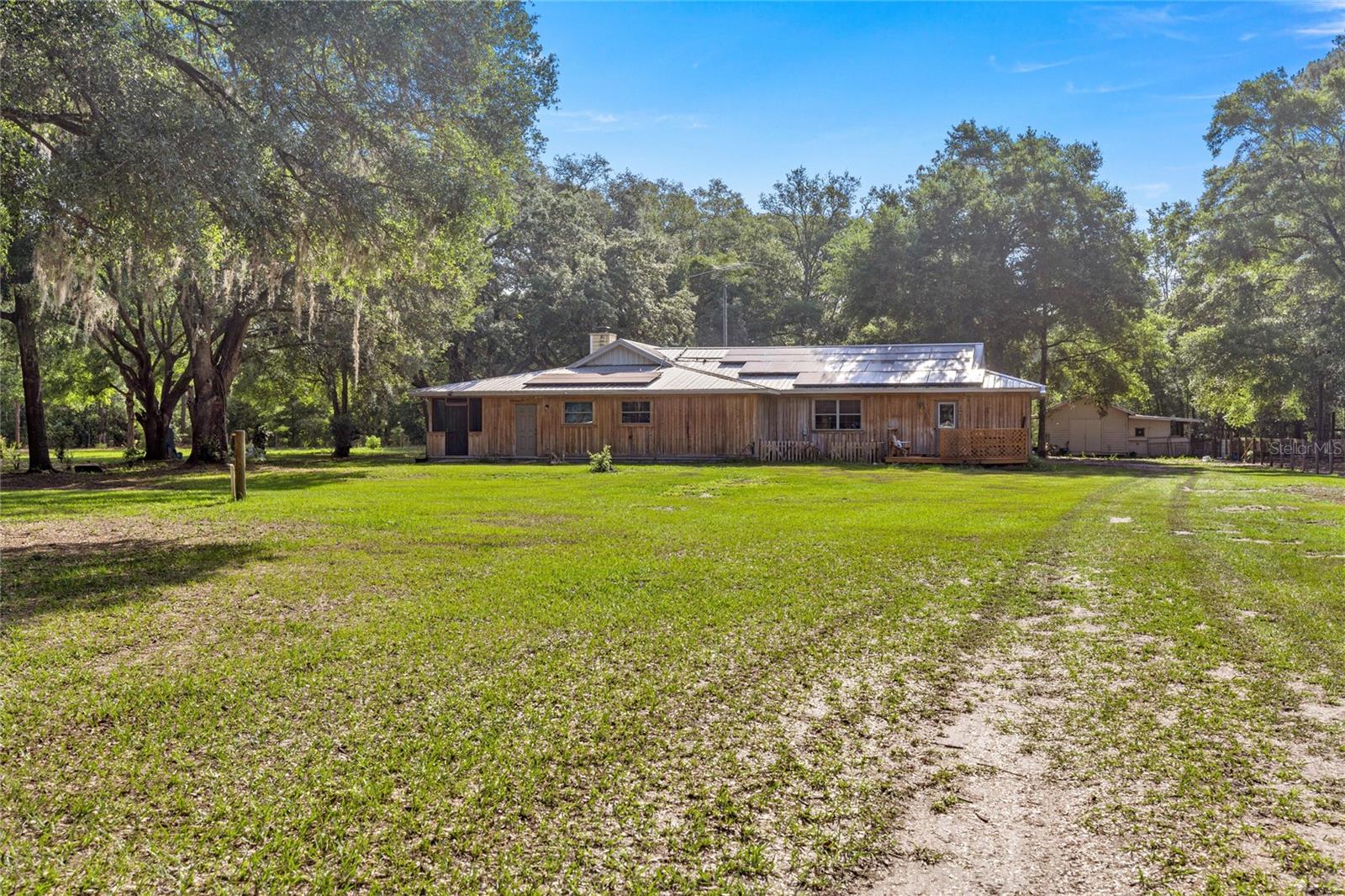 If you're looking for your forever home don't miss this Approximately 5 acres are zoned Agriculture. Additional approximately 3 acres with building lots available for additional price. Check this home with NO HOA. Approximately 15 mins from WEC, 25 mins from Florida Horse Park, 20 mins from HITS, 10 minutes from, shopping, the Rainbow River and other amenities. One-of-a-kind custom-built home is three-bedroom two bath and has a country feel with a wraparound screen porch covered. Exterior is constructed of unique Cypress Wood. Updated with 2 ,3.5-ton heat and a/c units. Step inside the front door into the spacious living room area. High ceilings and Enough space to have an office or a game room. The large kitchen and joining formal dining room comes complete with wood burning fireplace, huge closet/pantry area, 2 sets of French doors to the covered porch. Updated oak cabinets with newer appliances including range, dishwasher, refrigerator. Ample counter space, including a bar. Two generous size bedrooms with a jack and Jill bathroom. Laundry room with newer washer and dryer, even a newer water heater with a door to access the covered porch. A primary bedroom that has a big bathroom and a massive closet with a door to the front yard. Bathroom includes a beautifully tiled shower with a seat, a waterfall showerhead with the option to switch to a wand. The property includes an industrial well pump, with multiple water faucets throughout the property. Solar panels help keep this economical. 2600 square-foot shop with concrete floors for easy cleanup. High ceilings and doors, enclosed room perfect for storage, workshop or barn. Surrounded by large oak trees that provide privacy. Also included is a shed with attached lean two on one side and a chicken coop on the other. Entire property is fenced and cross fenced. Several pastures perfect for cows/horses even perfect for a garden. There is plenty of parking area! It's a Must See!!!