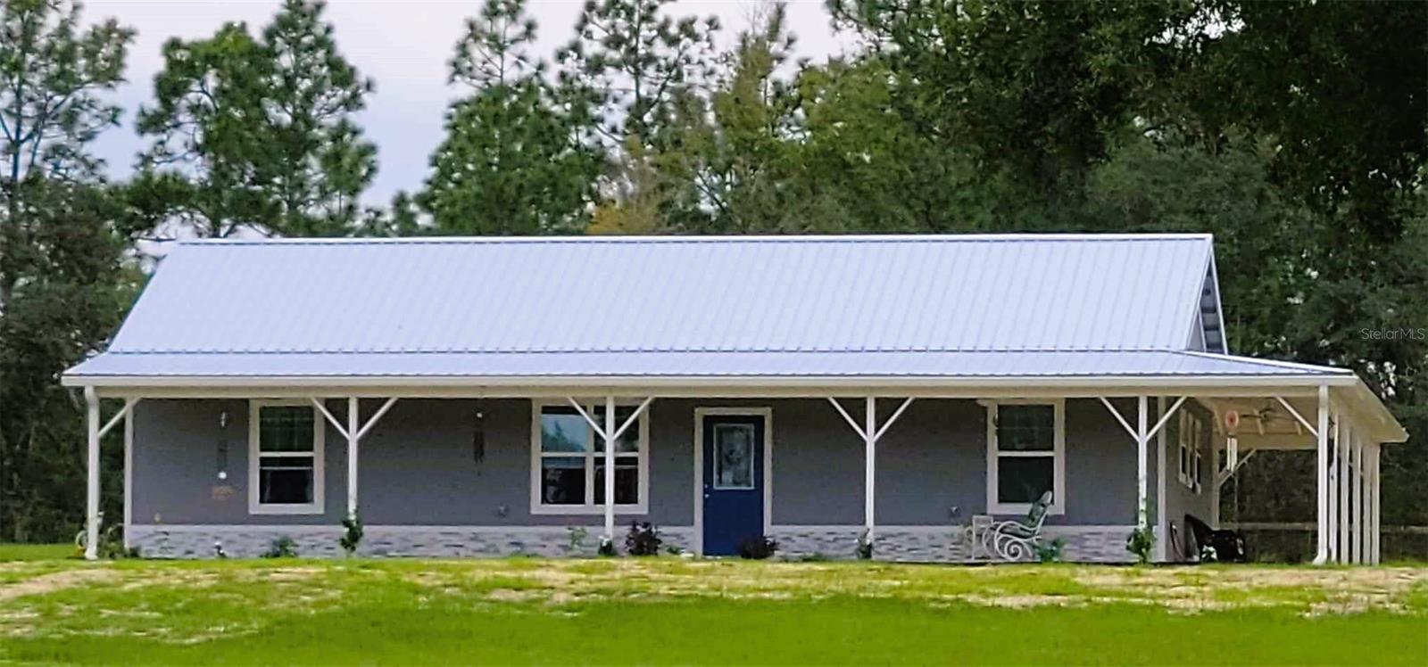 Charming 5-Acre Mini Farm with Custom Ranch-Style Home Nestled on 5 acres, this beautiful 2023-built ranch-style home offers 3 spacious bedrooms and 2 bathrooms. Featuring a durable metal roof and a large wraparound porch, it’s perfect for entertaining or enjoying quiet moments with stunning sunset views. Step inside through elegant French doors to a custom kitchen with granite countertops, a farm sink, stainless steel appliances, ceiling-height cabinets, custom lighting, and a large island—ideal for family gatherings or hosting guests. A charming barn door leads to the laundry room, complete with extra storage and a tankless hot water heater for unlimited hot water. The master suite boasts a walk-in closet with custom shelving and a luxurious bath with dual sinks and a large walk-in shower. The split floor plan includes luxury vinyl plank flooring throughout, tiled bathrooms, three additional storage closets, and ceiling fans in every room. Enjoy peace of mind with a whole-house water filtration system and 400-amp electrical service. Outside, unwind in your private above-ground pool on warm afternoons. The fully equipped center-isle barn features four 12x12 stalls, a feed room, wash racks, and an air-conditioned tack room. Two pastures, three pens, gives you everything you need for livestock and outdoor hobbies. Additional features include two RV hookups and a 20x40x14 metal building for RV or trailer parking. Conveniently located on a paved road, you're just minutes away from Ocala, Dunnellon, the World Equestrian Center, and Rainbow Springs. This is a must-see property that combines comfort, style, and functionality—schedule a tour today!