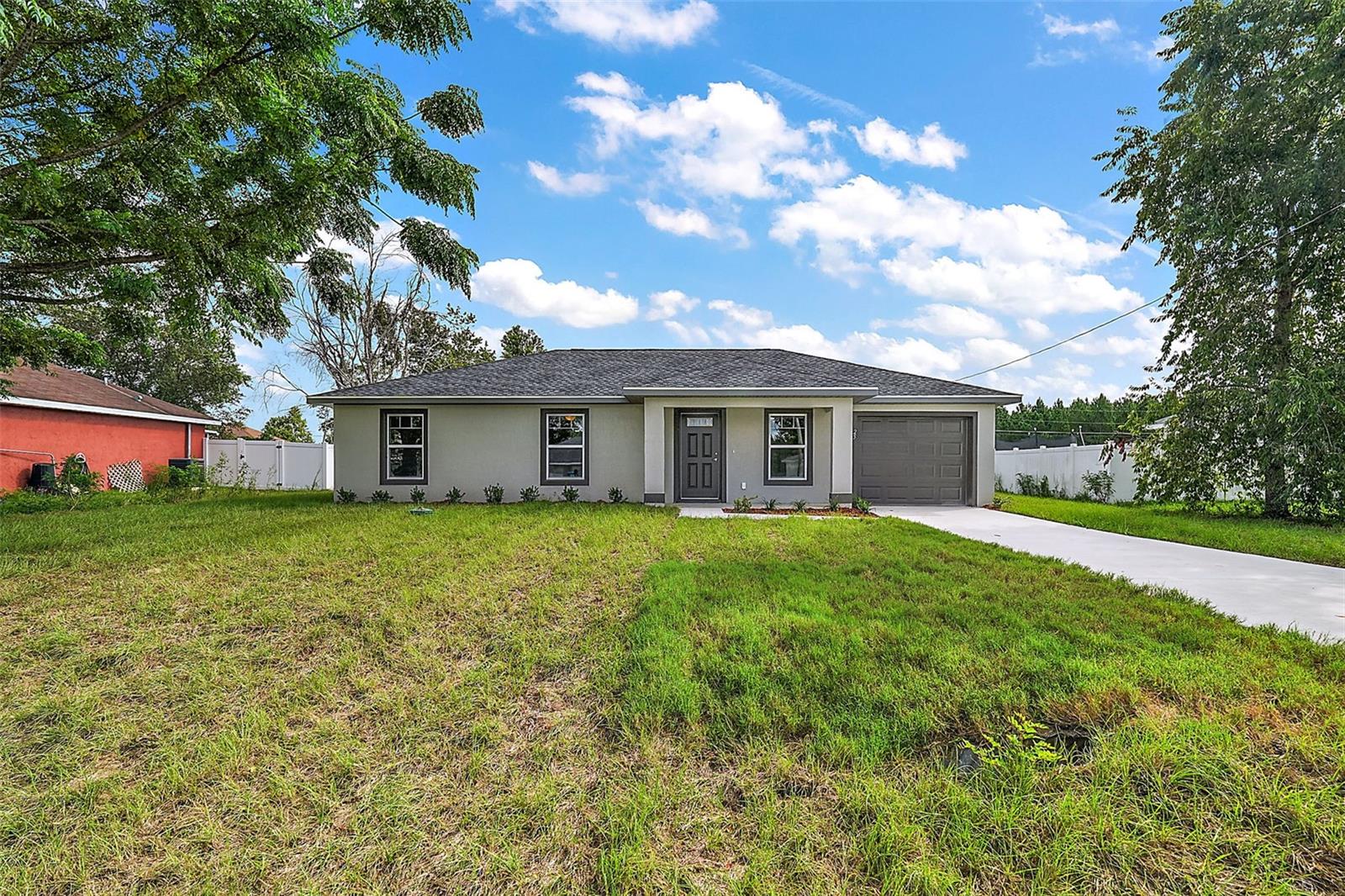 Excellent and affordable new construction that is completed and move-in ready. This conveniently located concrete block and stucco home features ample kitchen cabinetry, vaulted ceilings and luxury vinyl plank flooring throughout. Kitchen features granite counters, soft close shaker style cabinets and stainless appliances. Upgraded plumbing fixtures, lighting and fans. Lots of storage - master suite features walk-in closet. Location convenient to Ocala and Dunnellon