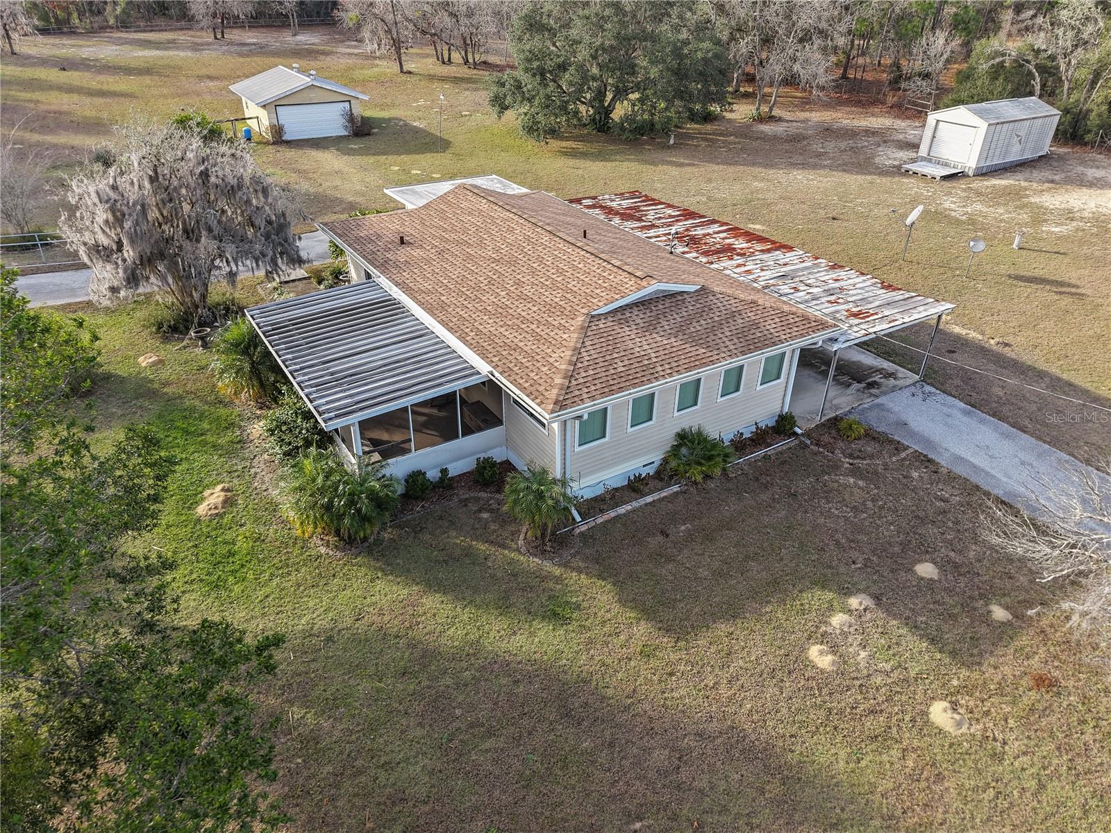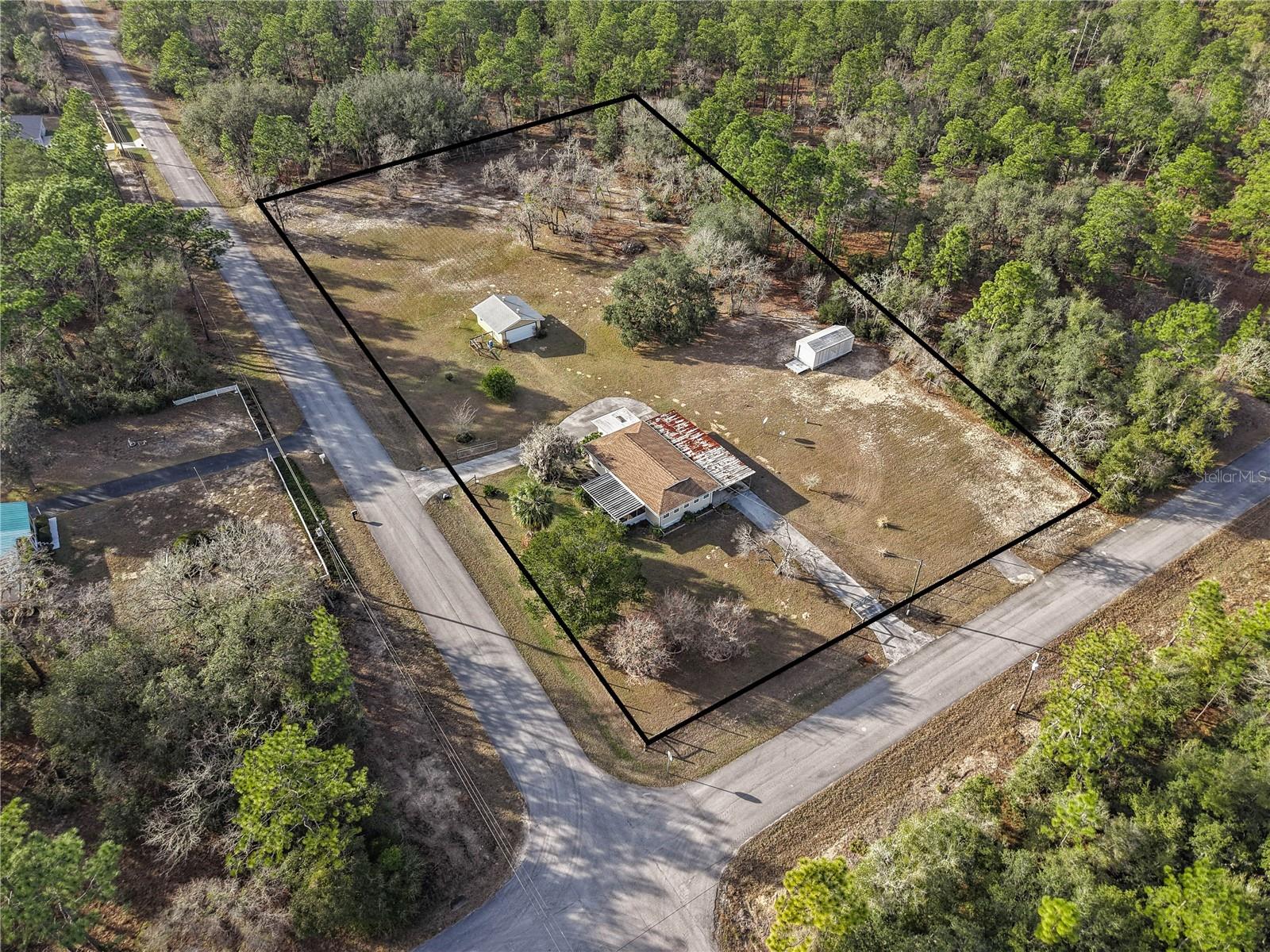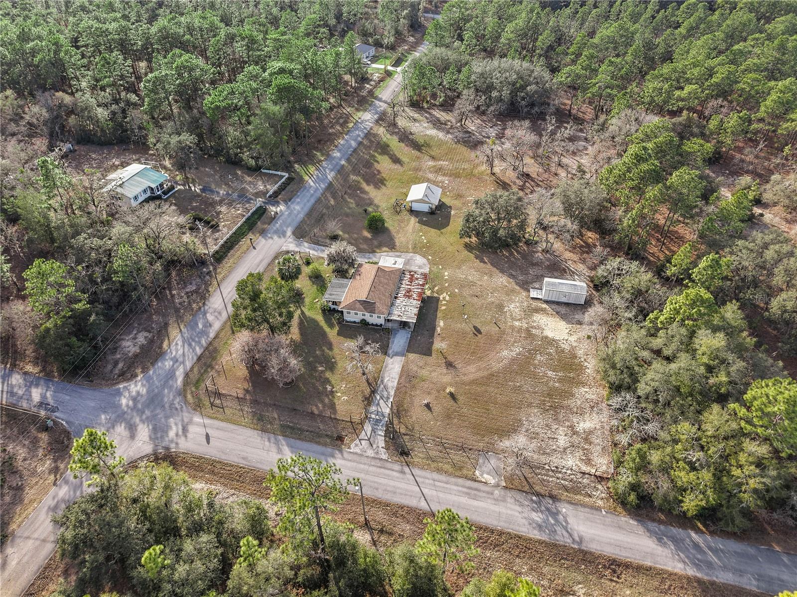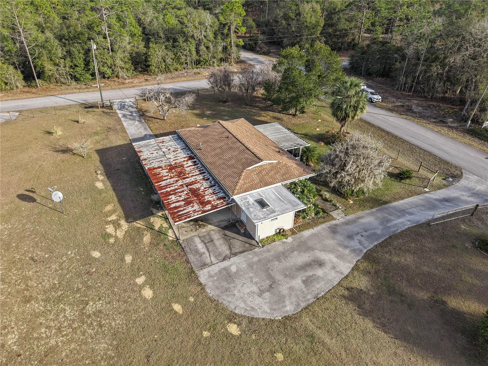 Welcome to this charming 2-bedroom, 2-bathroom home nestled on a sprawling 1.91-acre corner lot in the heart of Rainbow Acres; Dunnellon, Marion County. Boasting an array of recent upgrades, this residence offers modern comforts while retaining its countryside allure. Key updates include a new AC and electric panel in 2016, a complete roof and gutter system in 2017, all windows in 2018, and fresh doors in 2019. The property features two gated entrances, each on a separate road, enhancing privacy and accessibility. Positioned on a desirable corner lot with paved road access, the home faces south and spans a generous 200 x 415 ft. Enjoy the convenience of a detached garage, a nearly attached carport (note: the carport roof requires some attention), and some newly installed fencing in 2024. Relax on the screened 12x18 front porch, offering a serene spot to unwind. Don’t miss this rare opportunity to own a piece of tranquility in Marion County, perfectly zoned R1 for residential use.