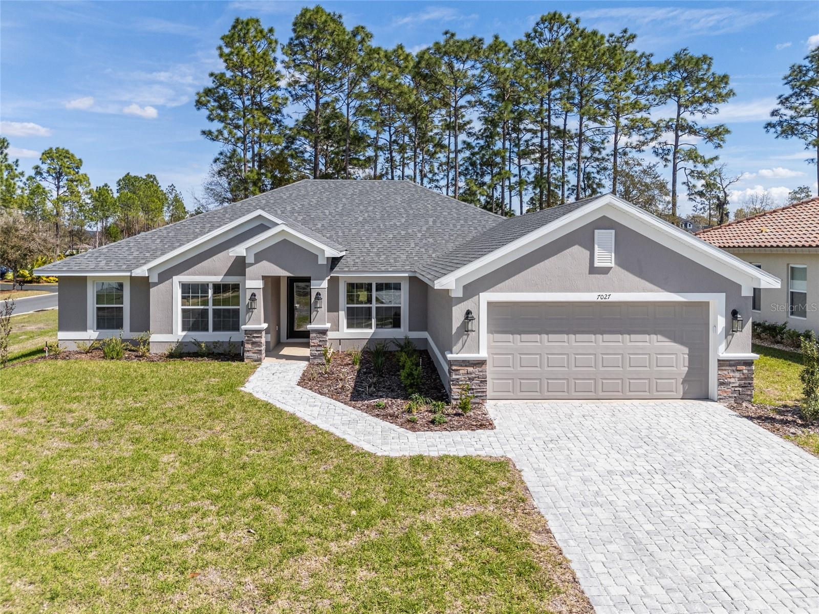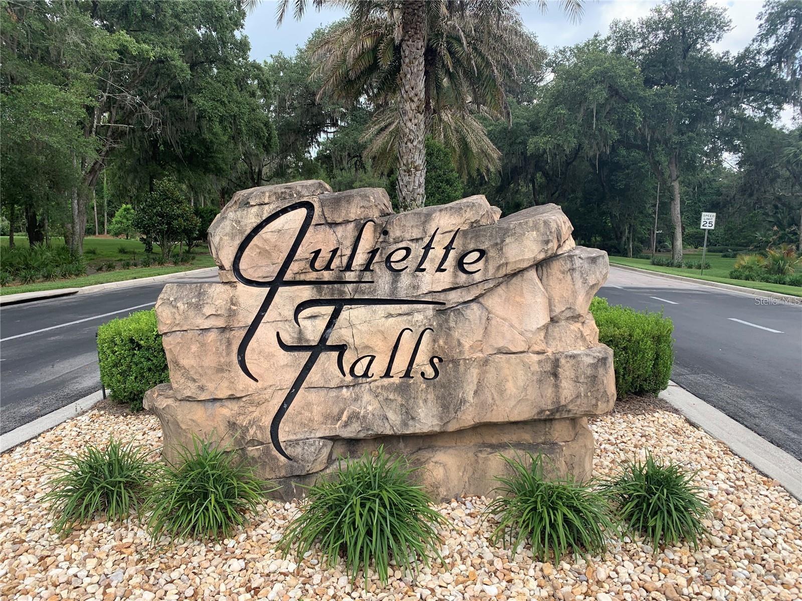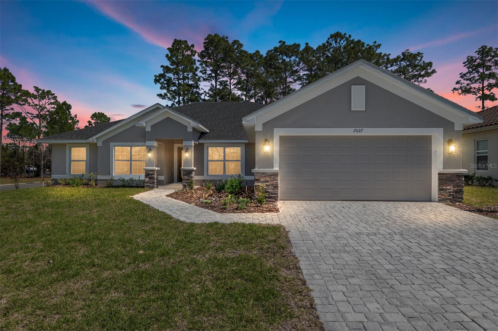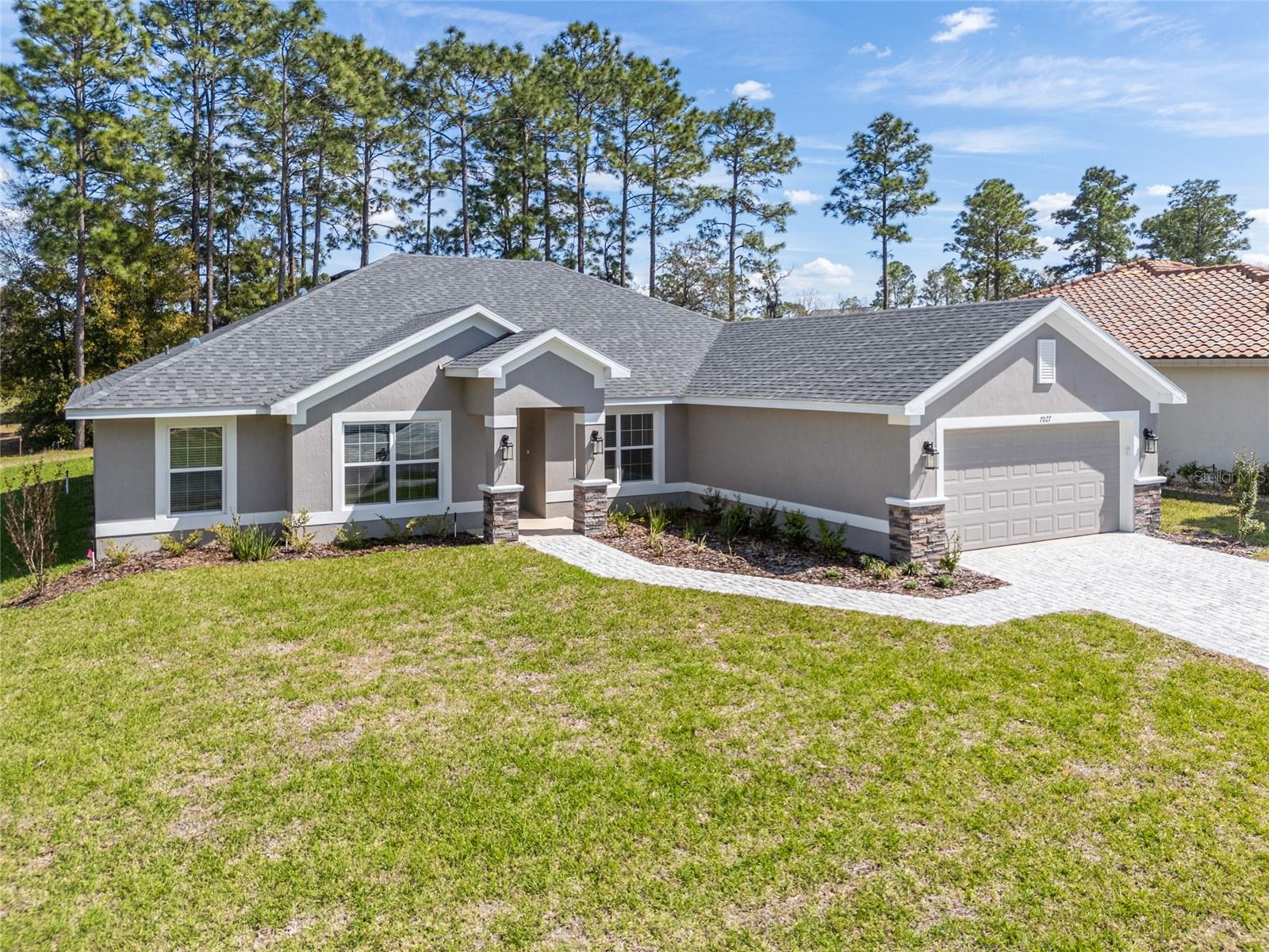 Gorgeous 2024 BUILT 4/2/2 home in Juliette Falls, a gated golf course community! CORNER lot with green space behind the home. Great curb appeal with paver driveway and walkway. SPACIOUS HOME with 2557 ft living space. Light and bright! Wood look tile plank flooring throughout living areas. OPEN FLOOR PLAN with vaulted ceilings and large living room and dining room. Eat in kitchen has a breakfast bar, pantry, SS appliances, plenty of granite counters and upgraded shaker cabinets. The office/flex room can also be used as a family room or 5th bedroom. Primary suite has tray ceiling, TWO WALK-IN CLOSETS, linen closet, dual sinks, granite counters, walk-in tile shower, and water closet. Split bedroom plan has 3 more bedrooms and bathroom on the other side of the home. Indoor laundry room. Enjoy the pretty backyard from the covered lanai. Includes irrigation system and tubes-in-the-wall pest control. Juliette Falls is a master designed gated golf course community featuring a top-ranked golf course! Juliette Falls' 540 acres includes a 136 acre conservation area with 3.5 miles of walking trails. Minutes from shopping and dining in downtown Dunnellon, Rainbow Springs State Park, and 10 miles from the World Equestrian Center. Easy drive to Ocala, Crystal River, the Villages, and Gainesville. Peaceful neighborhood! Transferrable warranty. (One bedroom isn't pictured).