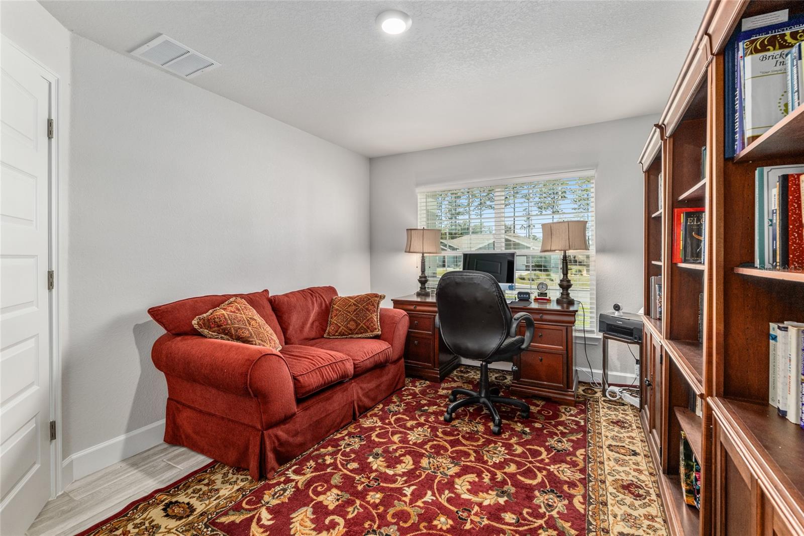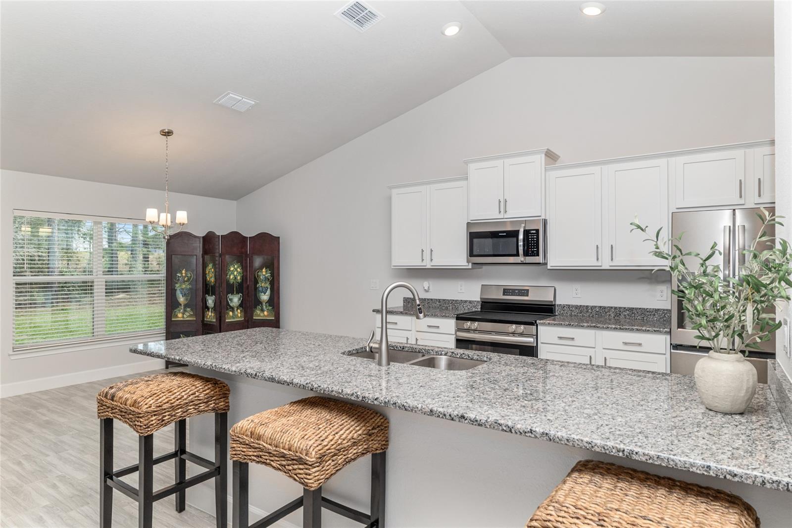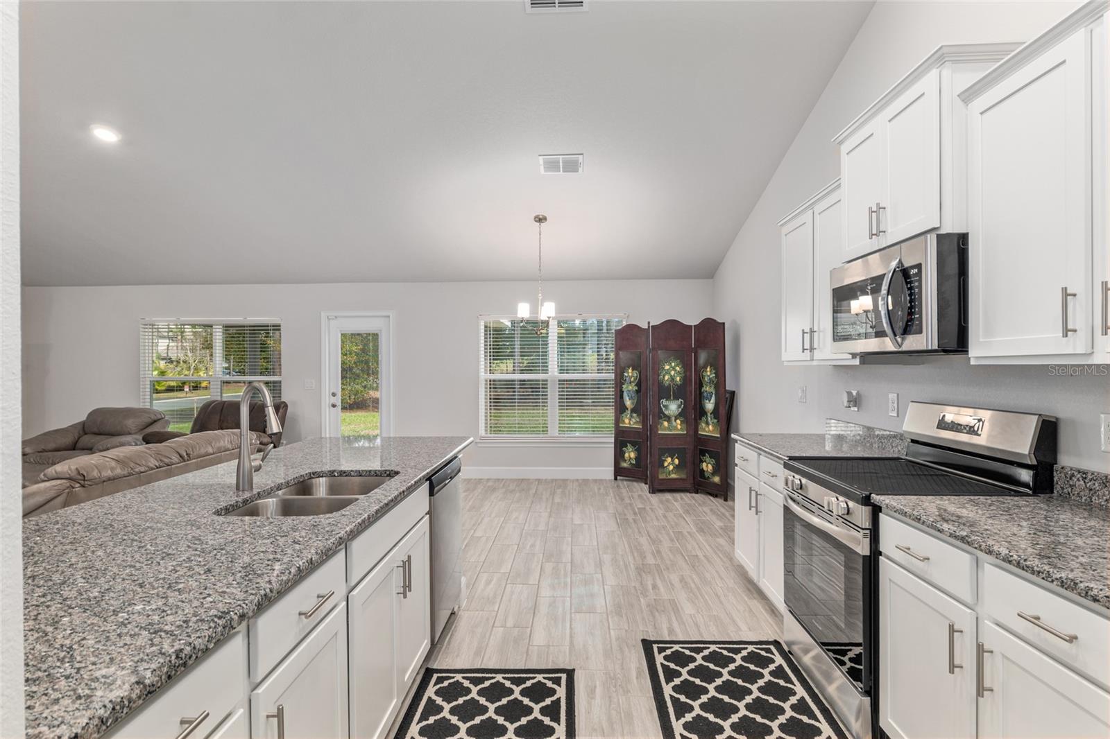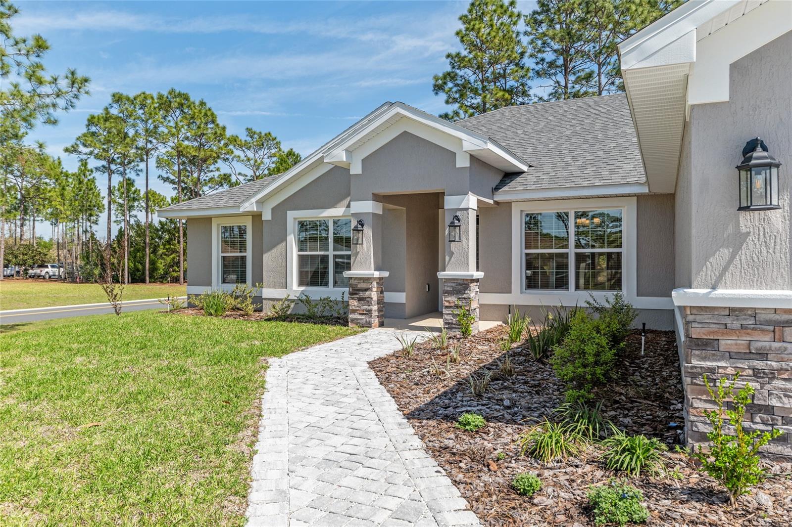 Gorgeous 2024 BUILT 4/2/2 home in Juliette Falls, a gated golf course community! CORNER lot with green space behind the home. Great curb appeal with paver driveway and walkway. SPACIOUS HOME with 2557 ft living space. Light and bright! Wood look tile plank flooring throughout living areas. OPEN FLOOR PLAN with vaulted ceilings and large living room and dining room. Eat in kitchen has a breakfast bar, pantry, SS appliances, plenty of granite counters and upgraded shaker cabinets. The office/flex room can also be used as a family room or 5th bedroom. Primary suite has tray ceiling, TWO WALK-IN CLOSETS, linen closet, dual sinks, granite counters, walk-in tile shower, and water closet. Split bedroom plan has 3 more bedrooms and bathroom on the other side of the home. Indoor laundry room. Enjoy the pretty backyard from the covered lanai. Includes irrigation system and tubes-in-the-wall pest control. Juliette Falls is a master designed gated golf course community featuring a top-ranked golf course! Juliette Falls' 540 acres includes a 136 acre conservation area with 3.5 miles of walking trails. Minutes from shopping and dining in downtown Dunnellon, Rainbow Springs State Park, and 10 miles from the World Equestrian Center. Easy drive to Ocala, Crystal River, the Villages, and Gainesville. Peaceful neighborhood! Transferrable warranty. (One bedroom isn't pictured).