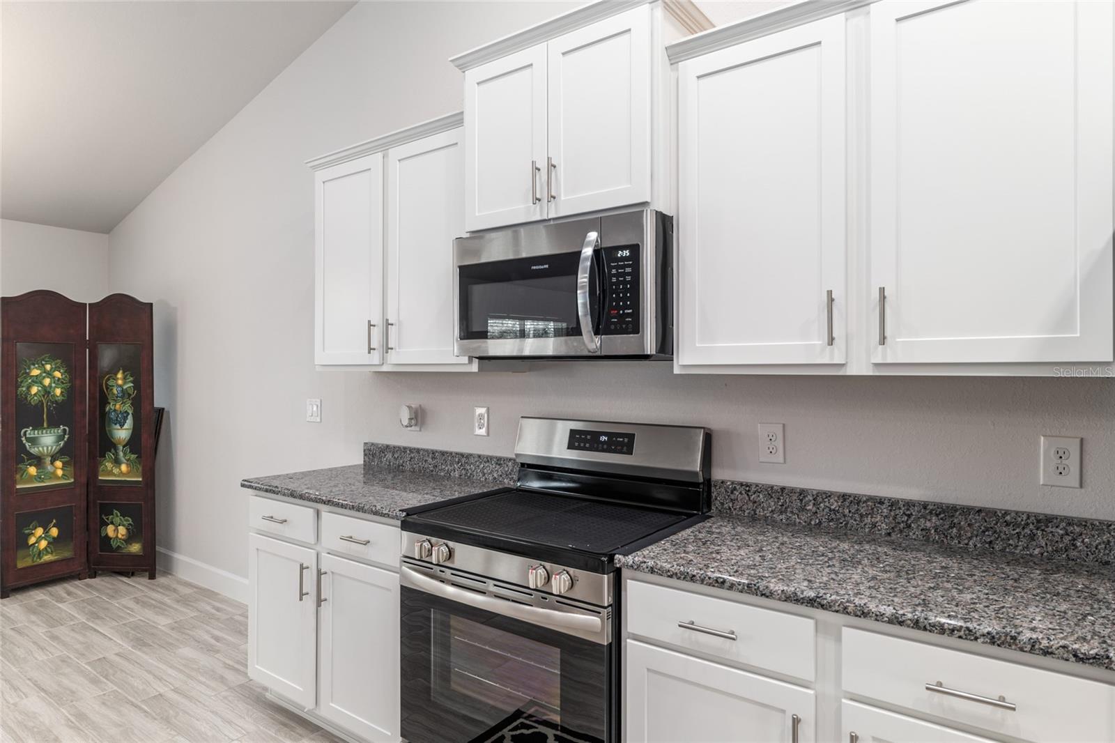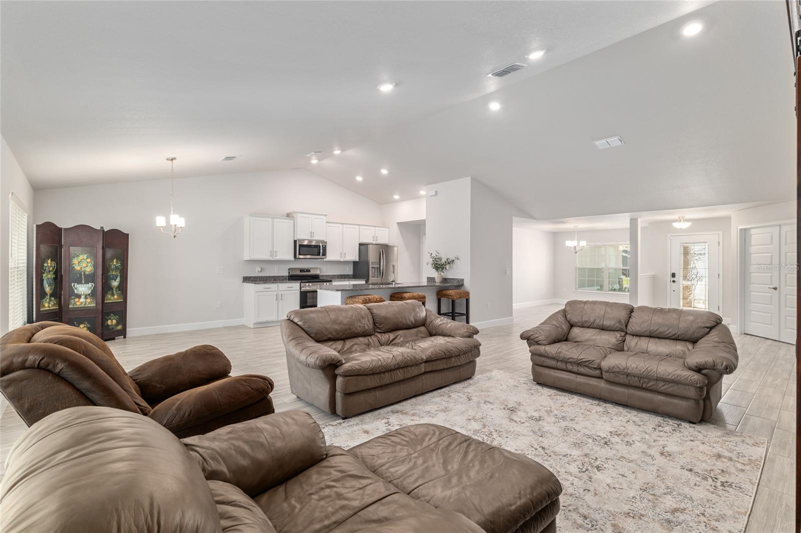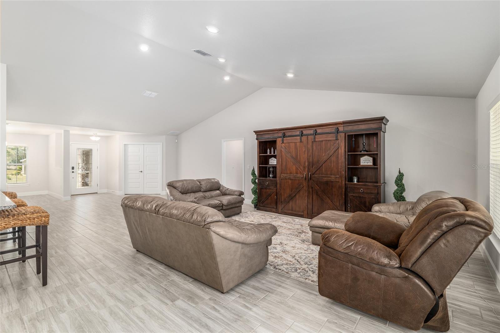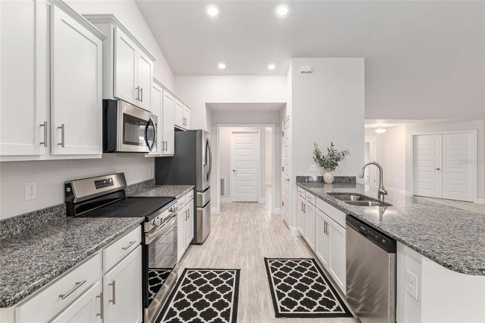 Gorgeous 2024 BUILT 4/2/2 home in Juliette Falls, a gated golf course community! CORNER lot with green space behind the home. Great curb appeal with paver driveway and walkway. SPACIOUS HOME with 2557 ft living space. Light and bright! Wood look tile plank flooring throughout living areas. OPEN FLOOR PLAN with vaulted ceilings and large living room and dining room. Eat in kitchen has a breakfast bar, pantry, SS appliances, plenty of granite counters and upgraded shaker cabinets. The office/flex room can also be used as a family room or 5th bedroom. Primary suite has tray ceiling, TWO WALK-IN CLOSETS, linen closet, dual sinks, granite counters, walk-in tile shower, and water closet. Split bedroom plan has 3 more bedrooms and bathroom on the other side of the home. Indoor laundry room. Enjoy the pretty backyard from the covered lanai. Includes irrigation system and tubes-in-the-wall pest control. Juliette Falls is a master designed gated golf course community featuring a top-ranked golf course! Juliette Falls' 540 acres includes a 136 acre conservation area with 3.5 miles of walking trails. Minutes from shopping and dining in downtown Dunnellon, Rainbow Springs State Park, and 10 miles from the World Equestrian Center. Easy drive to Ocala, Crystal River, the Villages, and Gainesville. Peaceful neighborhood! Transferrable warranty. (One bedroom isn't pictured).