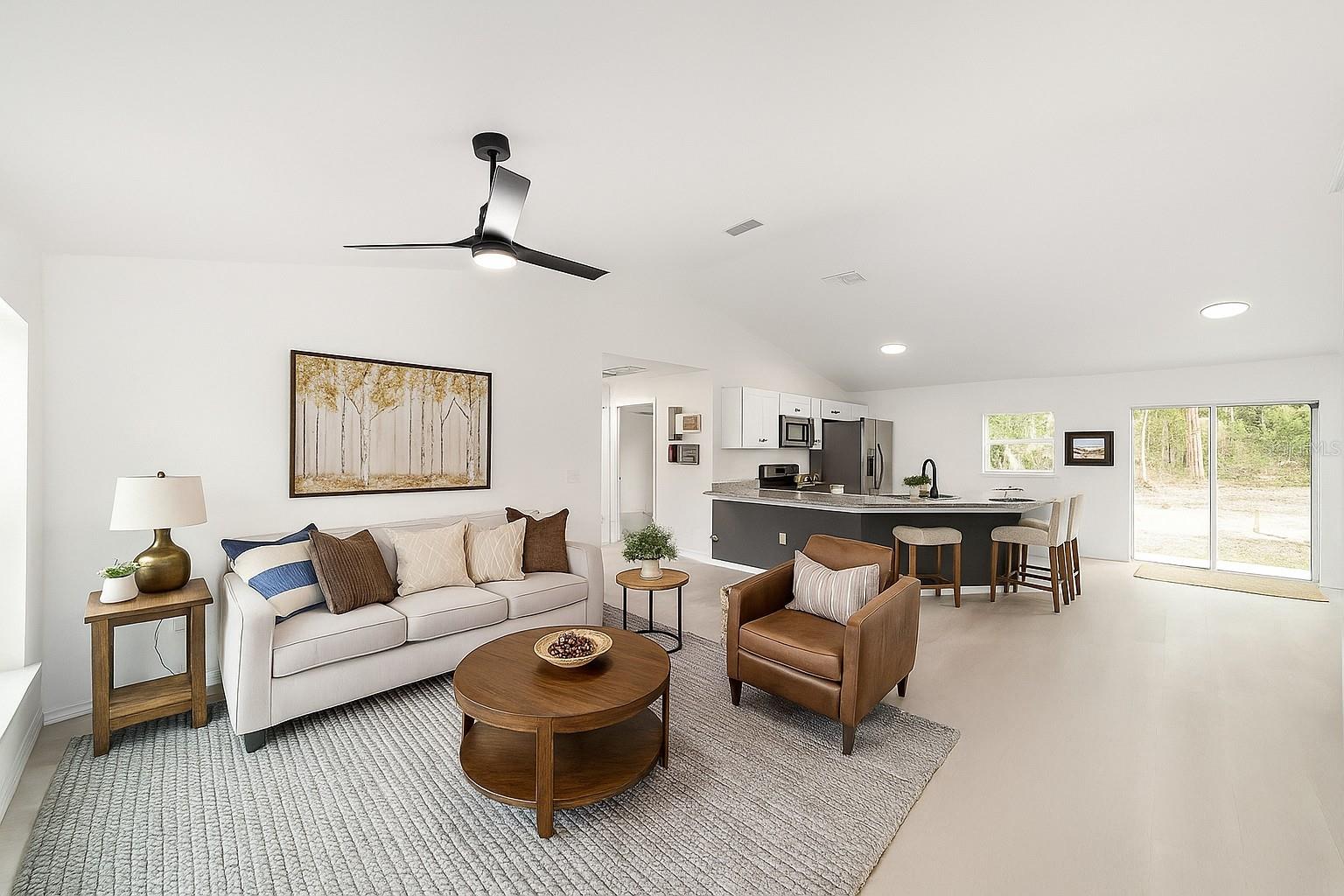 One or more photo(s) has been virtually staged. Under Construction. Brand new CONCRETE BLOCK home! Estimated completion is approximately October pending any setbacks beyond the builders control. Not all new construction is created equal—this one is packed with premium upgrades and standout style. See the difference for yourself as you step into this PREMIUM UPGRADED MODEL, beautifully set on a .99 acre lot. Built with CONCRETE BLOCK construction and featuring vaulted ceilings, this home offers both long-lasting durability and elevated style. The open, split floor plan flows effortlessly with LVP flooring throughout (no carpet here), giving the home a clean, modern finish. The kitchen and bathrooms are equipped with granite countertops, white shaker-style soft-close cabinets, and STAINLESS-STEEL appliances. The primary suite includes a large walk-in closet and a beautifully tiled shower with a GLASS enclosure—no fiberglass or acrylic inserts here. The second bathroom offers a PORCELAIN TUB surrounded by DESIGNER TILE, creating a polished, upscale feel in every detail. With NO HOA and no deed restrictions, you’ll enjoy the freedom to truly make this property your own. Located just 15 minutes from downtown Dunnellon and 10 minutes from Rainbow Springs State Park, you’re close to kayaking, swimming, diving, and fishing. The nearby Rainbow Lakes Community Center features tennis courts, racquetball, basketball, a baseball field, and a playground. Tiger Lake with a public boat ramp is also just minutes away. This home blends premium upgrades, spacious land, and a prime location—making it a rare and exciting opportunity. Call today for more information and take the first step towards making this house your home!
