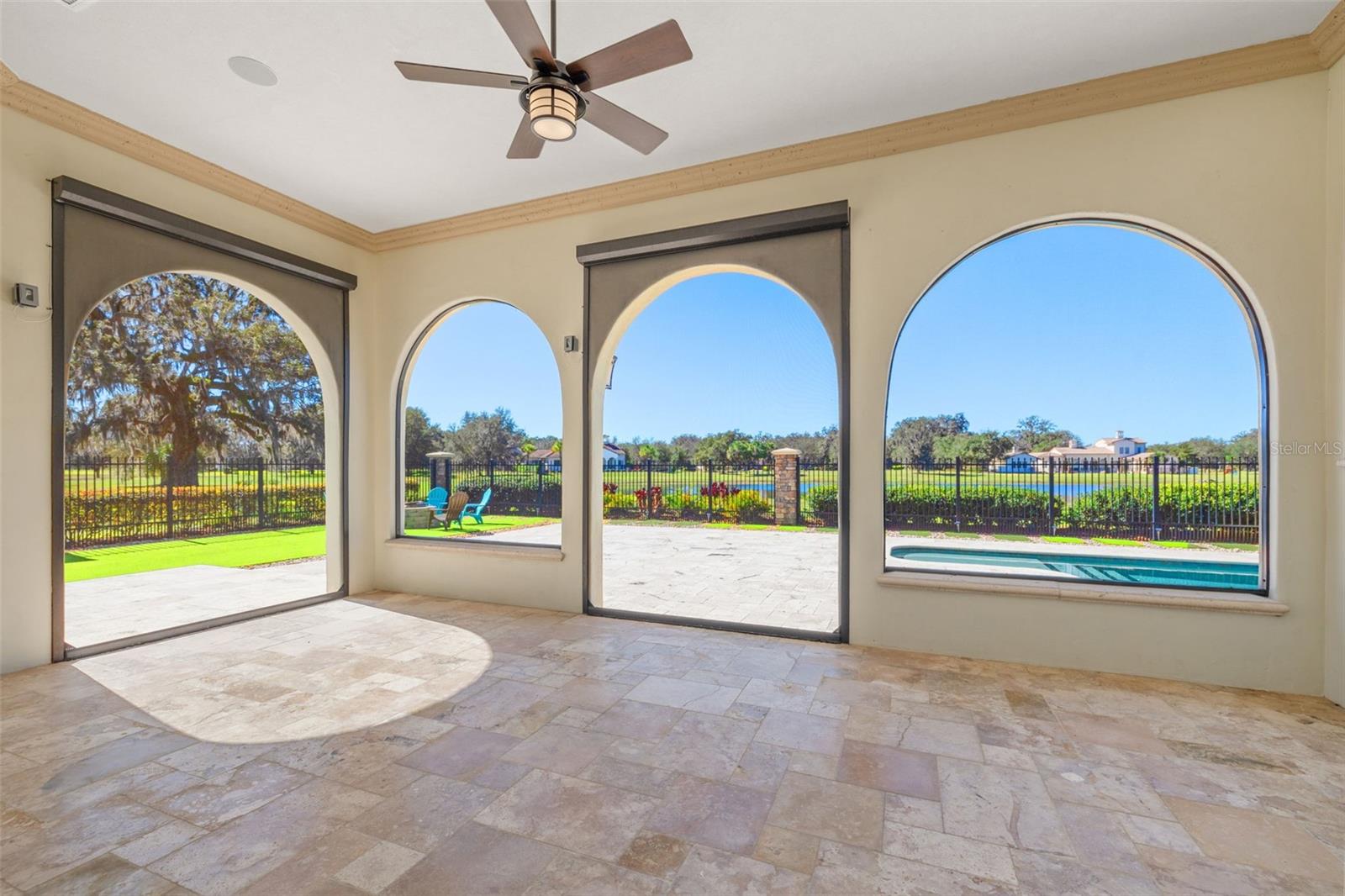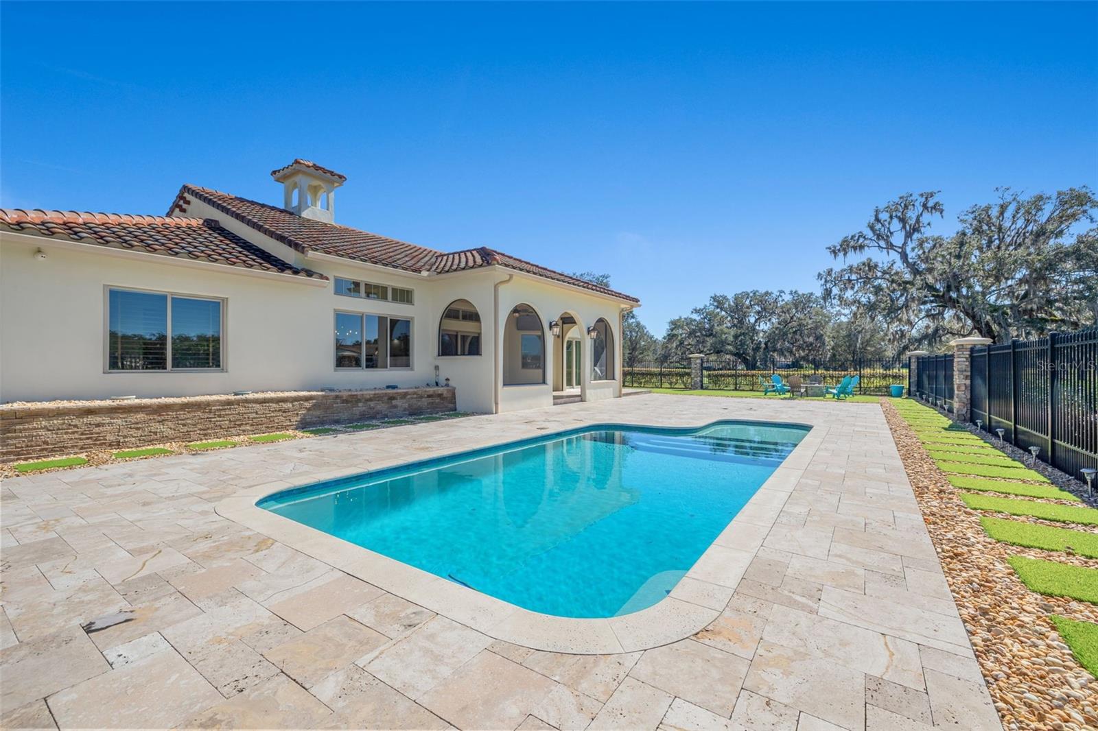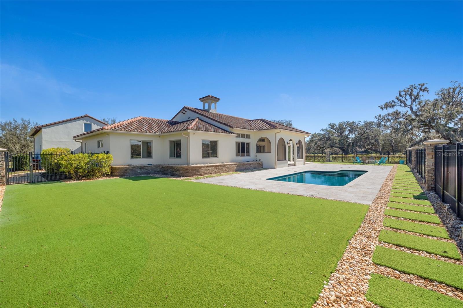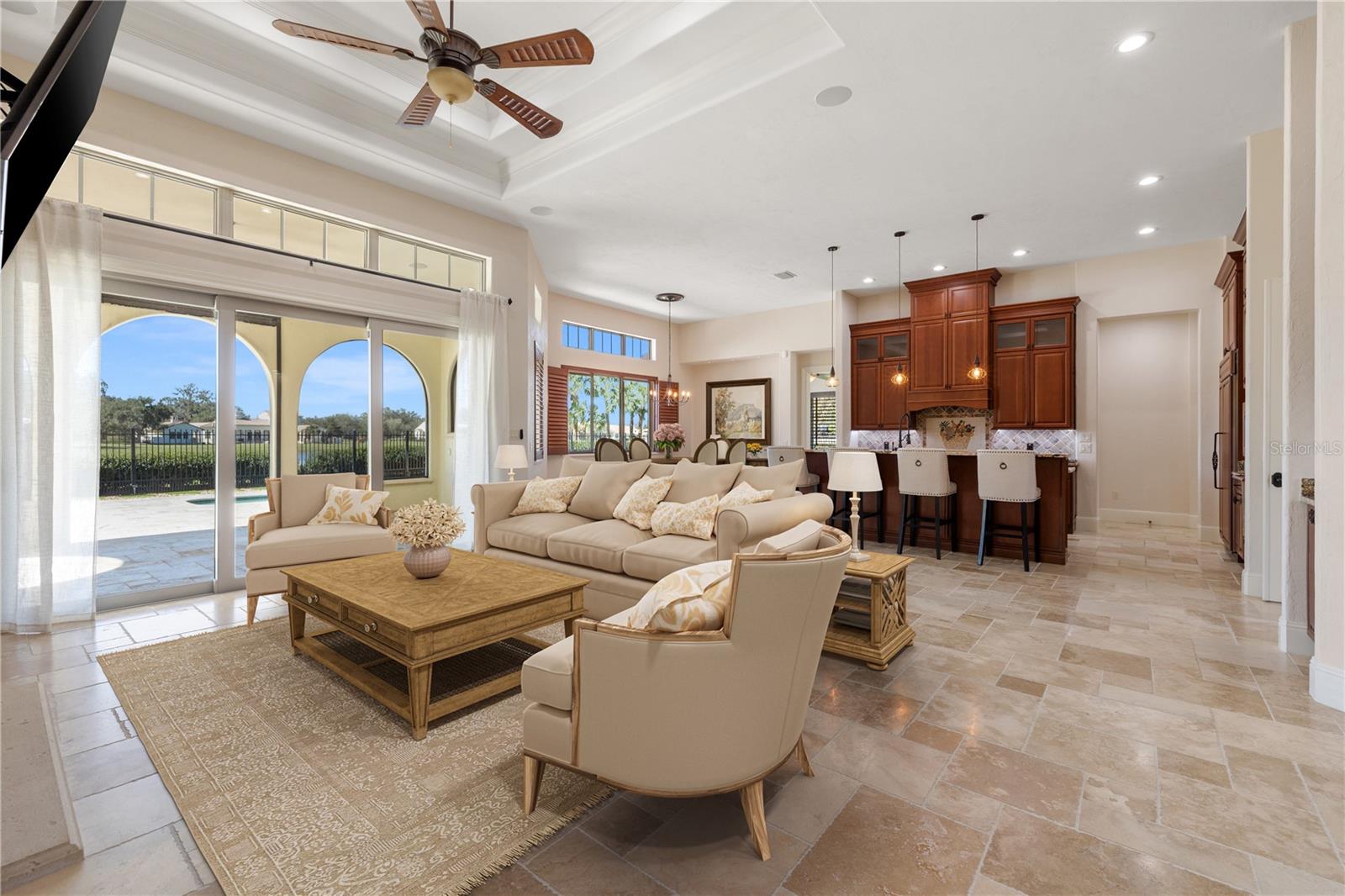 One or more photo(s) has been virtually staged. Designed for the most discerning buyer, this 1.55-acre Tuscan-style estate is the epitome of luxury, privacy, and timeless elegance all nestled within the exclusive gated community of Bel-Lago. After making your way through the gated neighborhood entry, you are welcomed home via an extended paver driveway, setting the tone for the luxury and privacy that awaits. Open the front door and you will be instantly captivated by picturesque pool and pond views visible from nearly every room and the expansive patio—complete with high-end automated retractable screens for year-round enjoyment. This sprawling 3,300 heated sqft., single level residence is highlighted by an open concept living area and triple split-bedroom layout, the thoughtful floor plan ensures an ideal space for entertaining, comfort and privacy for all. The chef’s kitchen at the heart of the home boasts granite countertops, top of the line appliances, an oversized pantry, and a large breakfast bar, ideal for entertaining. Elegant trayed ceilings, a stunning fireplace and plantation shutters add architectural sophistication in the main living space and beyond. At the front of the home is a flex space, ideal for an office, additional bedroom or formal dining area. The primary suite is a true retreat, offering a generous walk-in closet, dual vanities, soaking tub, and walk-in shower. 2 additional bedrooms, each with en-suite baths, provide ample space for family or guests. A well-appointed laundry room enhances functionality while the bonus room above the expanded 2 car garage provides additional versatile living space for many different uses. The resort-style backyard features the covered and screened lanai, heated pool with expansive travertine deck, fire pit, and fully fenced turfed yard all set against the tranquil back drop of a lake and lush landscaping. Located in Ocala’s premier equestrian community, Bel-Lago offers8,000 acres of preserved land with private trails for horseback riding, cycling, and walking. Just 10 minutes from shopping and health centers, 20 minutes from the World Equestrian Center, and 35 minutes to the Gulf Coast, this meticulously maintained home offers a rare opportunity to experience elegance, space, and tranquility in an unmatched luxury setting.