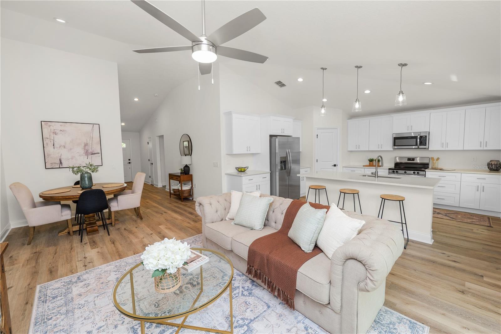 What’s the best new construction home near Lake McLeod in Eagle Lake, FL? This is it. Welcome to 790 Eagle Ave E in Eagle Lake, Florida, a brand new construction home that just feels right the moment you walk in. This never lived in property offers 3 bedrooms, 2 bathrooms, and a 2 car garage, combining modern style with a comfortable, easy flowing layout. As you step inside, you are immediately greeted by an open layout that makes the whole home feel bright and connected. The living room flows easily into the dining area and kitchen, so whether you are hosting friends or just relaxing at home, everything feels comfortable and natural. The kitchen really stands out with its clean modern look, stainless steel appliances, plenty of cabinet space, and a large island that is perfect for casual meals or gathering around. The layout is split in a way that gives the primary suite its own sense of privacy. It is a great space to unwind, complete with a walk in closet and a well designed bathroom featuring dual sinks and a walk in shower. On the other side of the home, the additional bedrooms are nicely sized and share a full bathroom, making them ideal for family, guests, or even a home office. Throughout the home, you will notice thoughtful finishes, recessed lighting, and energy efficient construction that makes everyday living easy. There is also a dedicated laundry area and plenty of functional space that just makes sense. Outside, you have a long driveway, attached garage, and a quiet setting where you can enjoy a slower pace while still being close to everything. You are just minutes from Lake McLeod, perfect for getting out on the water or enjoying the view, and a short drive to LEGOLAND Florida Resort, Auburndale Speedway, and Circle B Bar Reserve for outdoor trails and wildlife. If you have been looking for a move in ready home in Eagle Lake that offers modern style, a smart layout, and a great location, this one is definitely worth seeing in person.