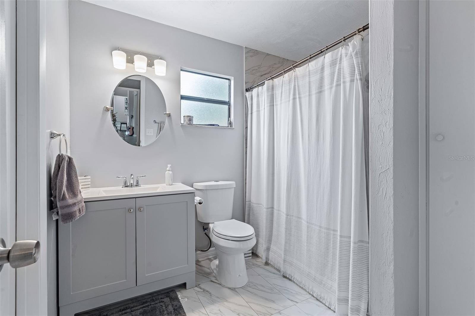 Move-in ready and beautifully remodeled! This stunning 3-bedroom, 2-bath home is just 20 minutes from the beach and packed with upgrades. Enjoy peace of mind with a 2021 roof, newer AC and water heater, and fresh interior and exterior paint. Inside, luxury vinyl flooring flows through an open living and dining area, leading to a sleek kitchen with new cabinets and quartz countertops. The split floor plan offers privacy, while the primary suite features private patio access. Relax on the screened back porch surrounded by lush landscaping. Conveniently located near major roads, shopping, dining, and entertainment.