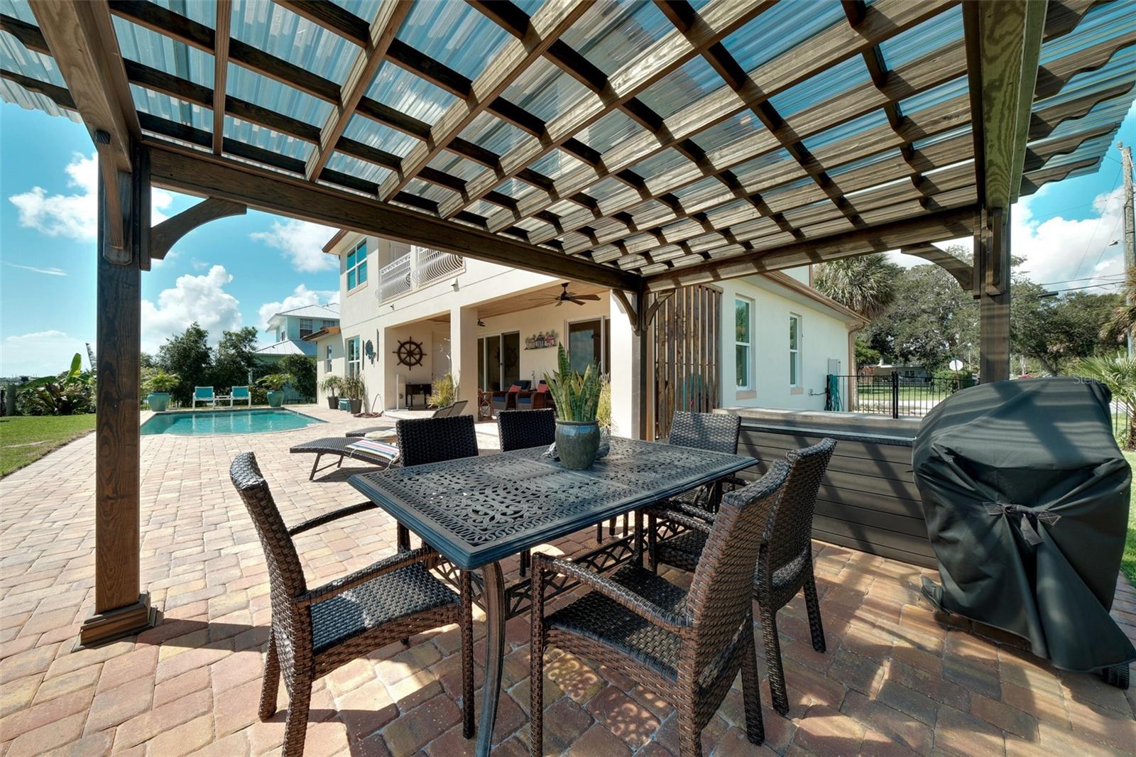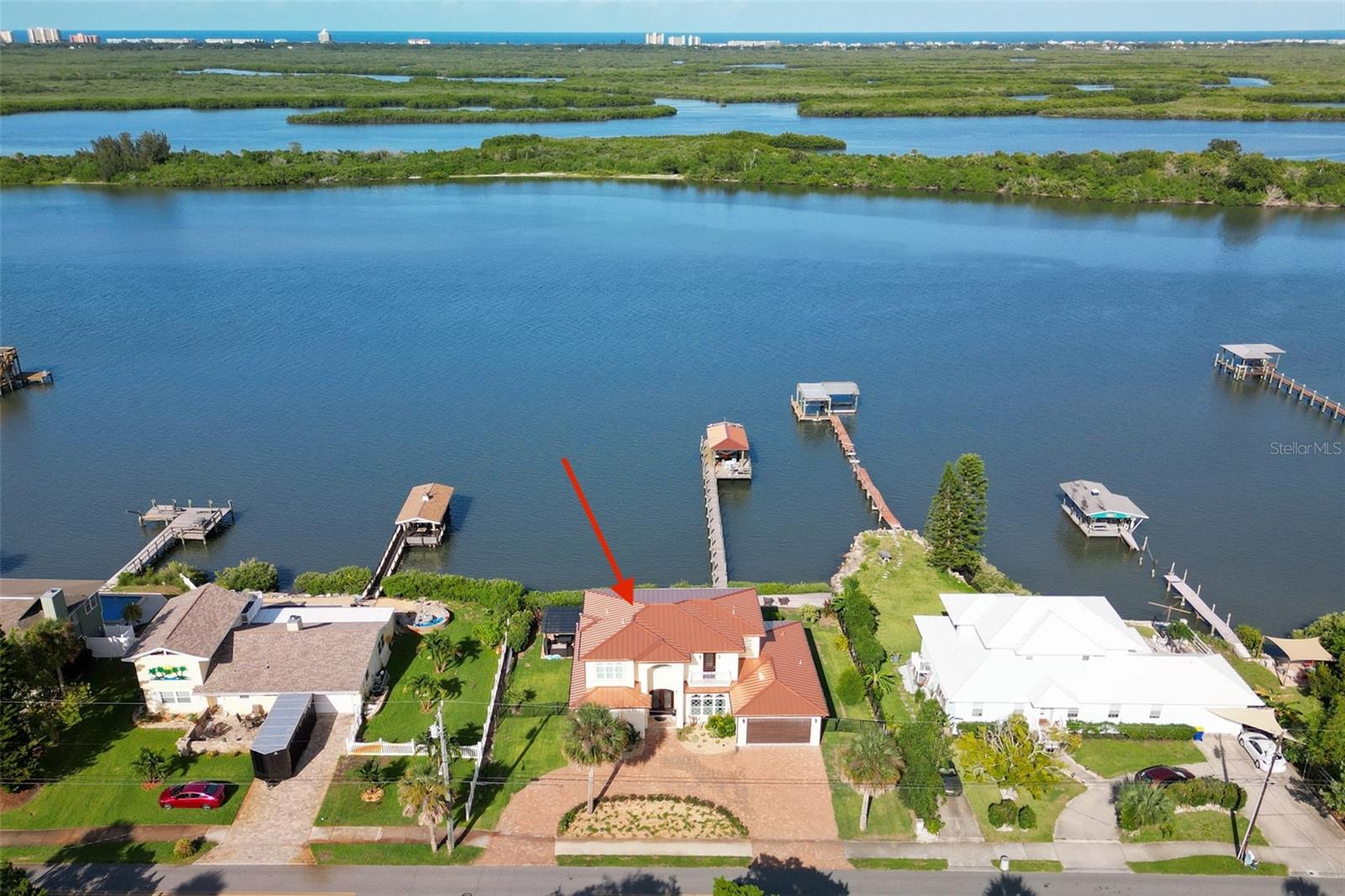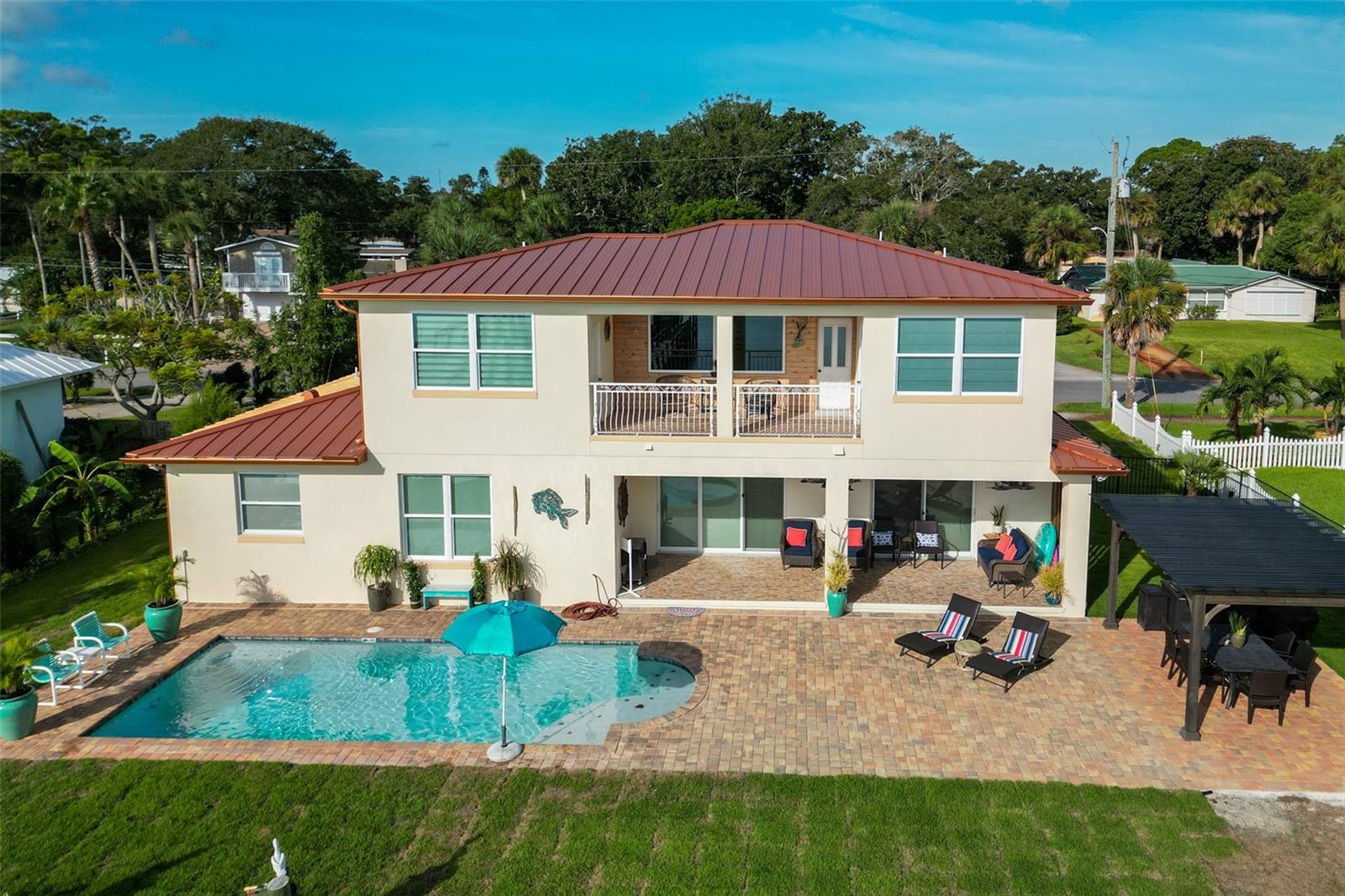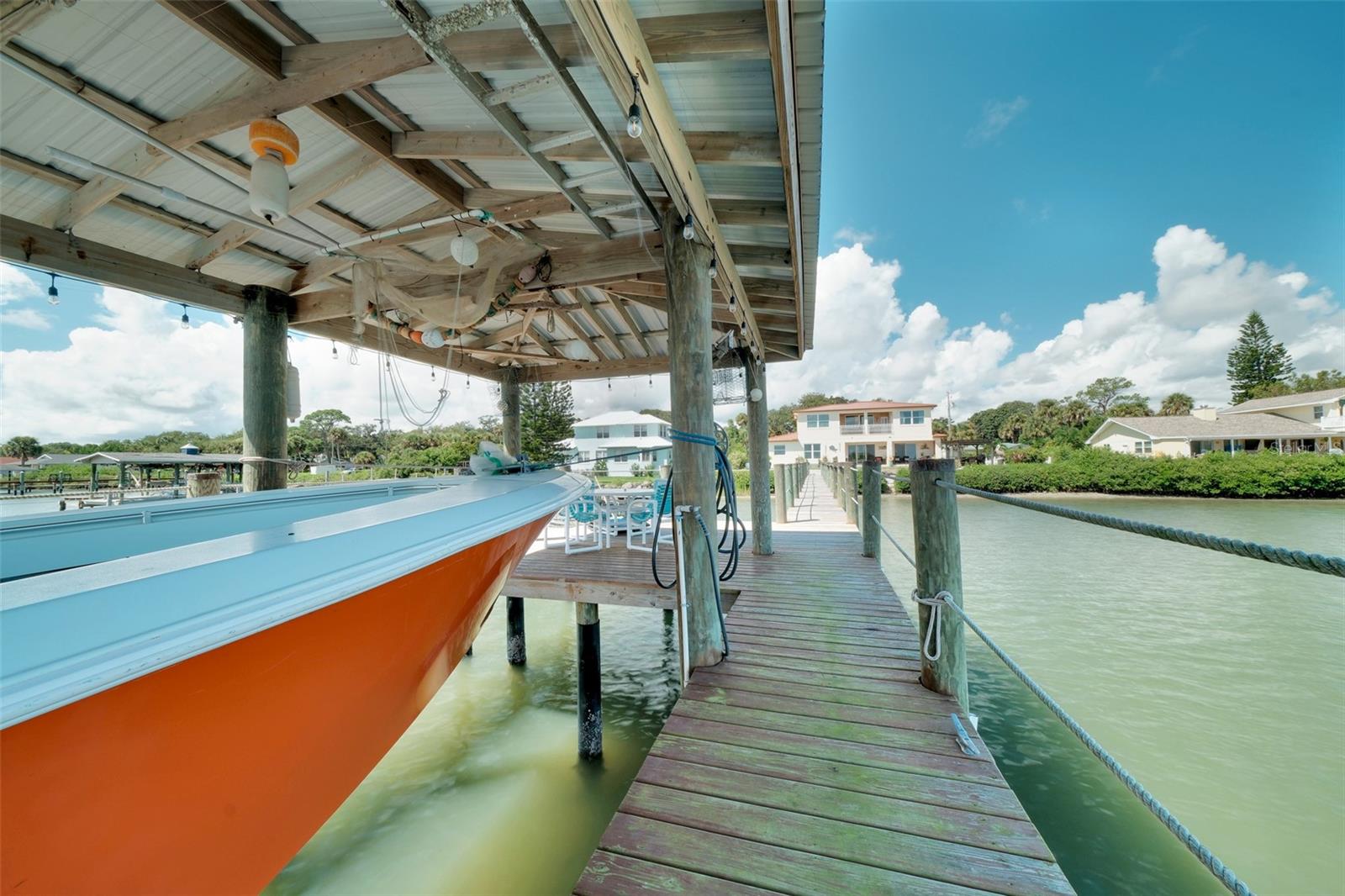 Direct Intracoastal 4 bedroom, 3.5 bath home with deepwater dock and pool, custom built in 2020. Classy modern design with recessed ceilings, tile and wood floors, nice touches like an abalone-shell tiled splash wall in the living room, quartz breakfast bar and counter in the kitchen with gas stove and walk-in pantry. The primary suite is located on the main floor and features a luxurious bath with tub and separate steam shower. All but one of the guest bedrooms have outstanding Intracoastal views and share a riverfront balcony and one has a private bath. Upstairs family room has river views and is presently used as a game room. Custom lighting and window treatments in most rooms. Enjoy the heated salt water pool year round or watch the action from the covered lanai or the river deck. Covered dock with 15,000 lb lift. Located just minutes from the lagoon or about 7 miles to the Inlet if you want to head off shore. Access the backwaters for serene kayak and SUP paddling from Dick’s cut just half mile south. There’s enough room on the side yard to store your boat trailer. Impact windows throughout. Natural gas supplies the stove and tankless water heaters. Furnishings and some décor can be negotiated separately.