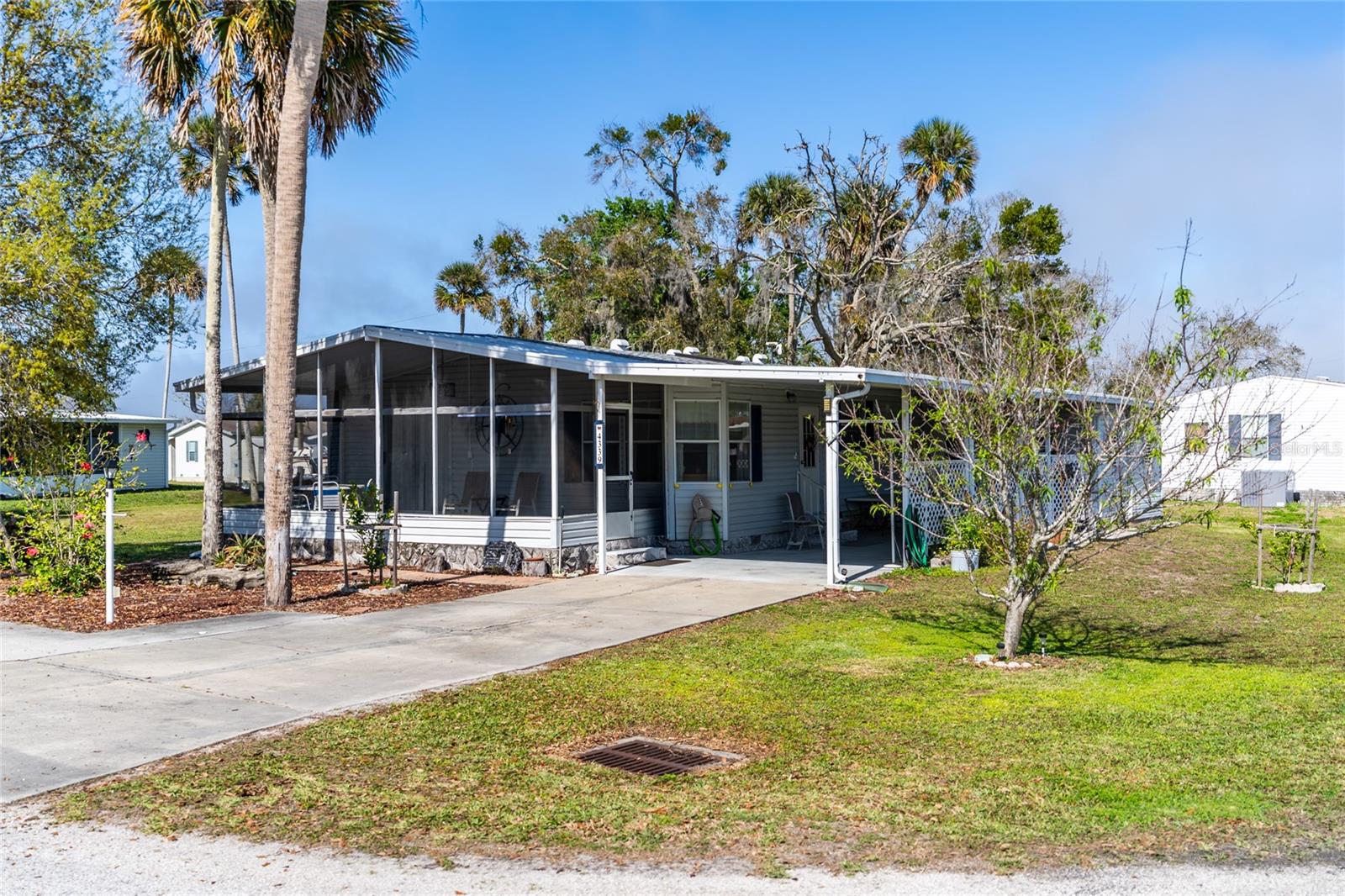 This "ONE OF A KIND” home PLUS an EXTRA LOT is located in the desirable RIVERFRONT COMMUNITY of Terra Mar Village and has pride of ownership evident everywhere! This 2 bedroom 2 bathroom home features a 2023 NEW ROOF, 2022 NEW A/C, and NEW custom cabinet doors, NEW kitchen tile backsplash, and NEW kitchen island cabinets and countertop. This home offers lots of natural light, a safe that stays with the home, a 2 car carport, spacious attached workshop, and a 15 x 30 concrete pad next to the home for your boat and boat trailer to be stored. After enjoying the quiet oasis the front porch offers, you make your way through the front door and you are immediately welcomed by a sense of a warming home with tons of character! From the custom cabinetry, to the vaulted ceilings, to the massive amount of natural light by strategically placed windows, the feeling you receive in this home is like no other. There is a large living area, spacious kitchen and a primary suite with an ensuite bathroom. Here you own the land and there are NO age restrictions! Amenities fee of $360/month paid to TPC Terra Mar Village LLC covers the 2 community pools, shuffleboard, bocce court, horseshoe area, boat launch, clubhouse, and community pier. This is a PERFECT HOME in the PERFECT LOCATION and is ONLY MISSING YOU!