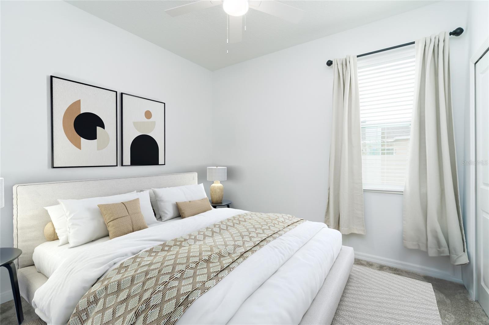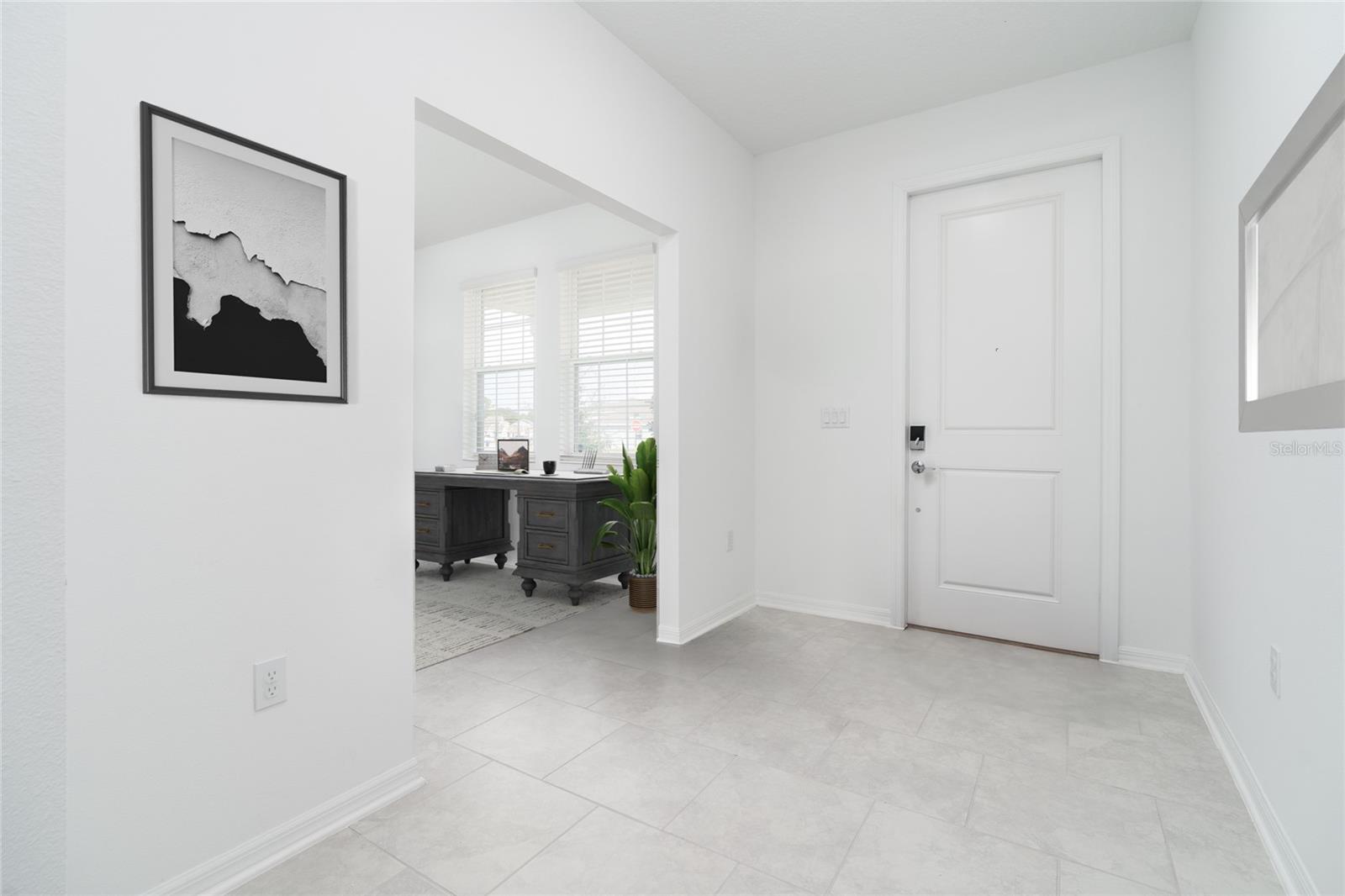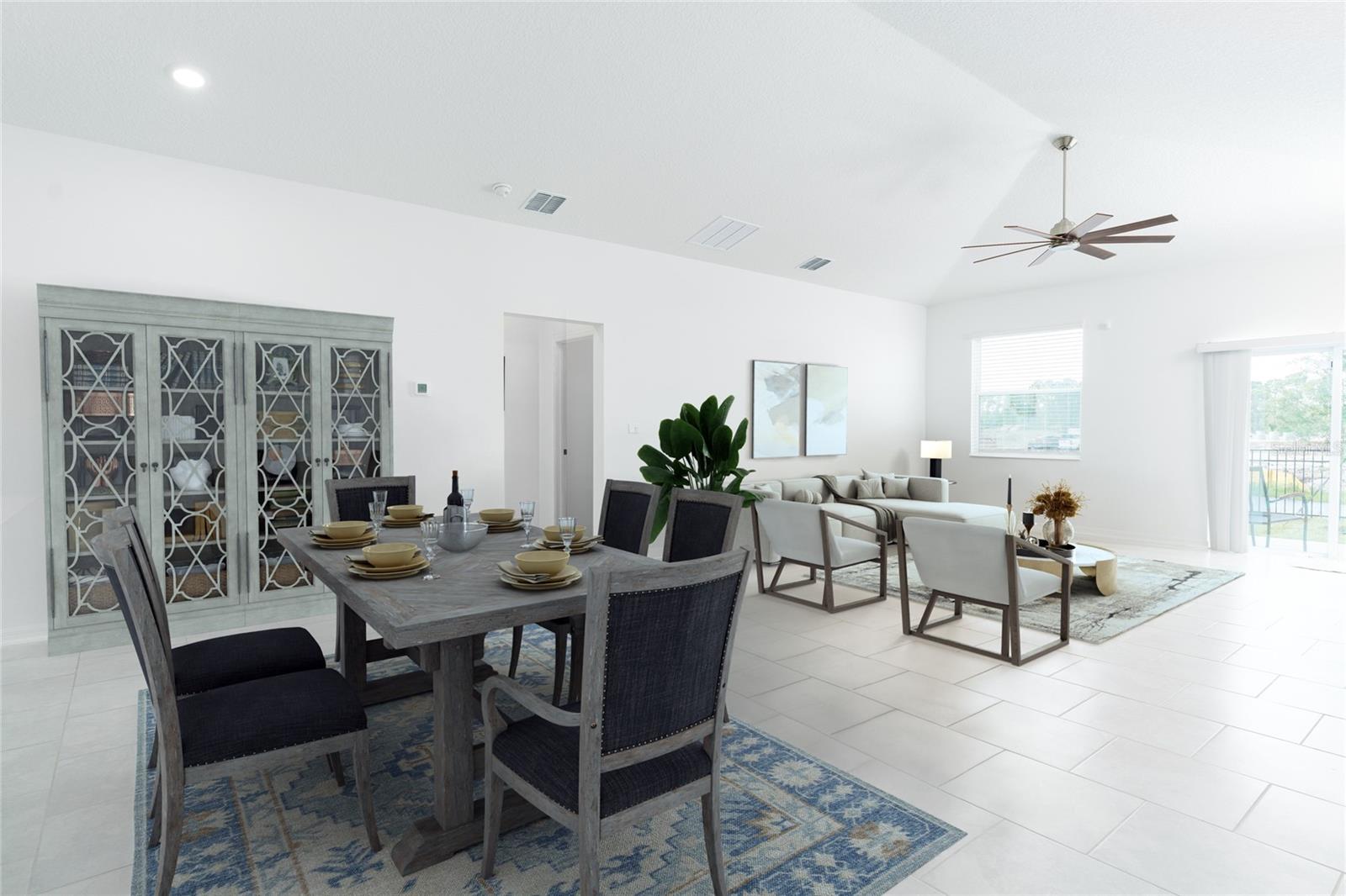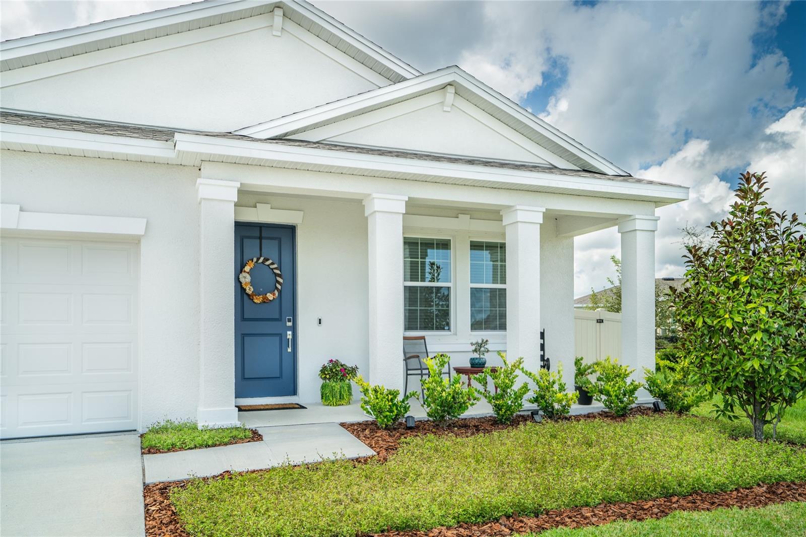 One or more photo(s) has been virtually staged. This single-story 2024 built home features 4-bedrooms, 2-baths, a 3-car garage, pond views, and a fenced backyard. Perfectly blending comfort, style, and functionality, this home offers the ideal retreat for those seeking a move-in-ready home with no projects! This beautifully designed Lennar home offers a split floor plan to ensure privacy and comfort for all. Step inside to a bonus room that serves as the perfect office space then continue to the open kitchen, dining, and living room. The family chef will fall in love with the well-appointed kitchen showcasing quartz countertops, stainless steel appliances, a pantry, and ample seating around the island. The kitchen overlooks the dining area and spacious family room, where abundant windows and sliders frame views of the backyard and pond. Additional highlights include: hurricane shutters, elongated toilets, 2” faux window blinds, ceramic tile flooring in the main living areas, an irrigation system, a garage door opener, a honeywell programmable thermostat, Low-E windows, Taexx built-in pest control system, and a luxurious primary suite featuring dual vanities and a large walk-in closet. Low HOA dues of $87/month include the internet, dog park, pickleball courts, playground, streetlights, dock and picnic area, and basketball court. The Lennar Home Warranty in place is transferrable to the new buyer. This move-in-ready home has everything you could want and more! Schedule your tour today and make 5226 Hophorn your new home sweet home!