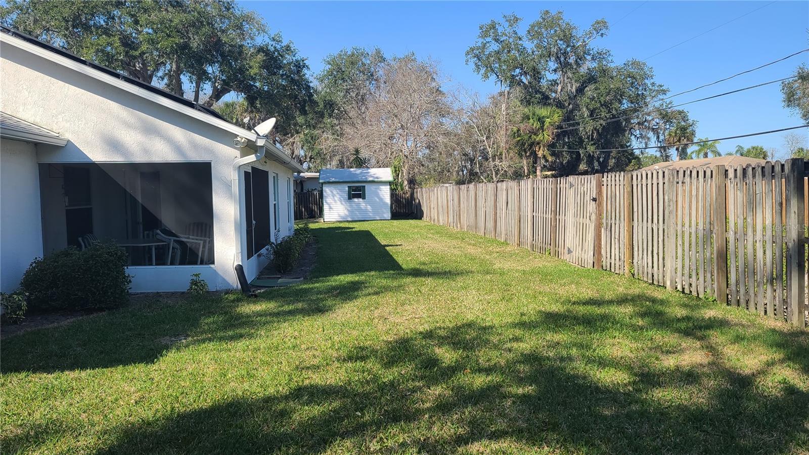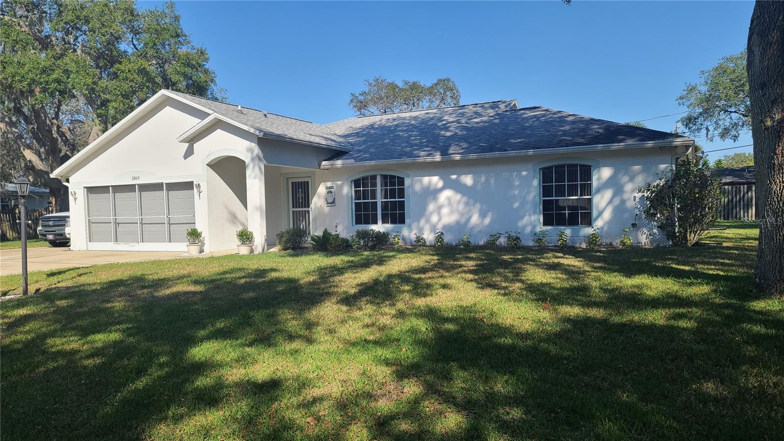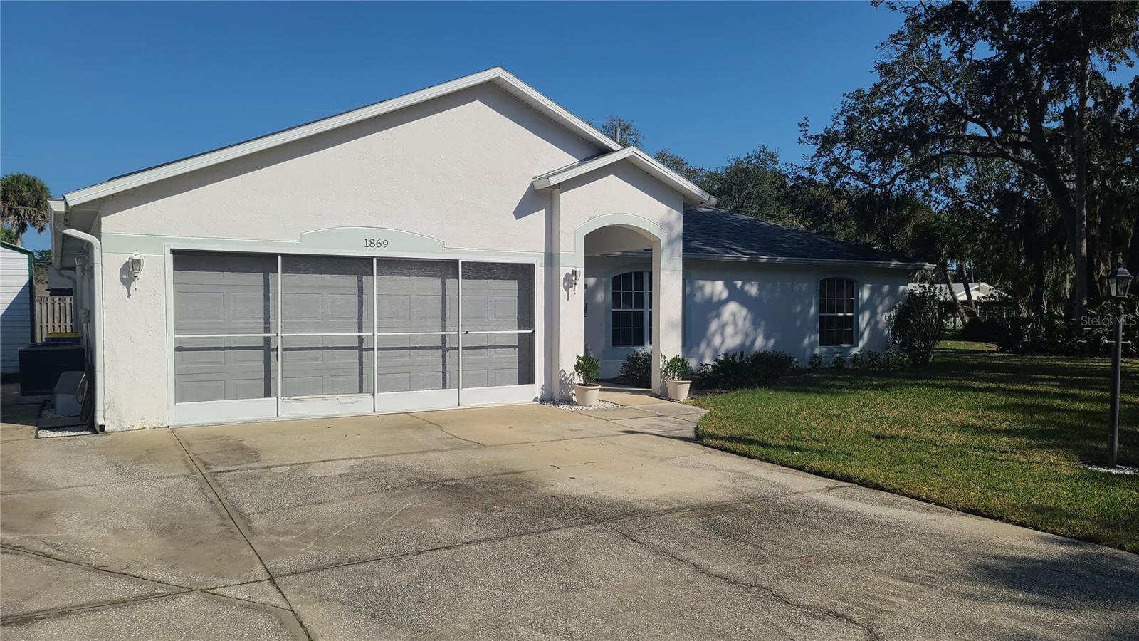 MAJOR PRICE REDUCTION - HIGHLY MOTIVATED SELLER! If you desire privacy between you and your neighbors, you will want this house. The home was built in the center of 4 adjacent lots, with a utility easement on the right side of the property, providing ample open space to enjoy peace and serenity on the 160’ by 100’ lot. Primary bedroom and bath are located on the left side of the home and 2 additional bedrooms with another bath are located on the right side of the home. The pros that come with purchasing this house include: 7 year old roof, 2 year old HVAC system, brand new hot water heater installed 3/19/25, waterproof rubber backed vinyl flooring installed in 2018, 2 system (salt and charcoal) whole house water softener system, Solar panels leased through IGS Energy since 2023. On 2/8/25 Sellers had 3 hurricane rated windows installed on the backside of the home to provide more protection from storm winds. Sellers had a pre-sale home inspection and pest inspection completed by Better Home Inspections on 2/7/25 to insure the home was ready for listing. The report will be made available to Buyers who present an acceptable contract. The cons associated with the sale of this property are the dated kitchen and bathrooms. Those areas will need your TLC to update them to your liking. Two sheds convey with the property. There is a 134 sq ft screened lanai where you can relax. A (2)two-car garage is attached to the home, with full garage door screen. For ample parking, there is an extended concrete driveway to accommodate 4 additional cars. Sellers are the original owners, who have spent 25+ years creating many happy memories in this home. Now it is your opportunity to do the same. Don't rule out this property until you see it. Although it could use some upgrading in the kitchen and bathrooms, the 4 lot plot of land is a rare find. Plenty of room to put in a pool, store your RV or other toys!