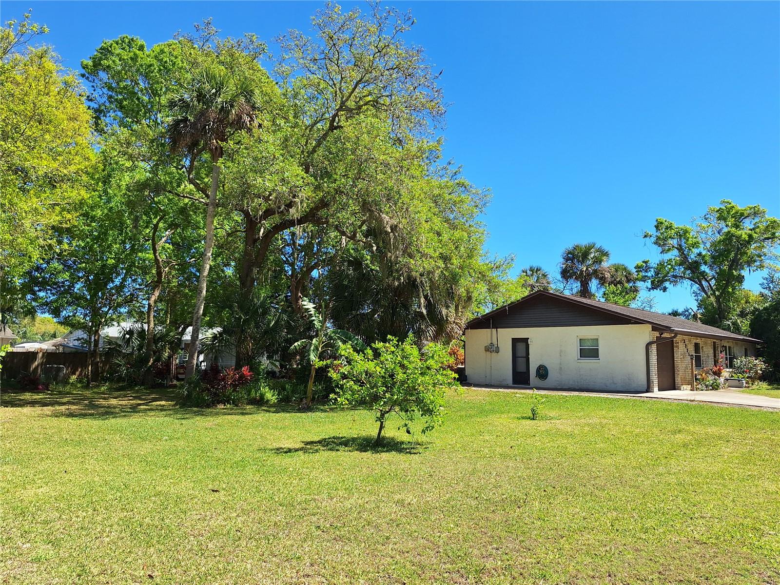 Welcome Home! Must see this 3BR 2BA single family home with 1 car garage, extra driveway space perfect for backing in your boat, camper, etc, fruit trees, 2 sheds (with electric), and BONUS, this property is sitting on lot measuring a total of 160' x 125' , which is just under a half acre! The possibilities are endless for the included lot to the North (home and extra lot are 1 parcel)! Solid concrete block home with brick front, Home features original charm and just a little touch up here & there, you could easily be moved right in. Galley kitchen with lots of counter space, roomy bedrooms, wood blinds, sliders off dining room to 11'x10' screened porch over looking a nicely landscaped back yard with little sitting area out back too. Newer garage door with opener and includes washer & dryer. Edgewater is nestled along the Indian River with fishing, kayaking and boating at your back door. About 4 miles to the closest boat ramp, just around corner from shopping, restaurants, skate park and more. Just under 10 miles to beautiful New Smyrna Beach beaches! Make this yours!