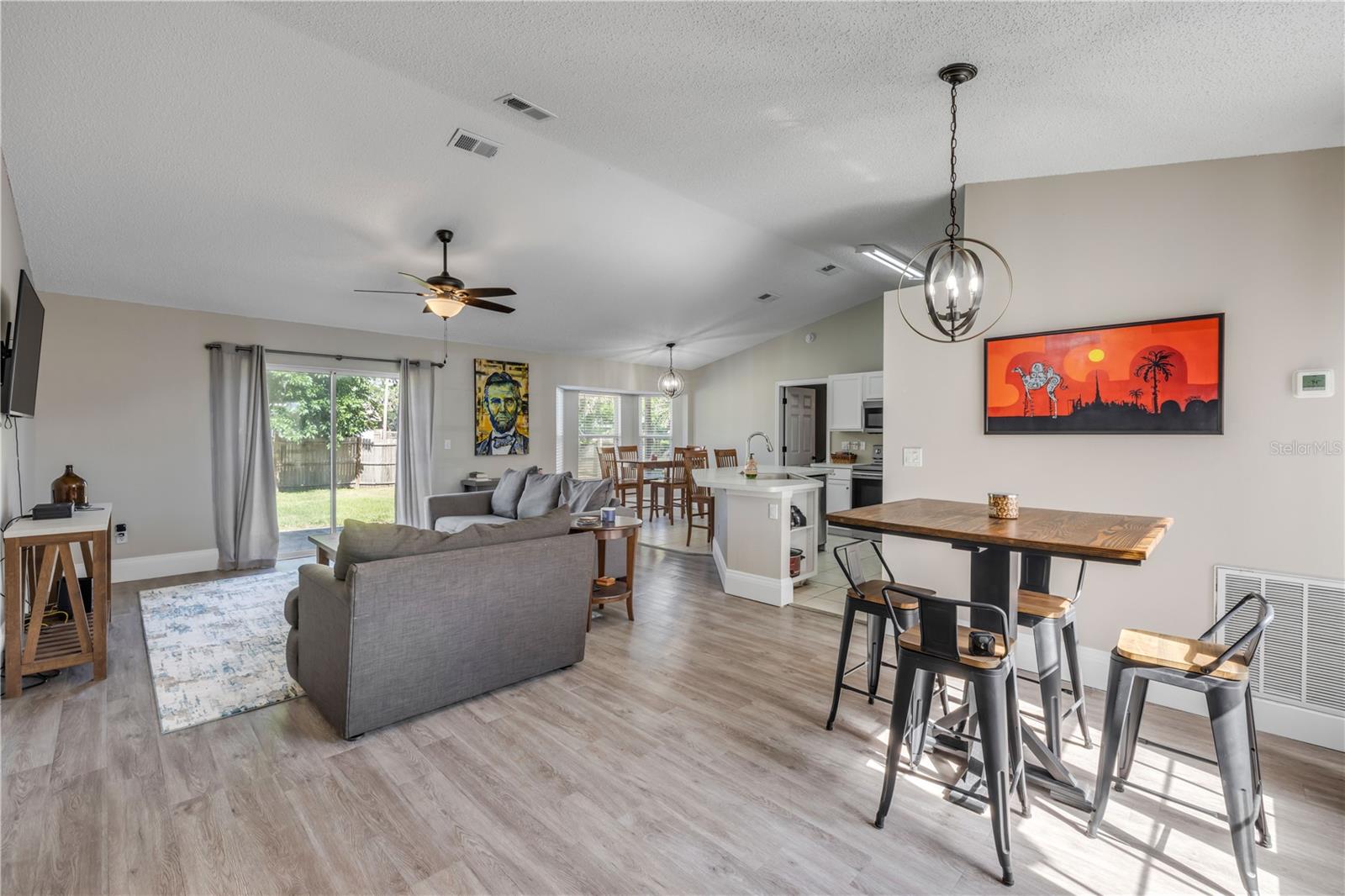 NO Flooding during Hurricane Milton. This beautifully updated 3-bedroom, 2-bathroom home is truly move-in ready. From the moment you arrive, you'll appreciate the fresh exterior and interior paint, spacious 2-car garage, and the warm, inviting feel created by vaulted ceilings and stylish LVP and tile flooring throughout. Major upgrades include a new roof (2024), tankless water heater, AC (2017). The heart of the home is the modern kitchen, complete with stainless steel appliances, island sink, and eat-in layout—perfect for entertaining or catching up on your favorite show while you cook. The open-concept, split floor plan provides space and privacy for everyone, making it ideal for families, guests, or working from home. The owner’s suite offers a peaceful retreat with a walk-in closet and a spa-inspired bath featuring a soaking tub, separate shower, and dual vanities. Step into the bright dining nook with its bay-style window that overlooks a fully fenced backyard- perfect for pets, play, or cozy evenings by the built-in fire pit. There’s even side parking space for your boat or outdoor toys! Whether you're relocating, downsizing, or buying your first home, this one checks all the boxes for style, function, and Florida comfort. Minor flooding may have occurred during Hurricane Ian. (Seller did not own home at that time)
