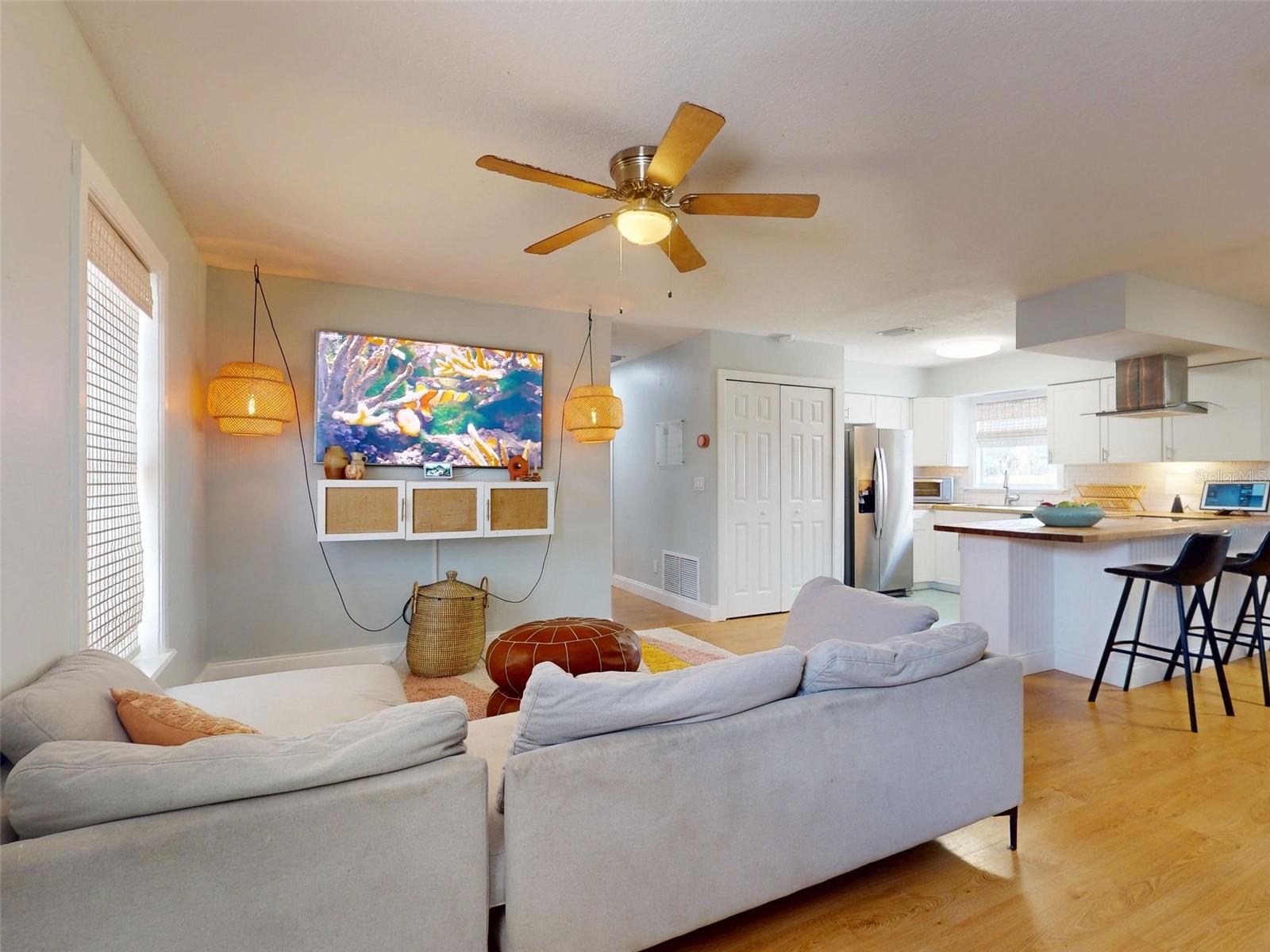 Welcome to this charming 4-bedroom, 2-bathroom home situated on an elevated lot in the heart of Florida Shores. This home has recently been well maintained and has some updates since the Sellers bought in 2021. The Roof(2018), A/C(2020), Water heater(2021), Car Port(2023), Barn Shed(2021) helps offering a peace of mind and a long-lasting value to the next owners. Once you step inside, you will find a bright and open living area and kitchen area which has ample counter space and seating at the bar, making it a delightful space to prepare meals and gather with loved ones. This split floorplan offers the Master Bedroom and Master Bathroom off to the right when you walk in the home. PLUS direct access to the fully enclosed and added on Florida room(2022) straight ahead when you enter the home. This versatile space features additional living or entertaining space year-round. Outside, the huge fenced in backyard features a firepit area just added(5/25) and a spacious barn shed(2021) with plenty of room for storage. The outside back yard has ample room for outdoor activities, family and friends gathering for a BBQ, gardening, or simply enjoying the Florida sunshine. With it's elevated lot, this home was never affected by any of the previous hurricanes and no flooding issues which is a HUGE added bonus. This beautiful home offers added privacy and a serene setting outside. Located in Edgewater, this home is perfect for those who enjoy a laid-back lifestyle with convenient access to local amenities. The River is just minutes away, offering boating, fishing, and water sports, while the beaches of New Smyrna Beach are a short drive for those who crave sun, surf, shopping and all the wonderful restaurants New Smyrna Beach provides. Don’t miss this opportunity to own a beautifully maintained home located just minutes from the beach! The Sellers are willing to negotiate to include all furniture and TV's! Schedule your private tour today! *All Buyers Agents please verify all measurements!