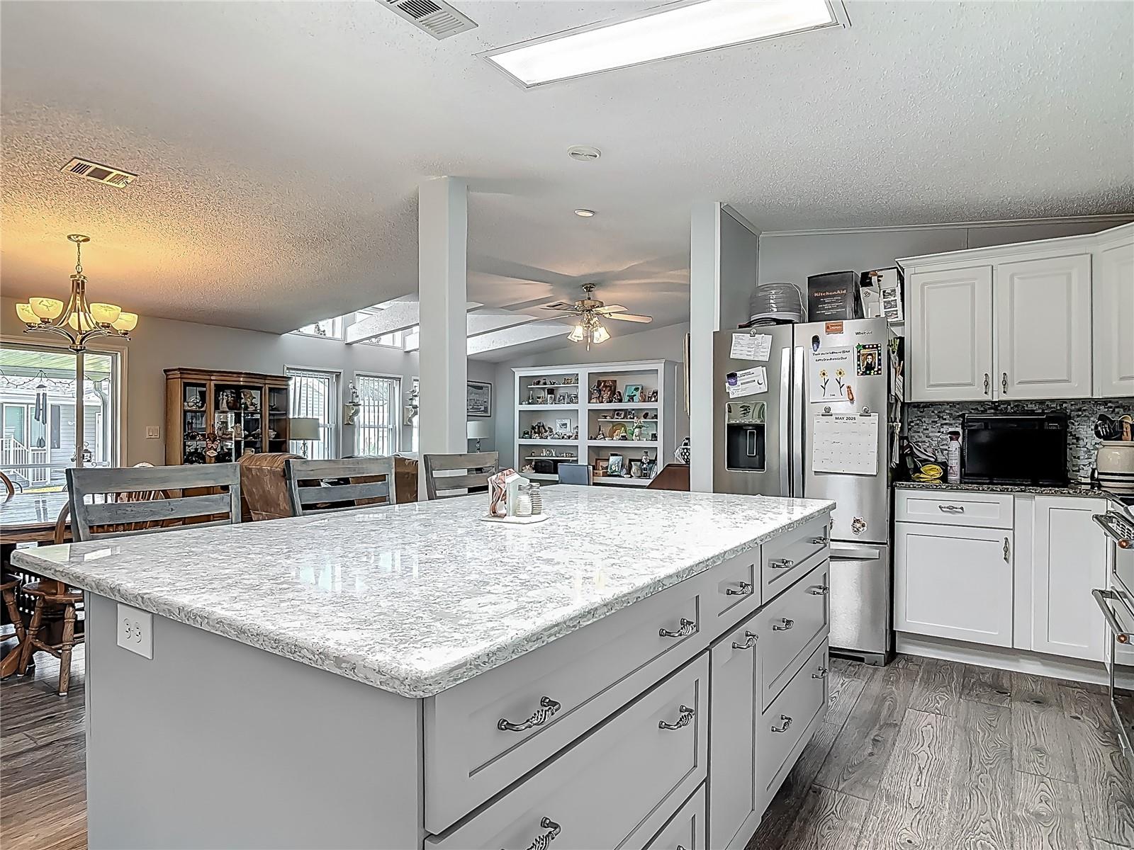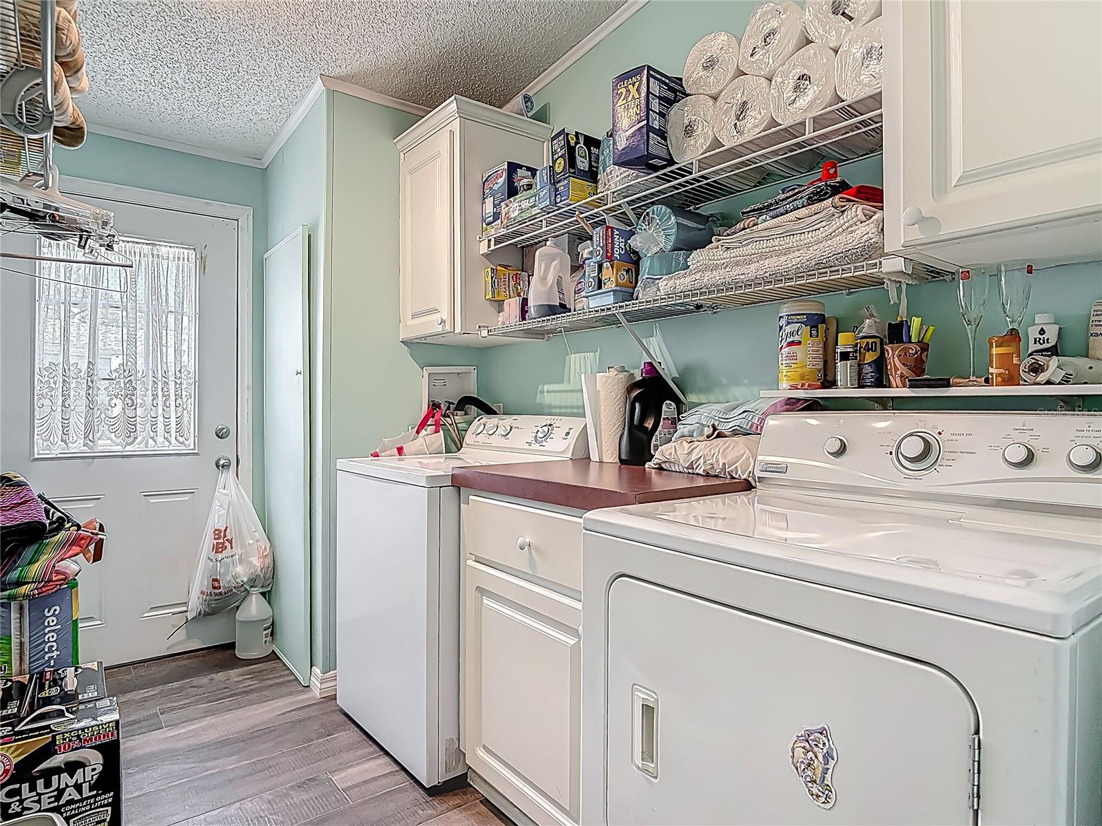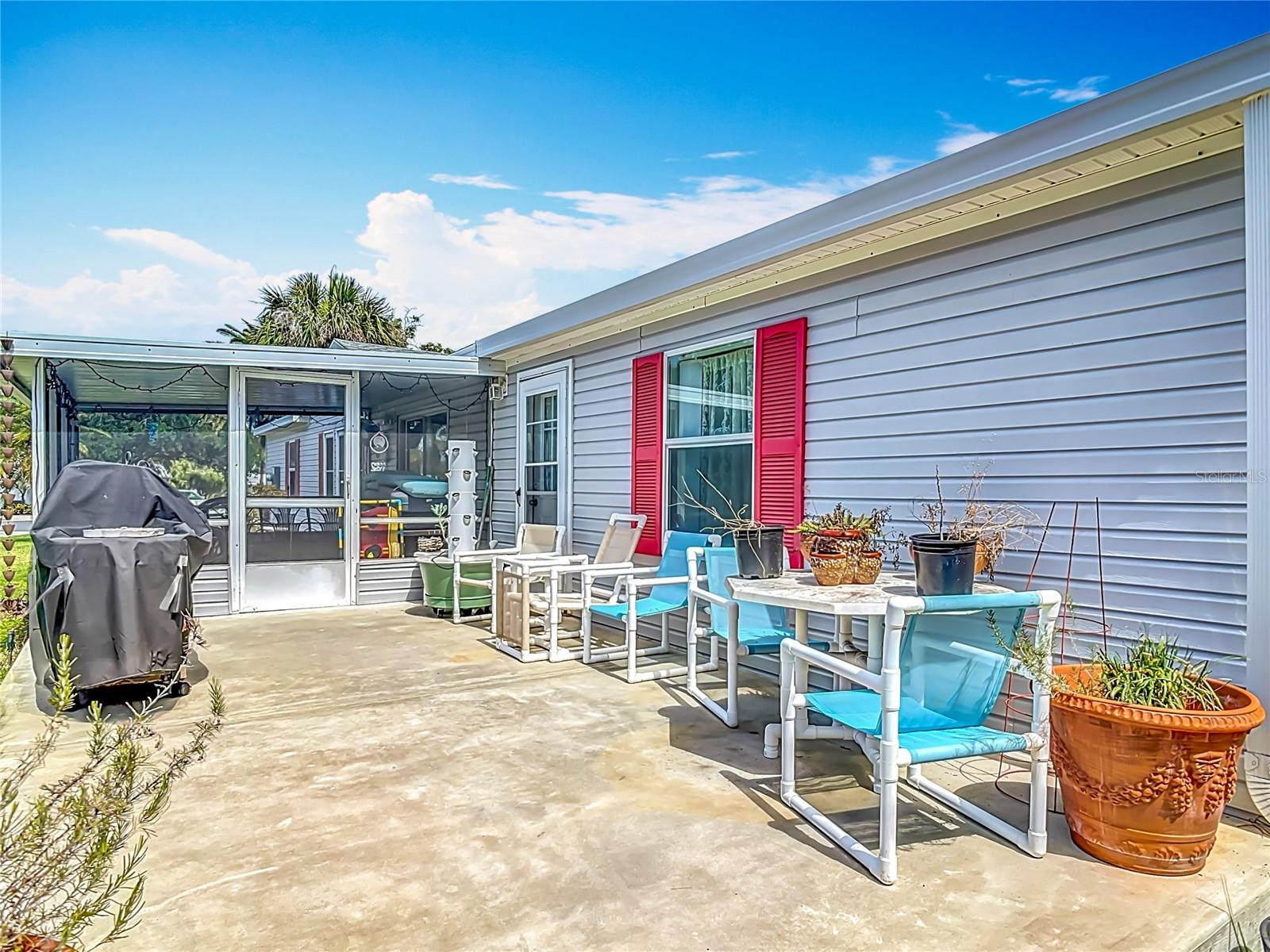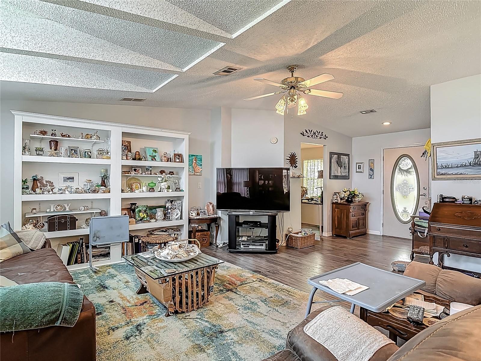 Welcome to this charming 3-bedroom, 2-bathroom home, perfectly nestled just off a peaceful cul-de-sac. From the moment you step inside, you'll love the spacious, open layout featuring a gourmet kitchen with sleek quartz countertops, a convenient eat-in dining area, pergo floors and plenty of room to gather and entertain. The split-bedroom floor plan offers privacy for guests or family, while sliding glass doors lead to your private patio and sun deck—ideal for grilling, relaxing, and enjoying spectacular sunrises and sunsets. Outside, you'll find a great bonus: a stylish shed for extra storage—perfect for tools, toys, or hobby gear. Located in a very active and vibrant community, you'll have access to a wide array of amenities including a heated pool, spa, exercise room, , shuffleboard , horseshoes tennis courts, pickle ball, bocce, bingo nights, boat and Rv storage when available. Best of all, you own your land, and the low quarterly HOA fee includes both internet and cable—giving you the perfect balance of affordability and lifestyle. Don't miss your opportunity to live in a home that has it all—comfort, community, and convenience!