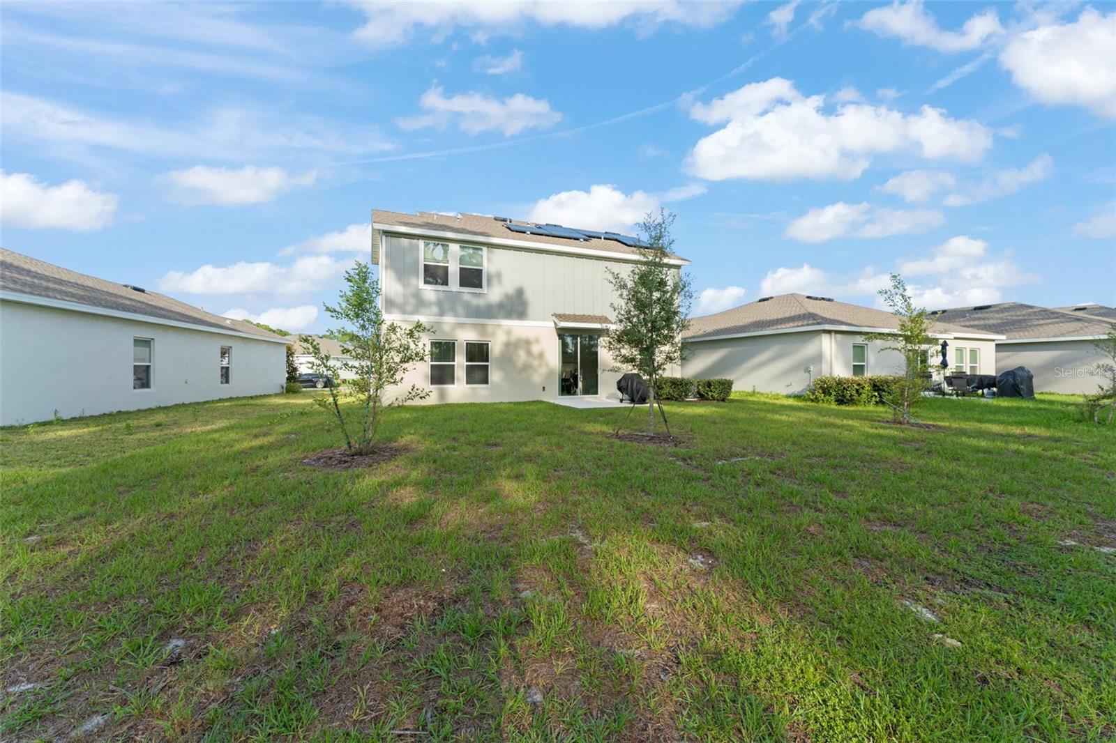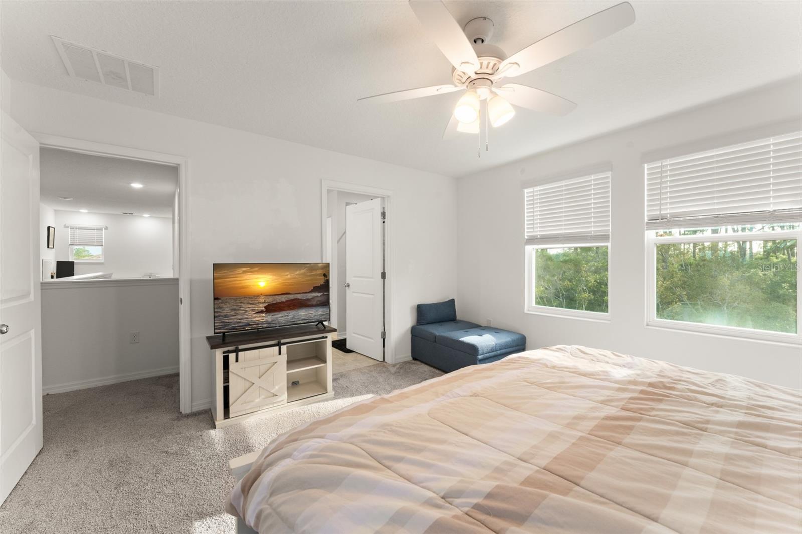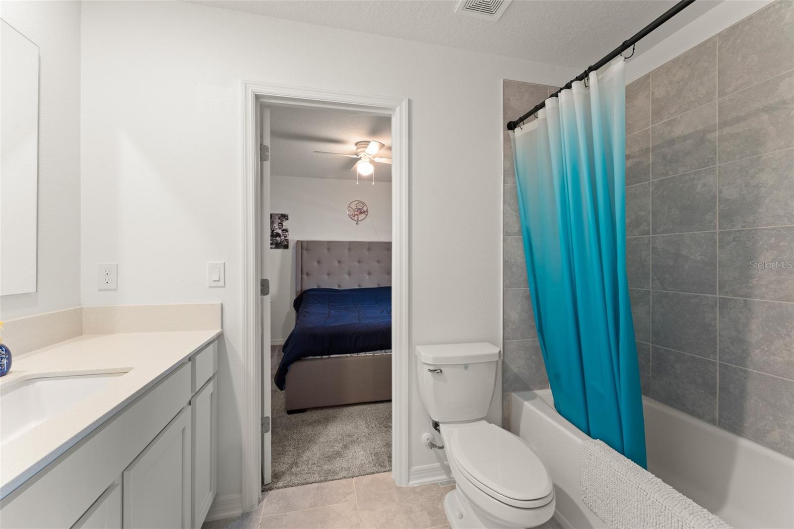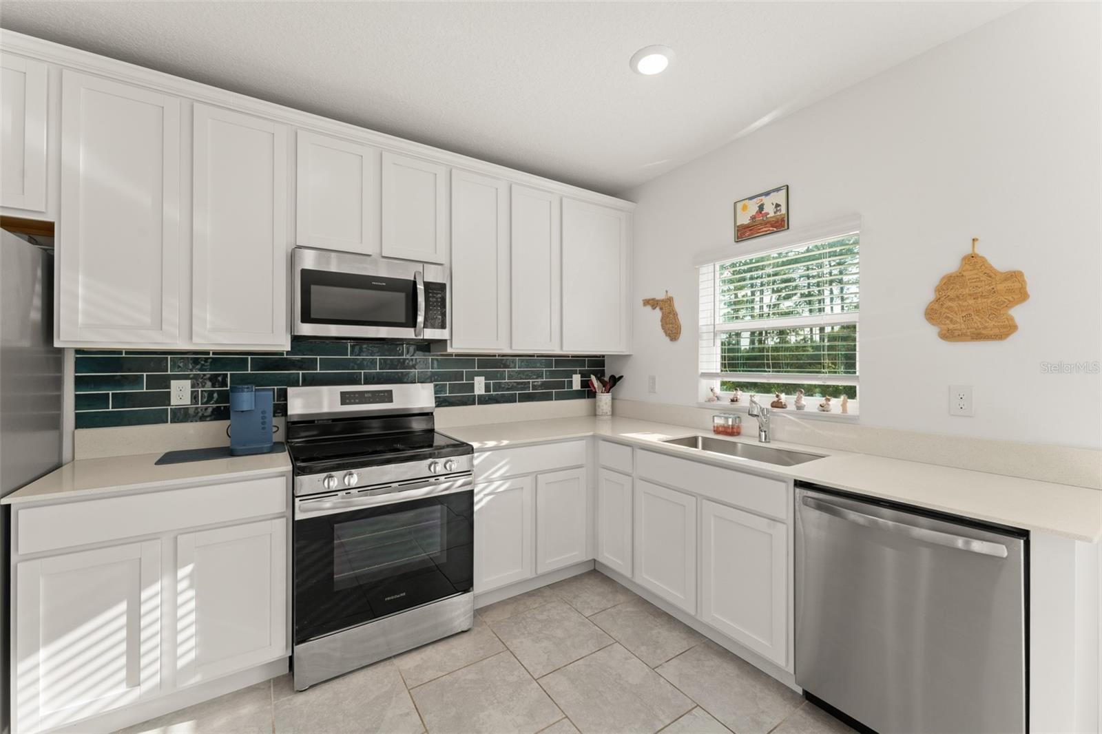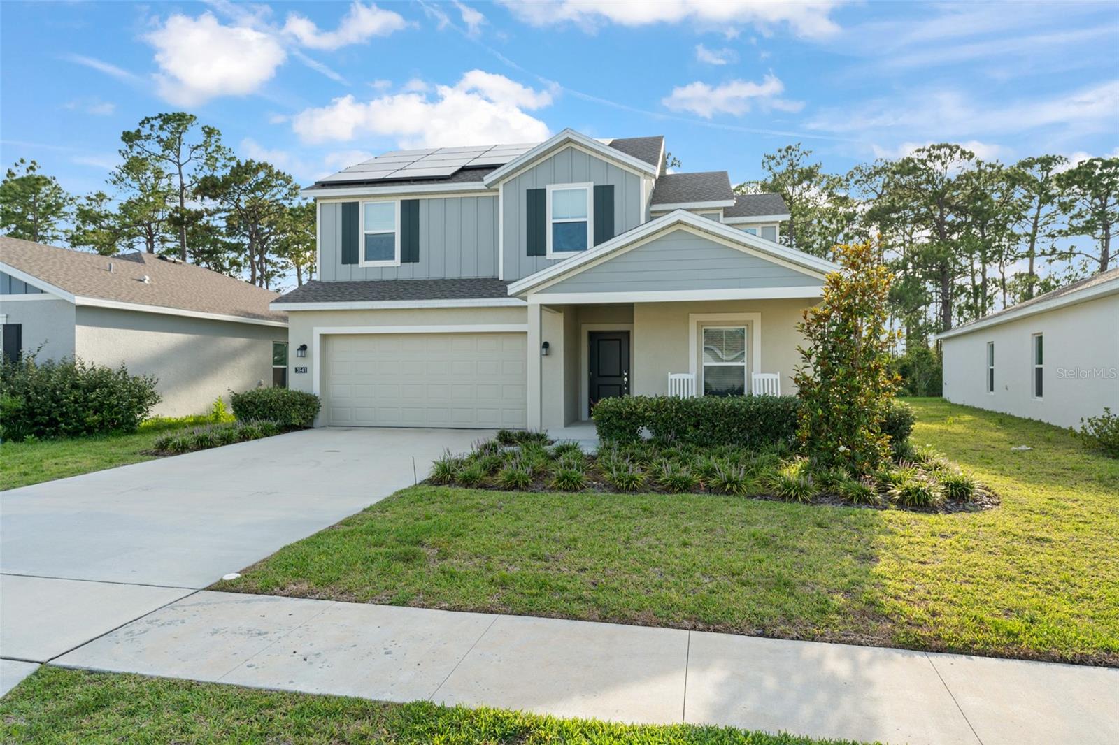 **This home qualifies for lending with NO DOWN PAYMENT required, 100% financing available. ** Welcome to an inviting 4-bedroom, 3-bathroom single-family home nestled in the peaceful community of Edgewater. From the moment you arrive, you’ll be greeted by a beautifully landscaped front yard and a welcoming two-car garage. The front porch, with space for two rocking chairs, is the perfect spot to relax and soak in the tranquil surroundings. Step inside and take in a sneak peek of the bright and airy living room just down the hall. To your right, you'll find a cozy first-floor bedroom with a built-in closet, ideal for guests or a home office, along with a nearby full bathroom featuring a bathtub. As you continue through the home, access to the garage is conveniently located on the left. The living room, with windows overlooking the lush backyard, flows effortlessly into the galley-style dining area and open-concept kitchen. The kitchen features crisp white cabinetry, stone countertops, a vibrant tile backsplash, and stainless steel appliances—perfect for both everyday living and entertaining. A sliding glass door off the dining area opens to a patio and offers beautiful views of the greenery beyond. Upstairs, a versatile loft area has been thoughtfully modified with a built-in counter—ideal as a desk or workspace. Two additional bedrooms feature built-in closets and share a Jack-and-Jill bathroom with stylish cabinetry and a tub. The laundry room is conveniently located between the third bedroom and the primary suite, complete with a modern bottom-loading washer and dryer and built-in shelving for easy organization. The primary bedroom is a sunlit retreat with multiple windows and a spacious en suite bathroom featuring dual sinks, matching white cabinetry, and a luxurious walk-in shower with floor-to-ceiling tile. The walk-in closet includes wrap-around built-in shelving to keep everything in its place. Step out back and enjoy a blank canvas backyard—a perfect setting for your dream outdoor living space, framed by mature vegetation for privacy and natural beauty. Don’t miss your chance to own this thoughtfully designed home that blends comfort, style, and functionality. Schedule your showing today!